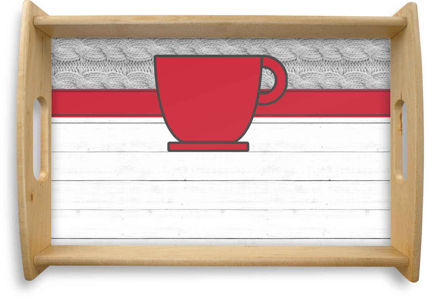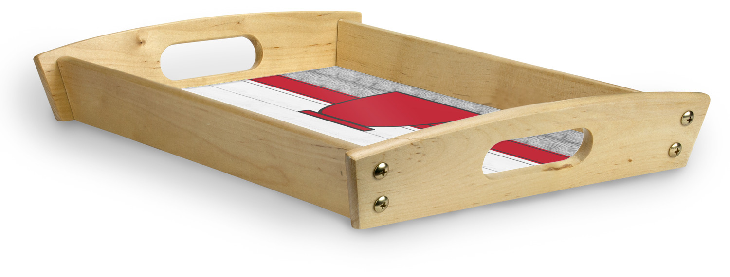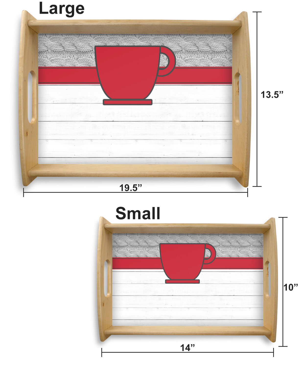 This serving tray with handles features square edges and two rounded sides, creating a very modern look. Each side is fabricated from a beautifully cut, natural wood. The bottom of the interior of the tray displays your customized design in bright, vibrant color. The tray is sold in both a black color and a natural wood look. Each variation of the wood serving tray has two sizes: Small, which is 14" x 10" x 2.25", and Large, which is 19.5" x 13.5" x 2.75".