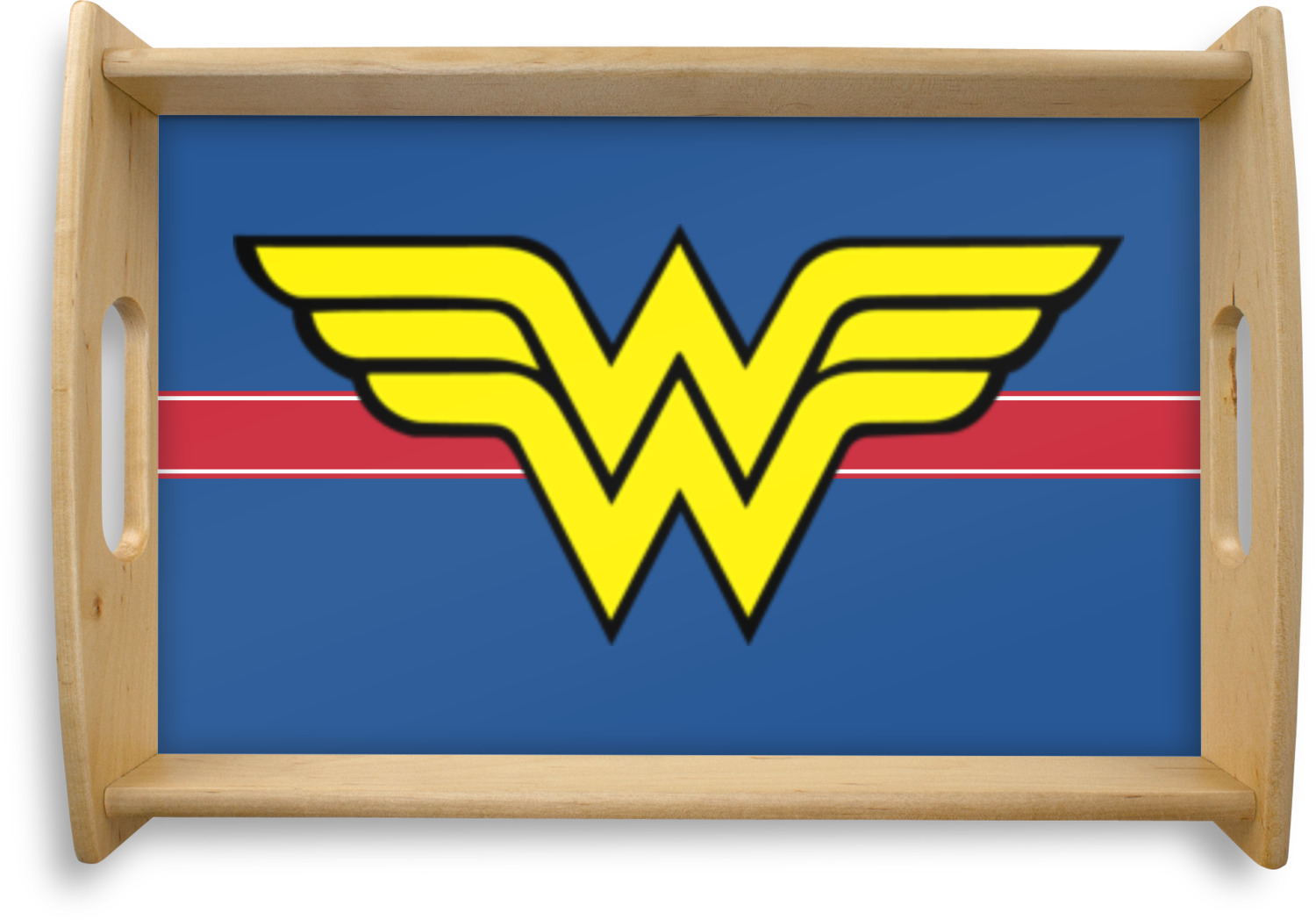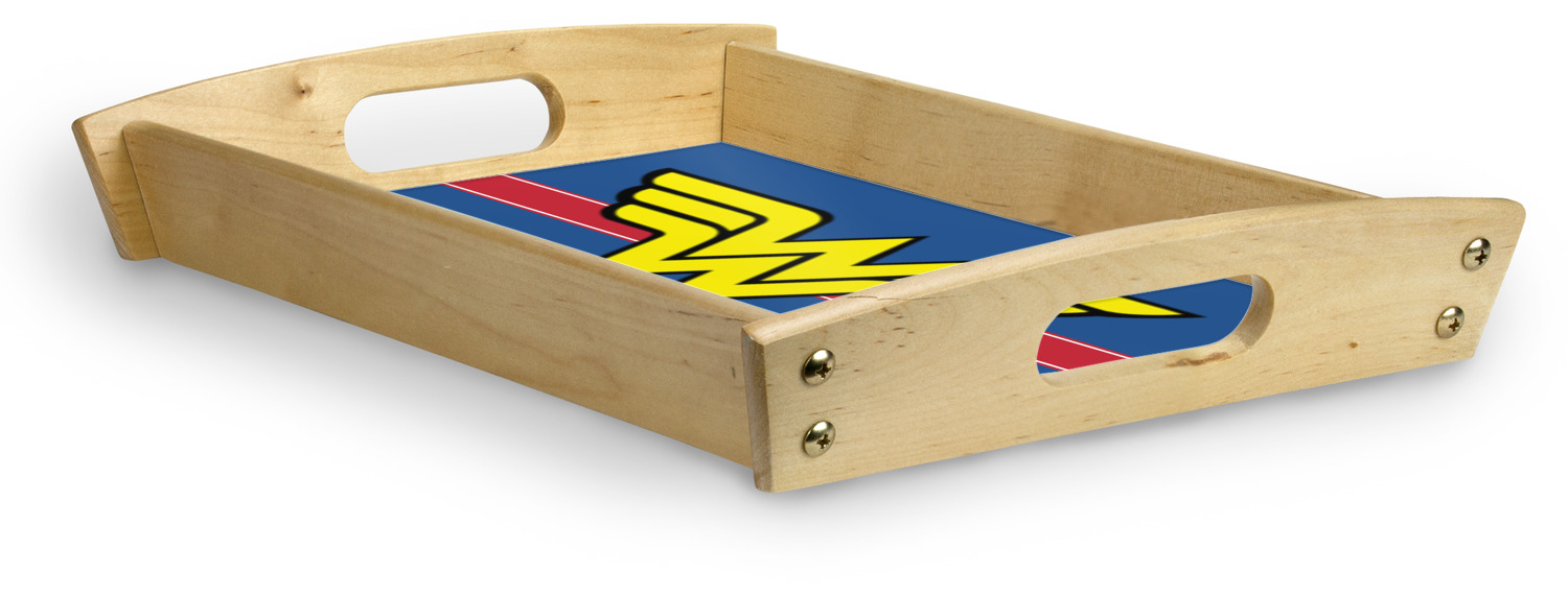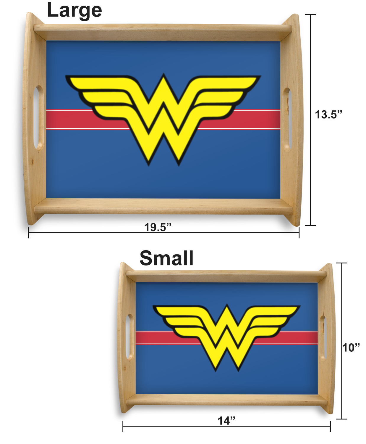 This serving tray with handles features square edges and two rounded sides, creating a very modern look. Each side is fabricated from a beautifully cut, natural wood. The bottom of the interior of the tray displays your customized design in bright, vibrant color. The tray is sold in both a black color and a natural wood look. Each variation of the wood serving tray has two sizes: Small, which is 14" x 10" x 2.25", and Large, which is 19.5" x 13.5" x 2.75".