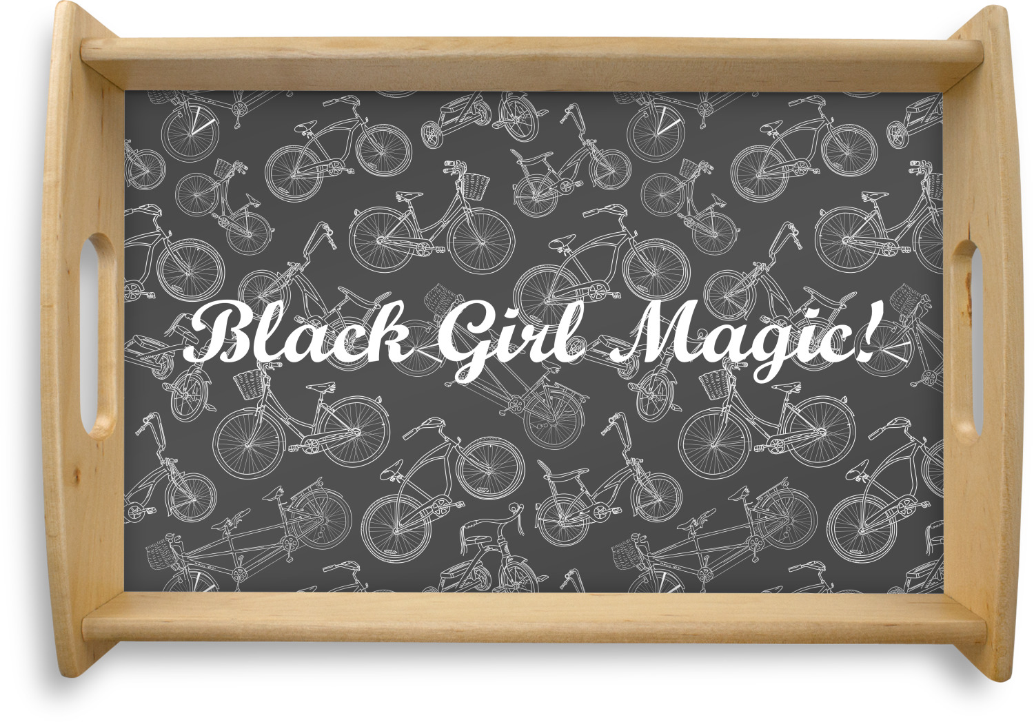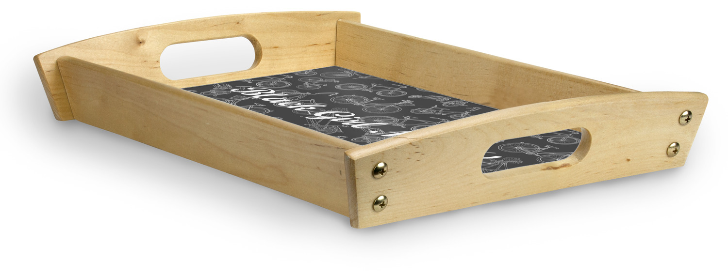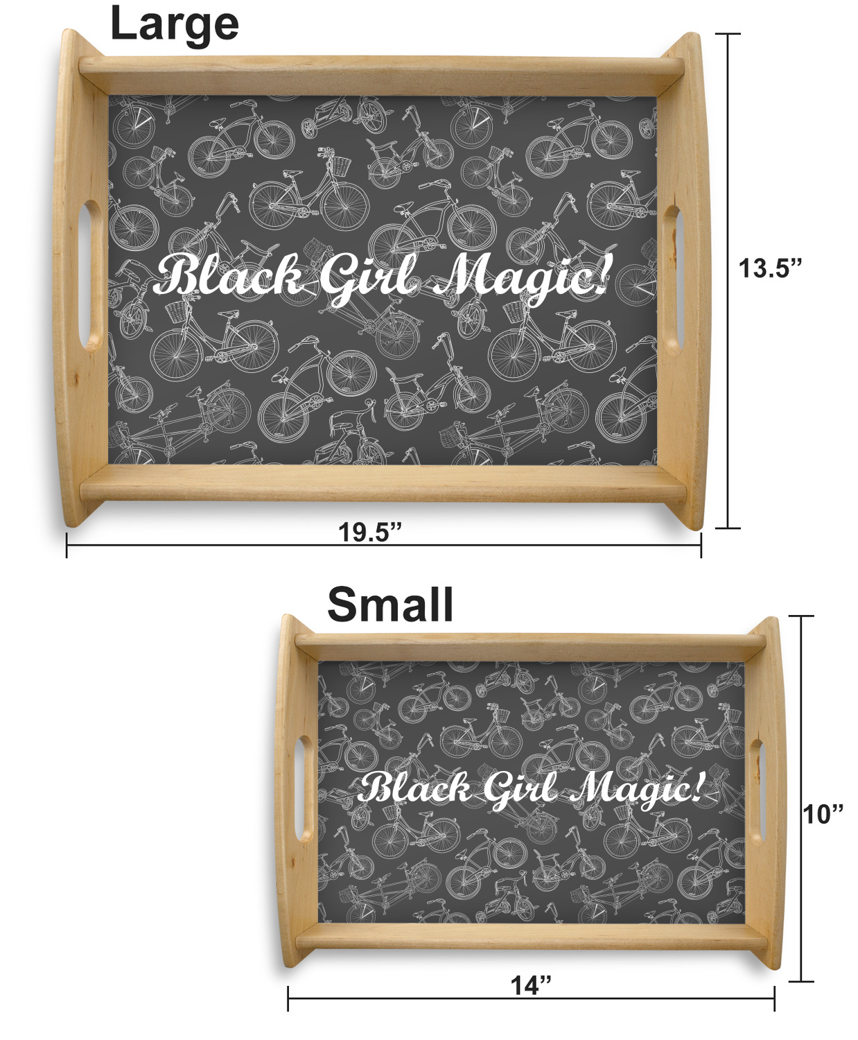 This serving tray with handles features square edges and two rounded sides, creating a very modern look. Each side is fabricated from a beautifully cut, natural wood. The bottom of the interior of the tray displays your customized design in bright, vibrant color. The tray is sold in both a black color and a natural wood look. Each variation of the wood serving tray has two sizes: Small, which is 14" x 10" x 2.25", and Large, which is 19.5" x 13.5" x 2.75".