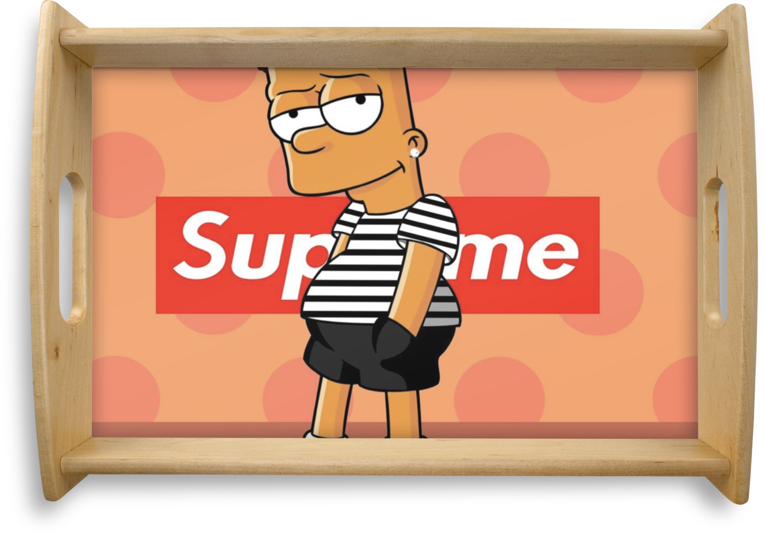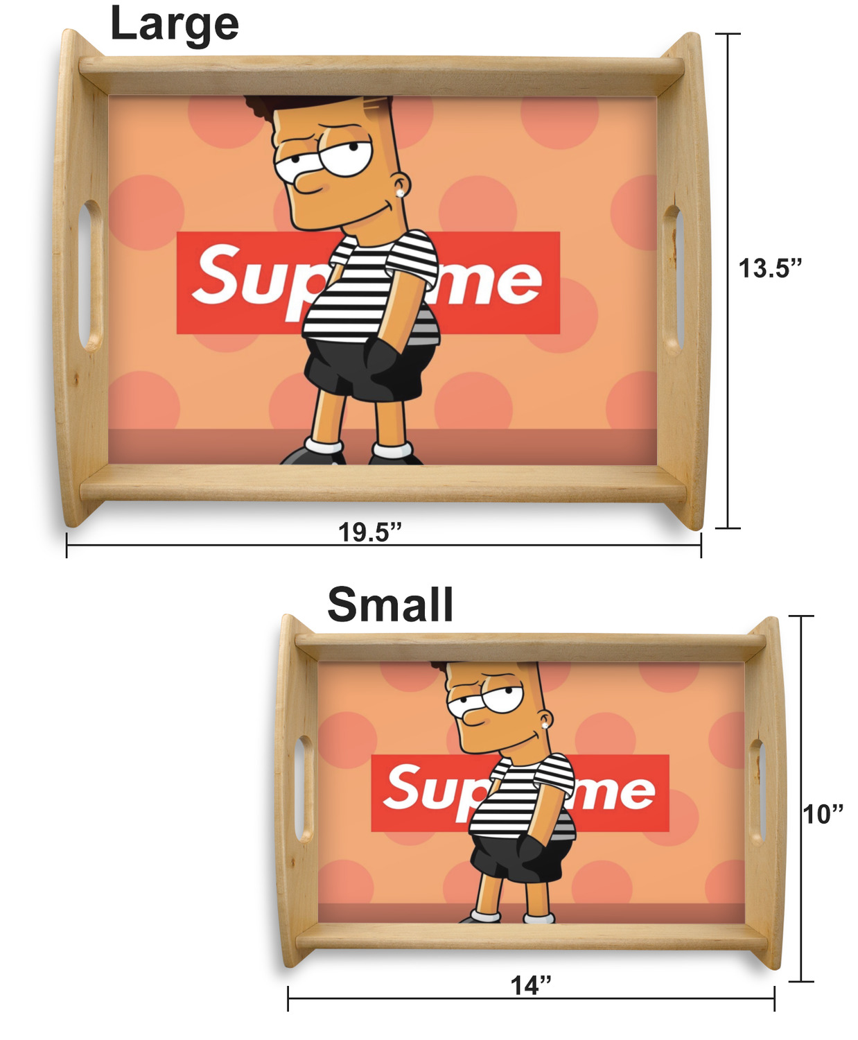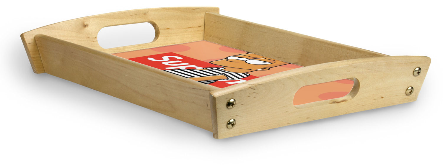 This serving tray with handles features square edges and two rounded sides, creating a very modern look. Each side is fabricated from a beautifully cut, natural wood. The bottom of the interior of the tray displays your customized design in bright, vibrant color. The tray is sold in both a black color and a natural wood look. Each variation of the wood serving tray has two sizes: Small, which is 14" x 10" x 2.25", and Large, which is 19.5" x 13.5" x 2.75".
