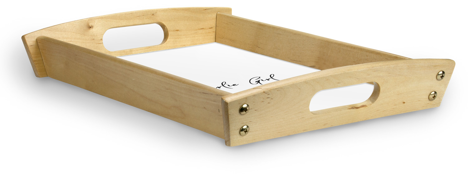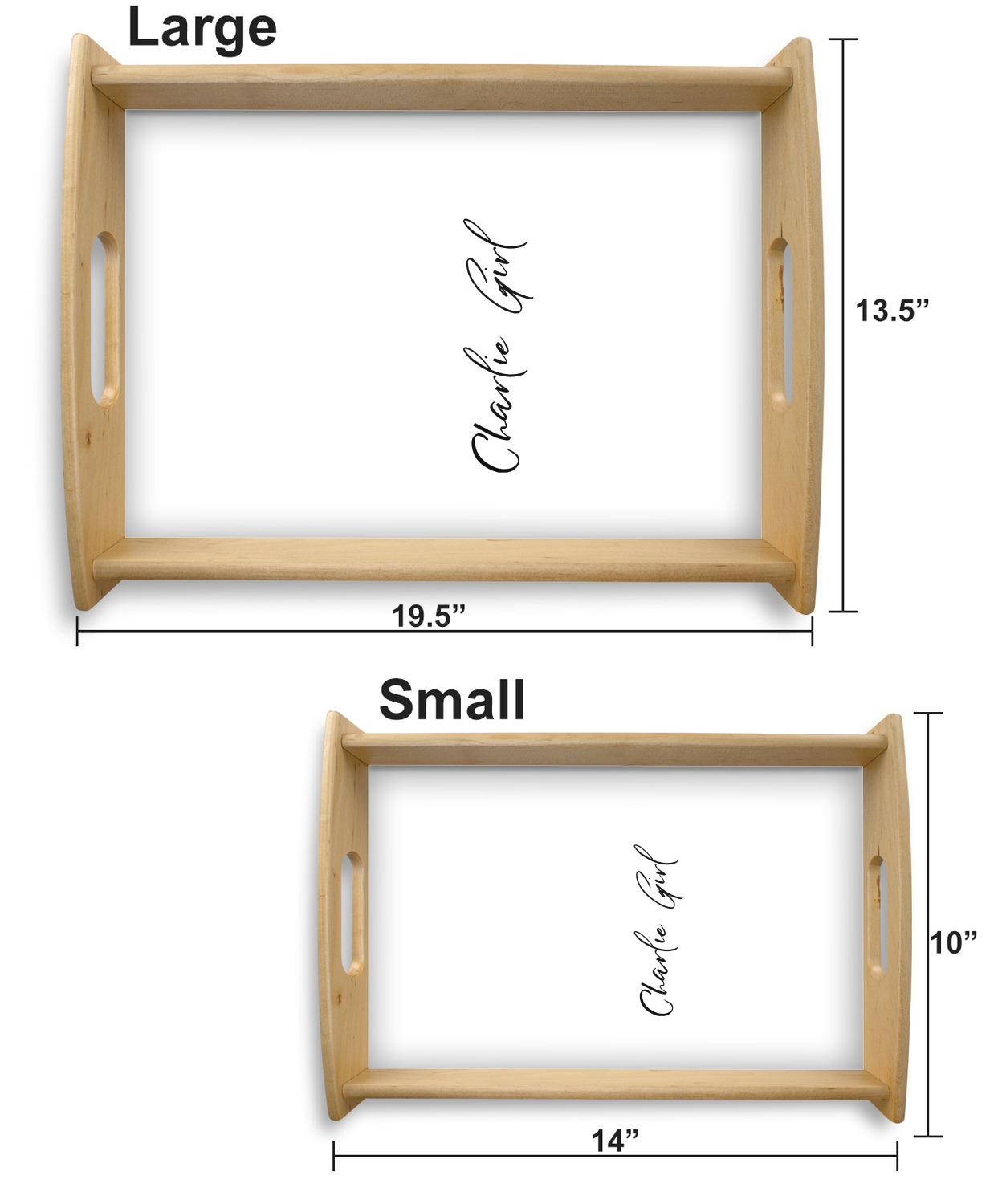 This serving tray with handles features square edges and two rounded sides, creating a very modern look. Each side is fabricated from a beautifully cut, natural wood. The bottom of the interior of the tray displays your customized design in bright, vibrant color. The tray is sold in both a black color and a natural wood look. Each variation of the wood serving tray has two sizes: Small, which is 14" x 10" x 2.25", and Large, which is 19.5" x 13.5" x 2.75".