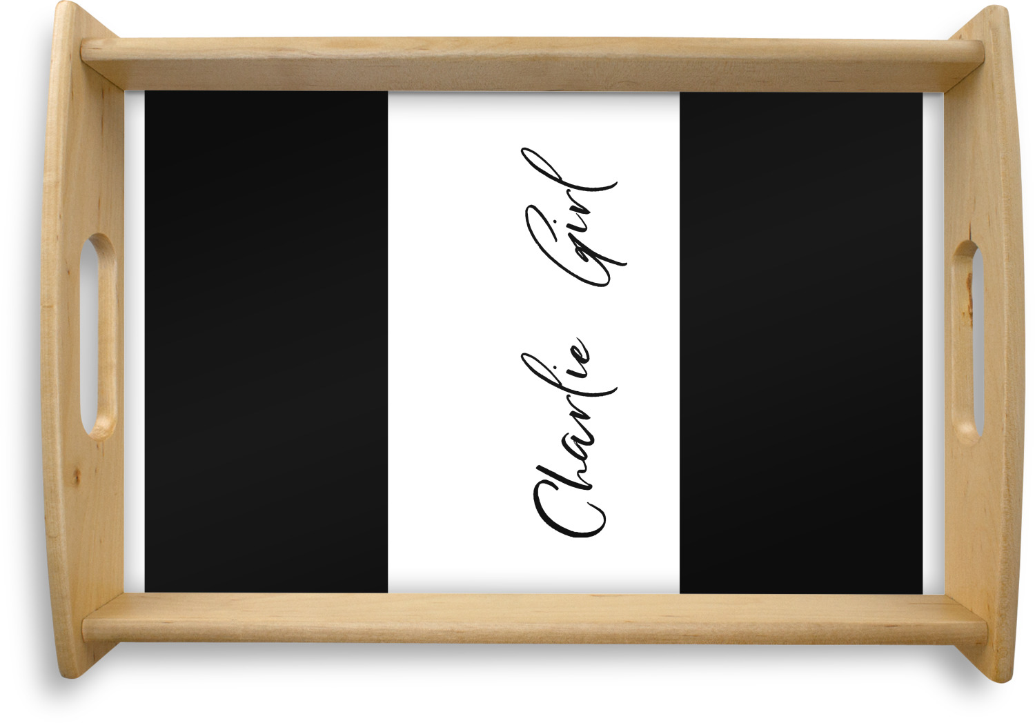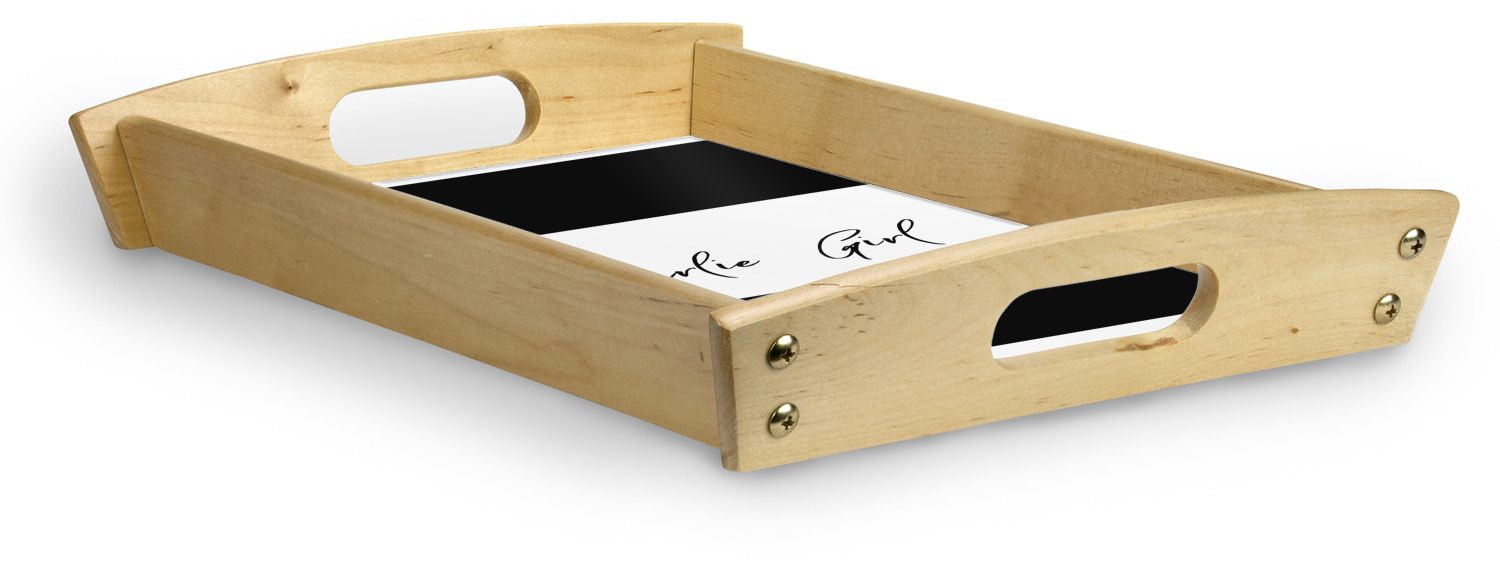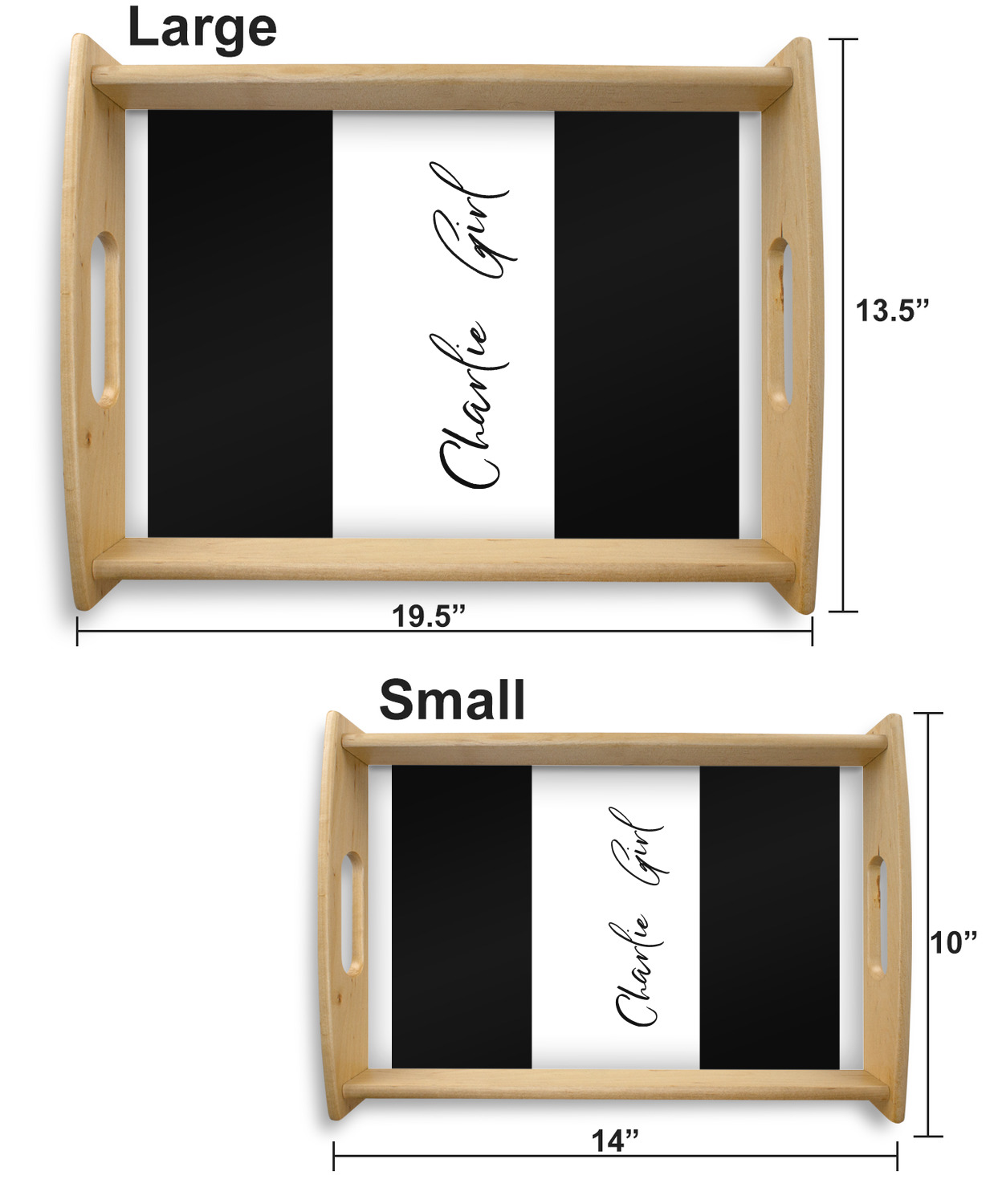 This serving tray with handles features square edges and two rounded sides, creating a very modern look. Each side is fabricated from a beautifully cut, natural wood. The bottom of the interior of the tray displays your customized design in bright, vibrant color. The tray is sold in both a black color and a natural wood look. Each variation of the wood serving tray has two sizes: Small, which is 14" x 10" x 2.25", and Large, which is 19.5" x 13.5" x 2.75".