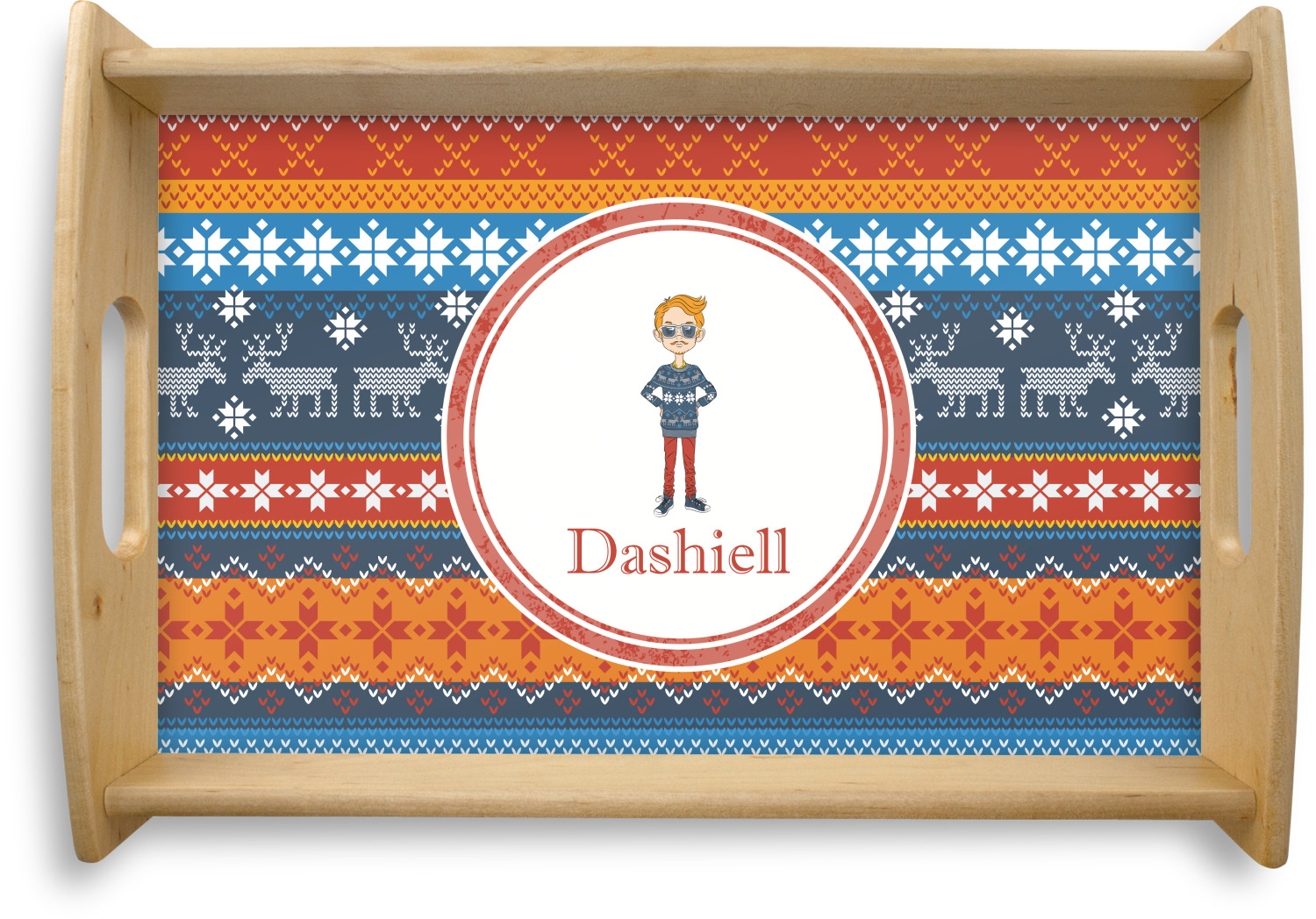This serving tray with handles features square edges and two rounded sides, creating a very modern look. Each side is fabricated from a beautifully cut, natural wood. The bottom of the interior of the tray displays your customized design in bright, vibrant color. The tray is sold in both a black color and a natural wood look. Each variation of the wood serving tray has two sizes: Small, which is 14" x 10" x 2.25", and Large, which is 19.5" x 13.5" x 2.75".