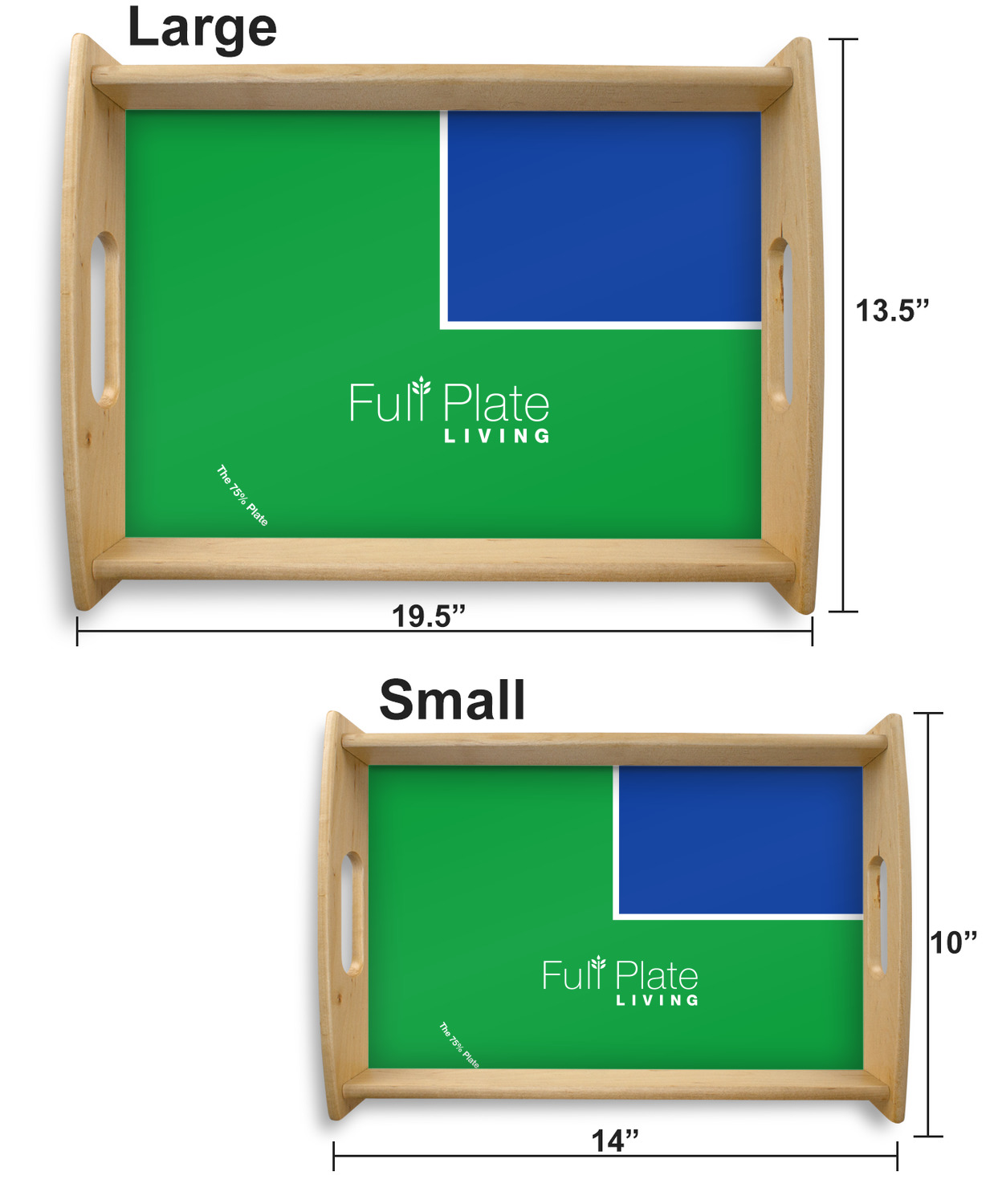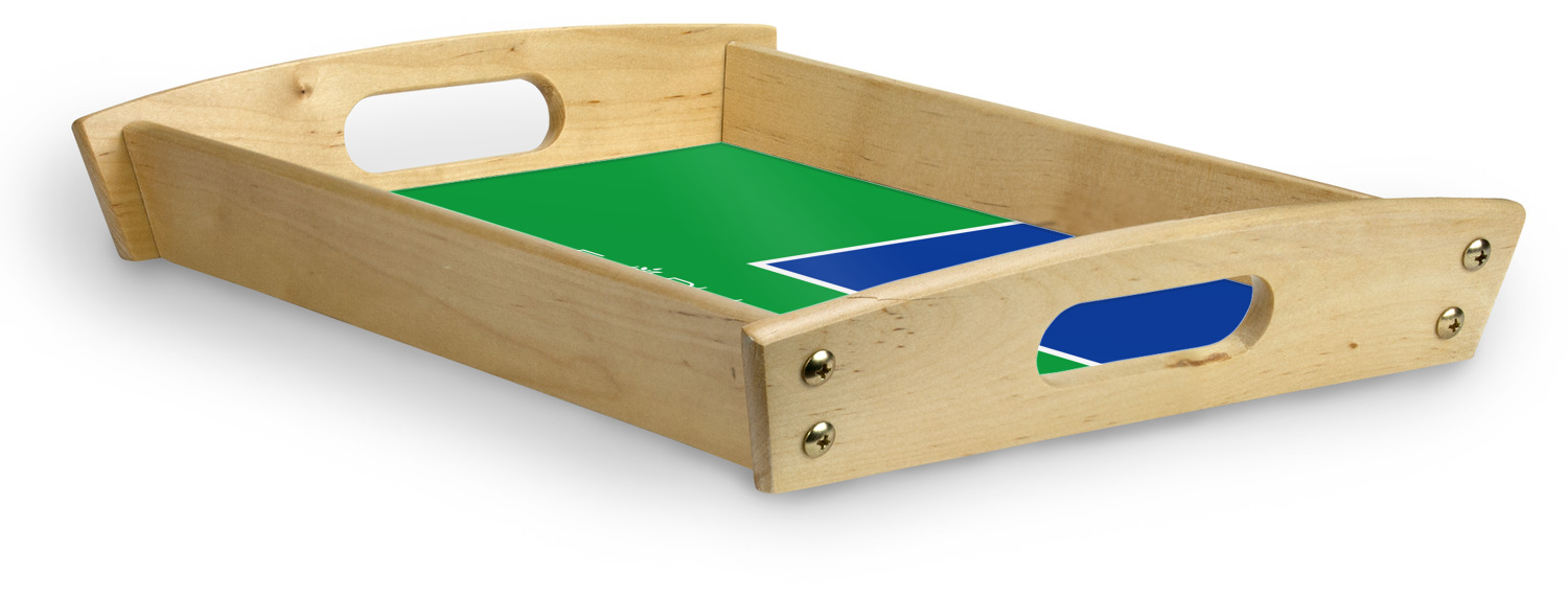 This serving tray with handles features square edges and two rounded sides, creating a very modern look. Each side is fabricated from a beautifully cut, natural wood. The bottom of the interior of the tray displays your customized design in bright, vibrant color. The tray is sold in both a black color and a natural wood look. Each variation of the wood serving tray has two sizes: Small, which is 14" x 10" x 2.25", and Large, which is 19.5" x 13.5" x 2.75".
