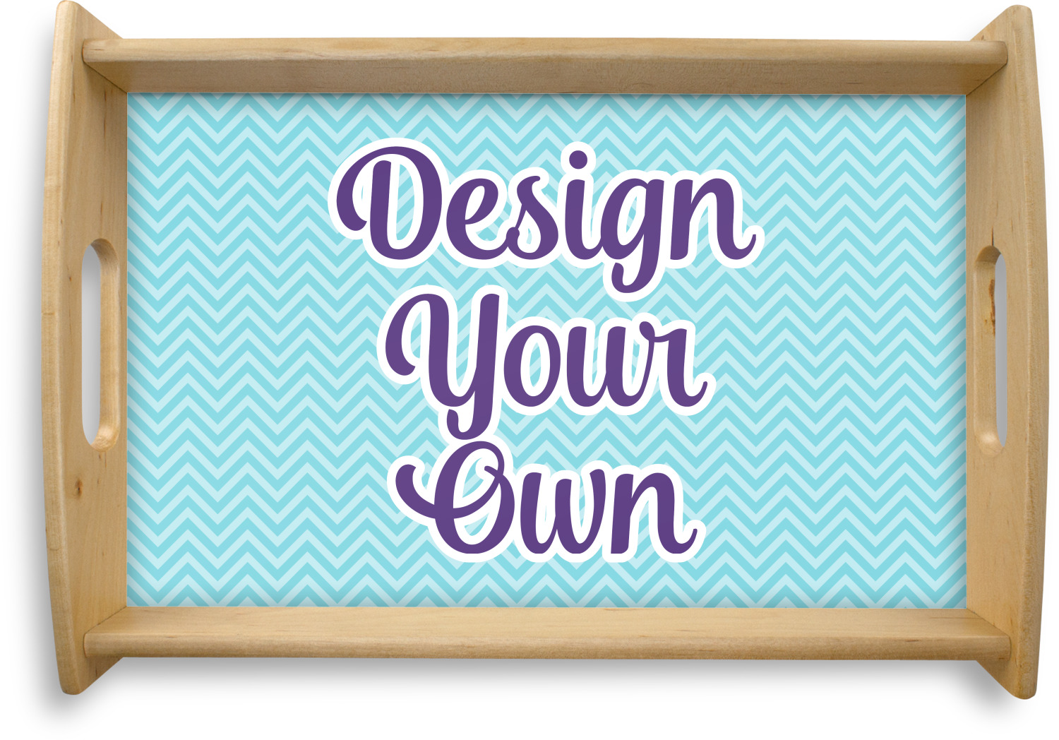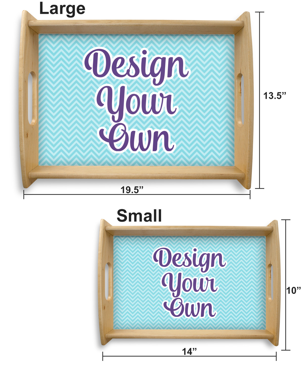 This serving tray with handles features square edges and two rounded sides, creating a very modern look. Each side is fabricated from a beautifully cut, natural wood. The bottom of the interior of the tray displays your customized design in bright, vibrant color. The tray is sold in both a black color and a natural wood look. Each variation of the wood serving tray has two sizes: Small, which is 14" x 10" x 2.25", and Large, which is 19.5" x 13.5" x 2.75".