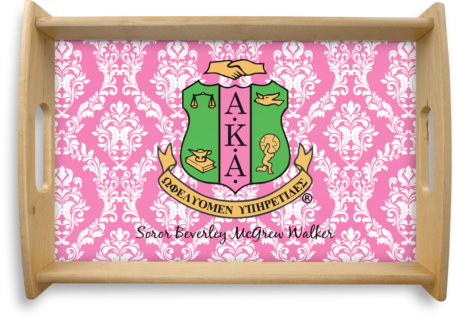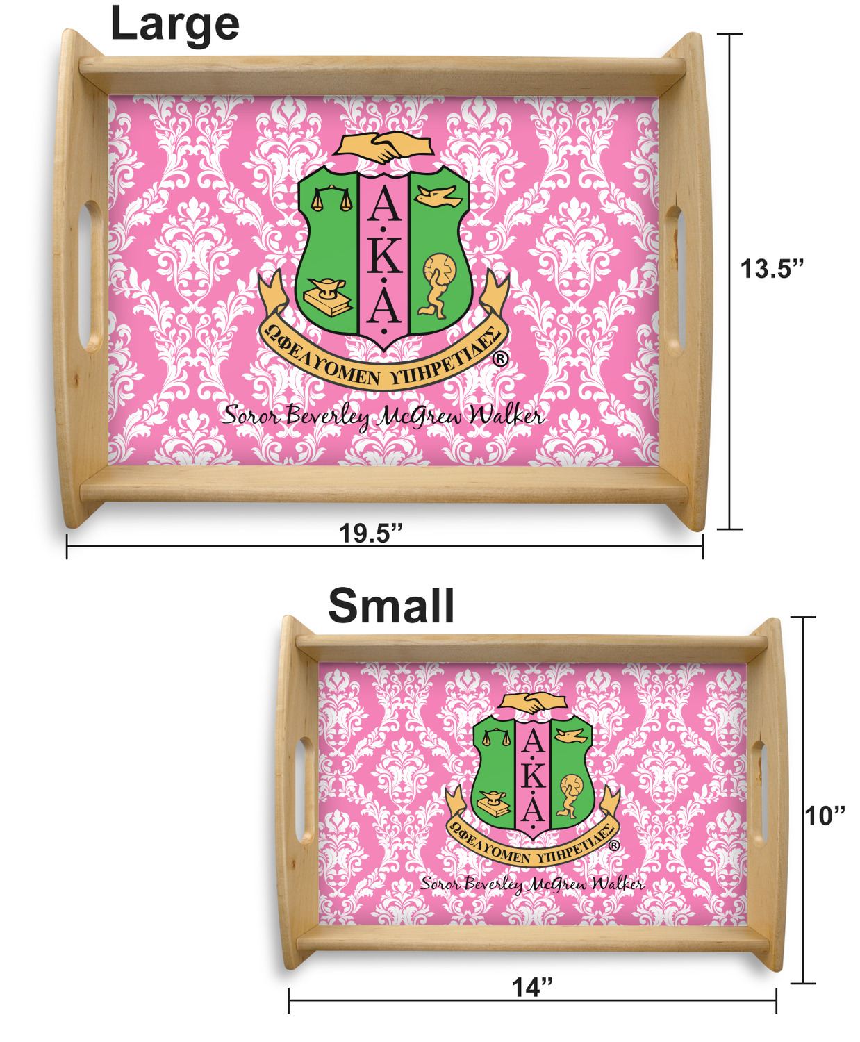 This serving tray with handles features square edges and two rounded sides, creating a very modern look. Each side is fabricated from a beautifully cut, natural wood. The bottom of the interior of the tray displays your customized design in bright, vibrant color. The tray is sold in both a black color and a natural wood look. Each variation of the wood serving tray has two sizes: Small, which is 14" x 10" x 2.25", and Large, which is 19.5" x 13.5" x 2.75".
