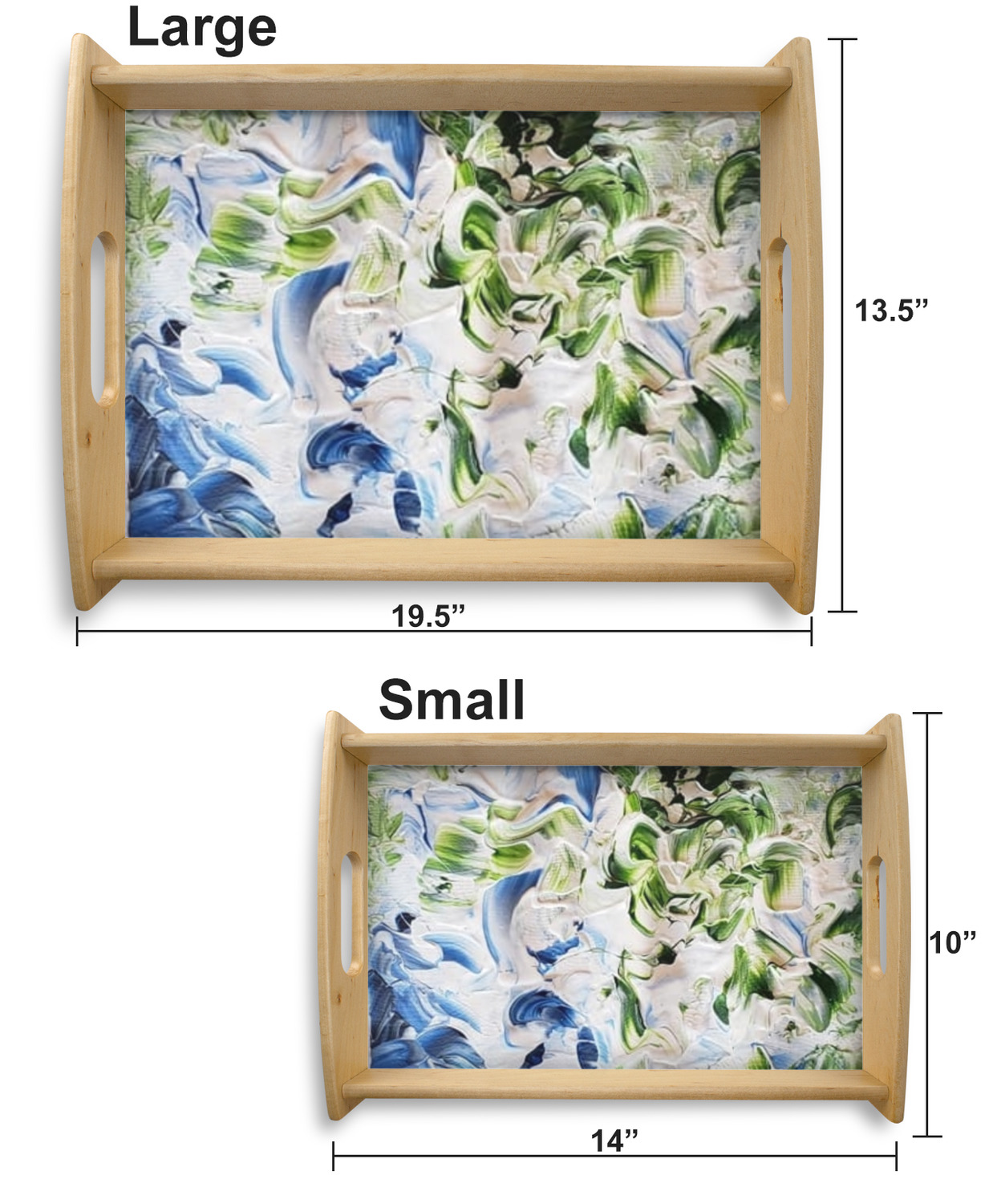 This serving tray with handles features square edges and two rounded sides, creating a very modern look. Each side is fabricated from a beautifully cut, natural wood. The bottom of the interior of the tray displays your customized design in bright, vibrant color. The tray is sold in both a black color and a natural wood look. Each variation of the wood serving tray has two sizes: Small, which is 14" x 10" x 2.25", and Large, which is 19.5" x 13.5" x 2.75".