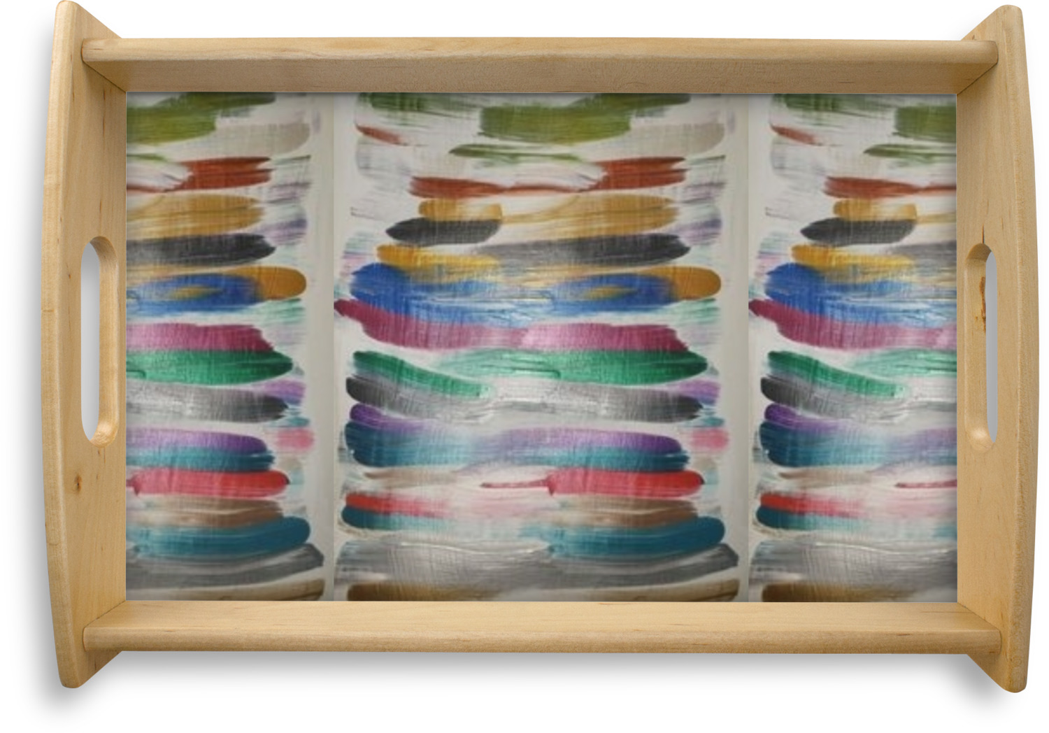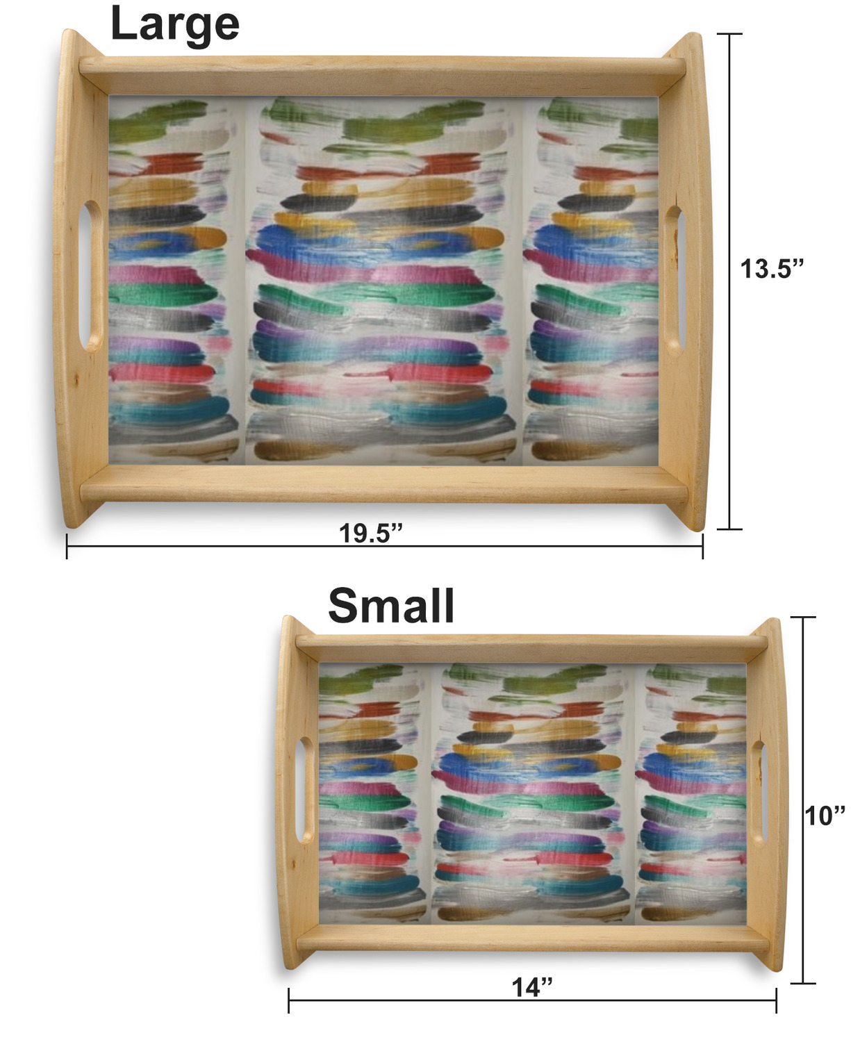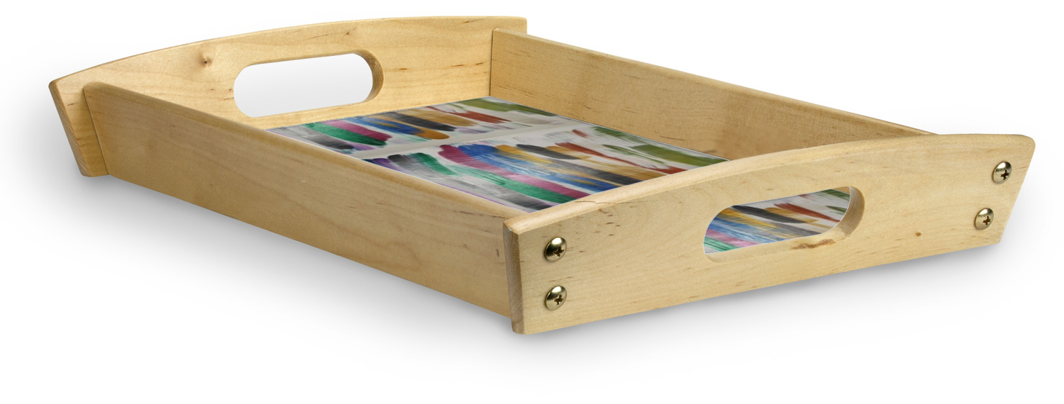 This serving tray with handles features square edges and two rounded sides, creating a very modern look. Each side is fabricated from a beautifully cut, natural wood. The bottom of the interior of the tray displays your customized design in bright, vibrant color. The tray is sold in both a black color and a natural wood look. Each variation of the wood serving tray has two sizes: Small, which is 14" x 10" x 2.25", and Large, which is 19.5" x 13.5" x 2.75".