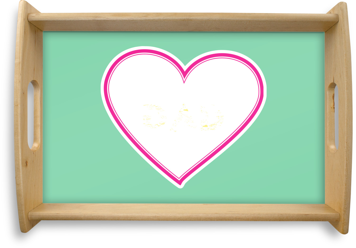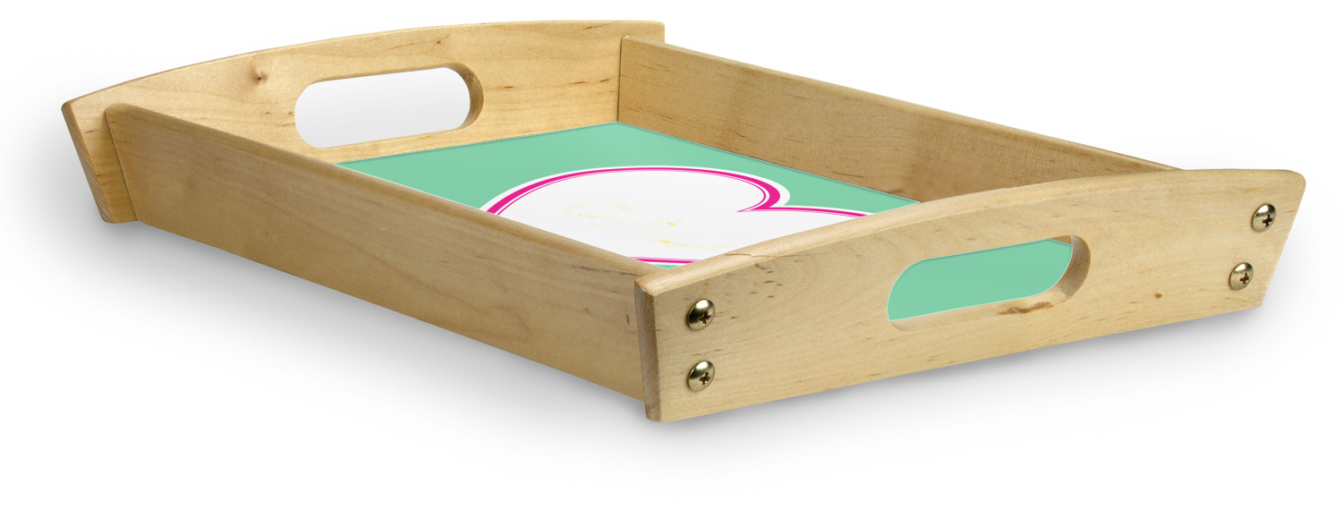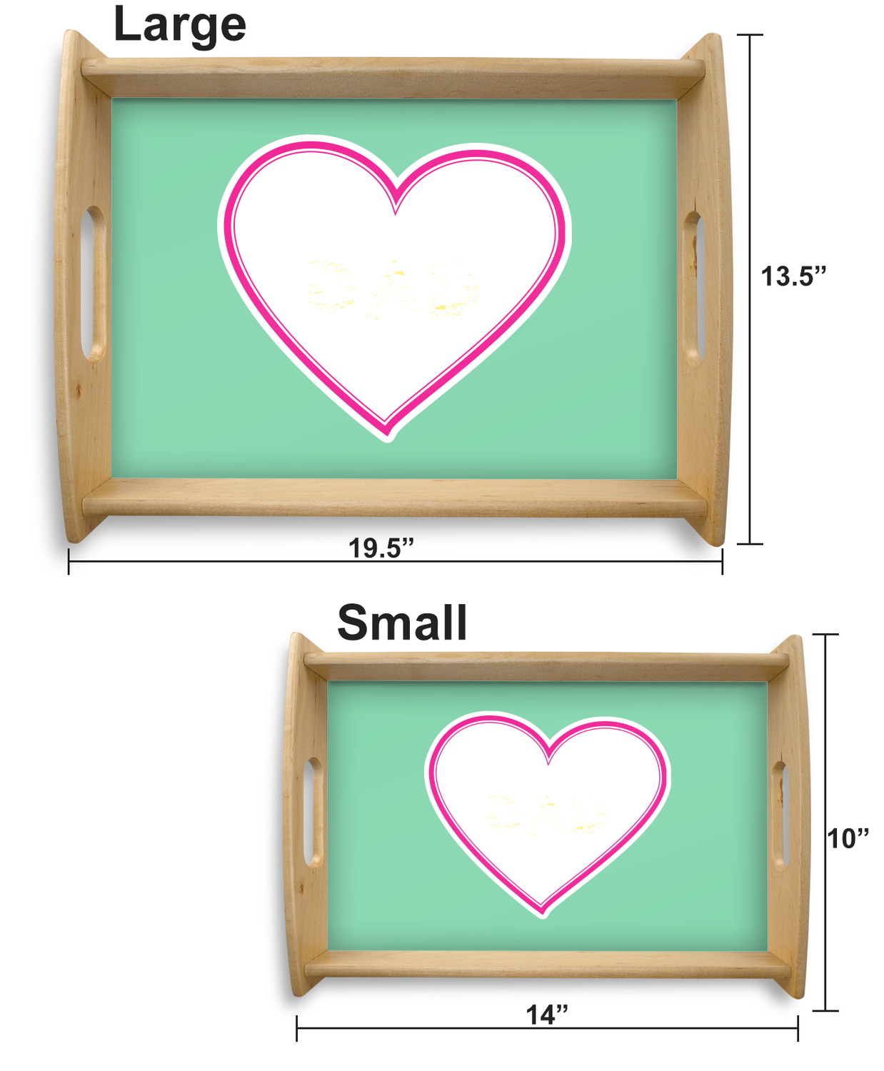 This serving tray with handles features square edges and two rounded sides, creating a very modern look. Each side is fabricated from a beautifully cut, natural wood. The bottom of the interior of the tray displays your customized design in bright, vibrant color. The tray is sold in both a black color and a natural wood look. Each variation of the wood serving tray has two sizes: Small, which is 14" x 10" x 2.25", and Large, which is 19.5" x 13.5" x 2.75".
