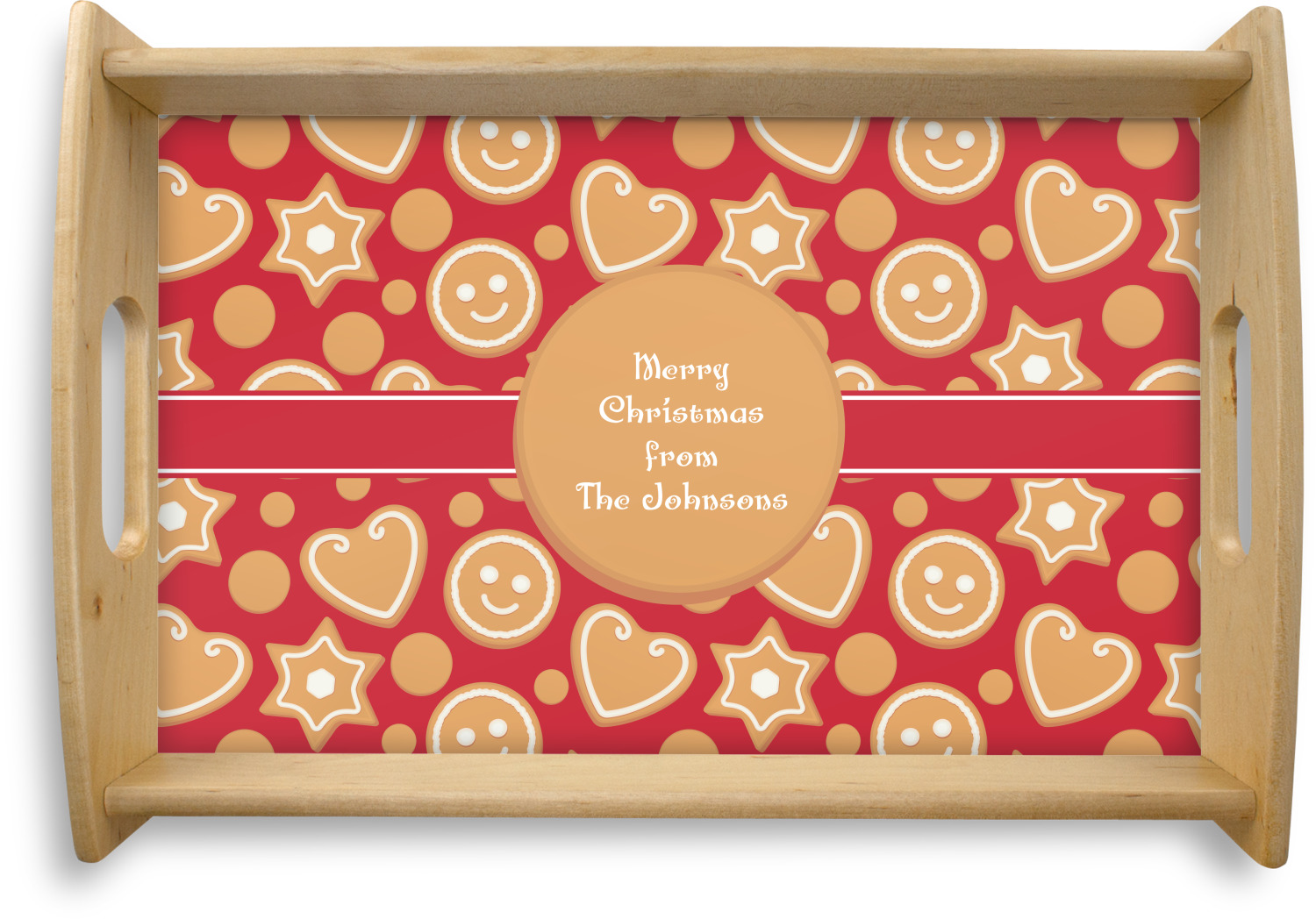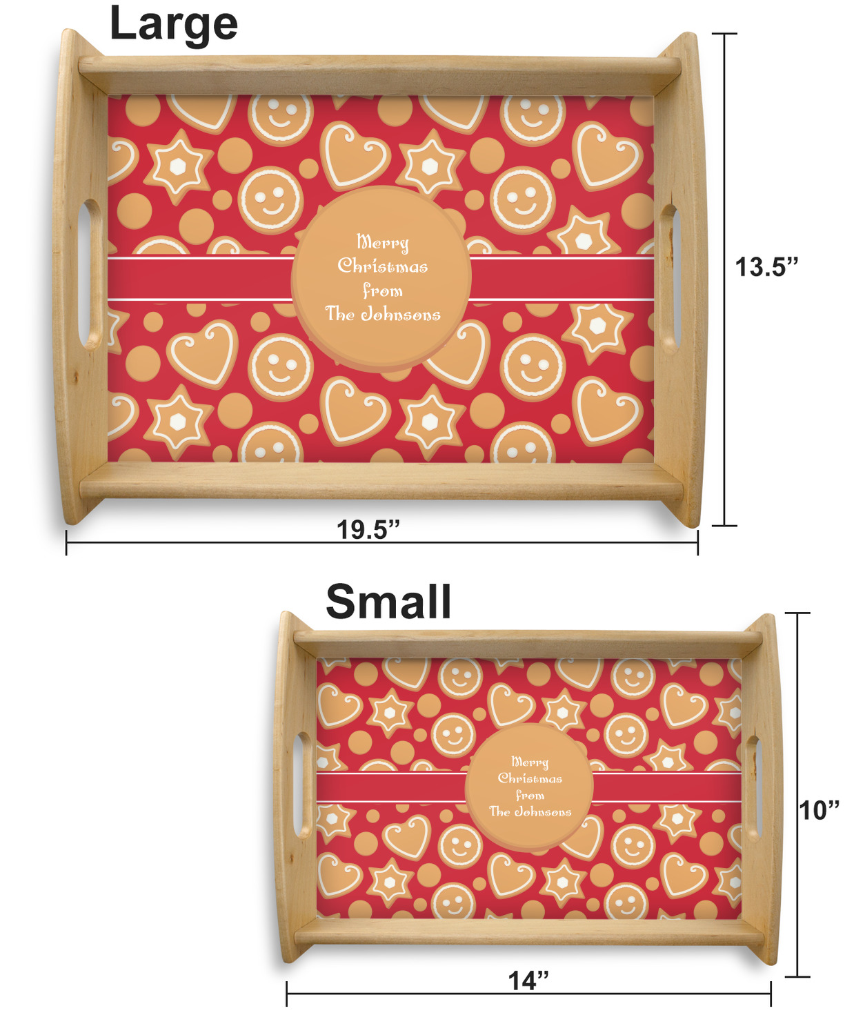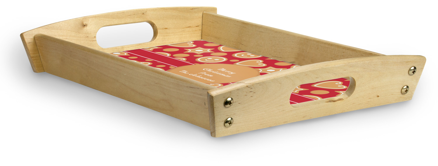 This serving tray with handles features square edges and two rounded sides, creating a very modern look. Each side is fabricated from a beautifully cut, natural wood. The bottom of the interior of the tray displays your customized design in bright, vibrant color. The tray is sold in both a black color and a natural wood look. Each variation of the wood serving tray has two sizes: Small, which is 14" x 10" x 2.25", and Large, which is 19.5" x 13.5" x 2.75".