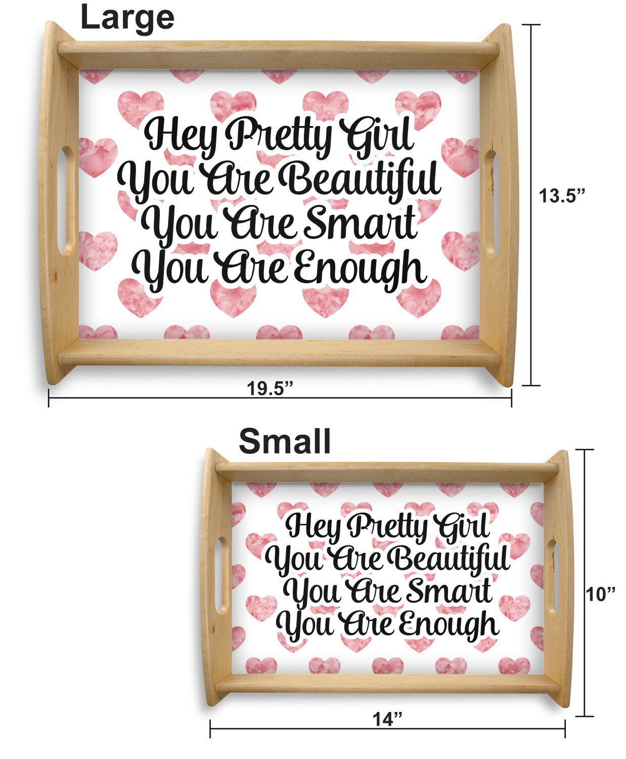 This serving tray with handles features square edges and two rounded sides, creating a very modern look. Each side is fabricated from a beautifully cut, natural wood. The bottom of the interior of the tray displays your customized design in bright, vibrant color. The tray is sold in both a black color and a natural wood look. Each variation of the wood serving tray has two sizes: Small, which is 14" x 10" x 2.25", and Large, which is 19.5" x 13.5" x 2.75".