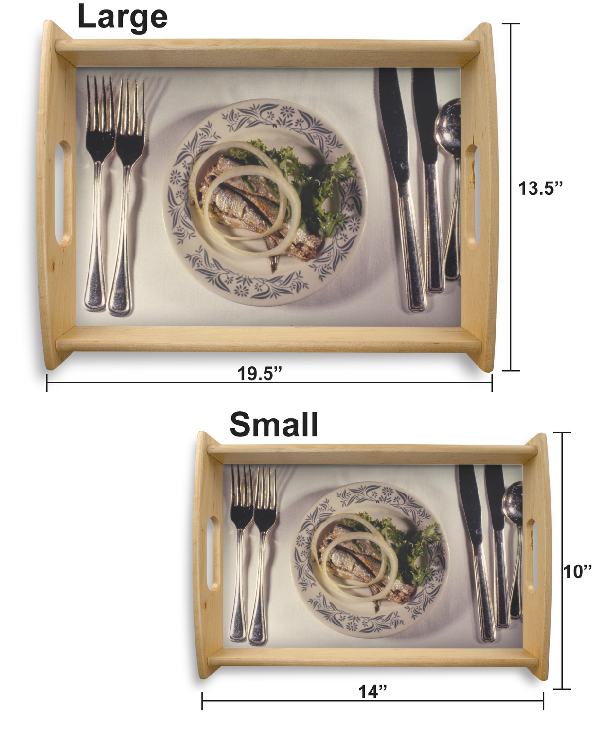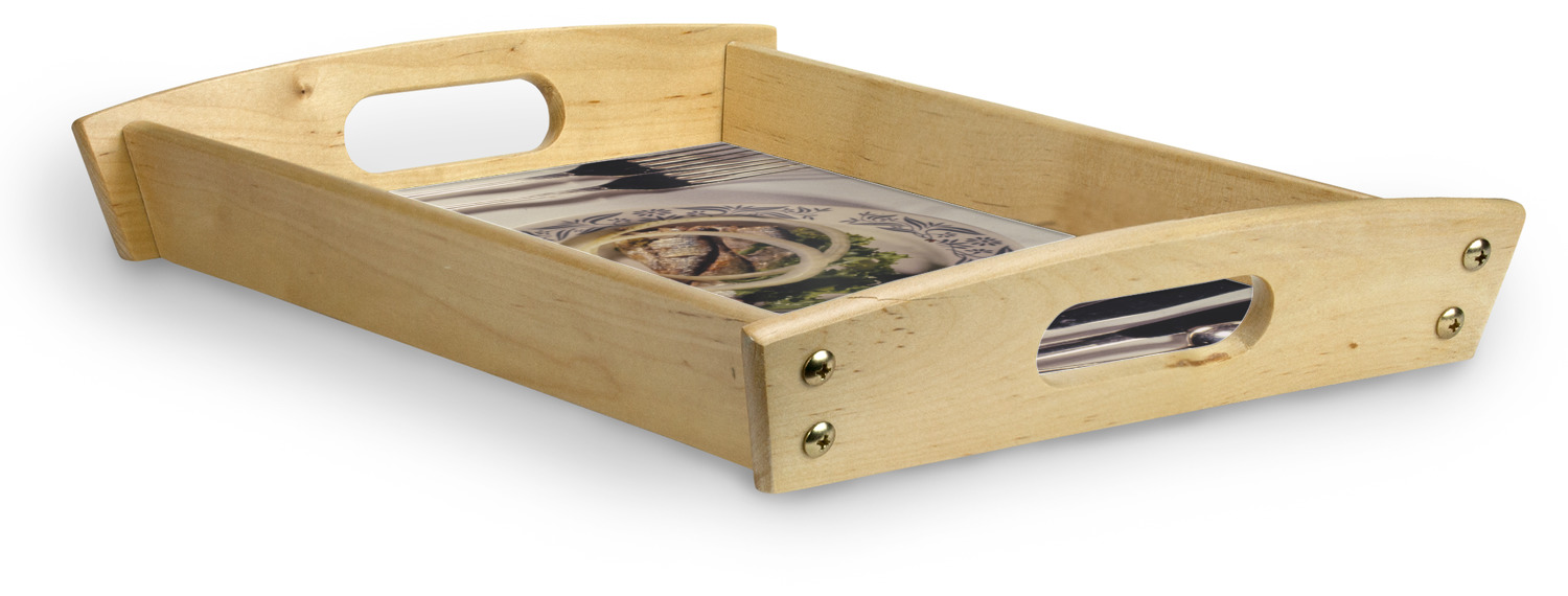 This serving tray with handles features square edges and two rounded sides, creating a very modern look. Each side is fabricated from a beautifully cut, natural wood. The bottom of the interior of the tray displays your customized design in bright, vibrant color. The tray is sold in both a black color and a natural wood look. Each variation of the wood serving tray has two sizes: Small, which is 14" x 10" x 2.25", and Large, which is 19.5" x 13.5" x 2.75".
