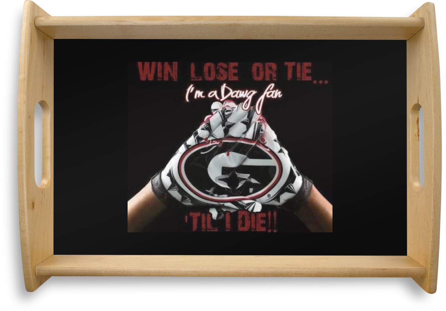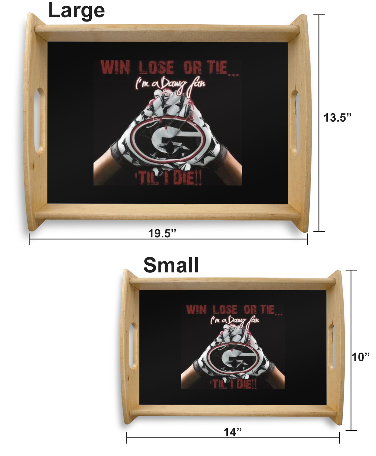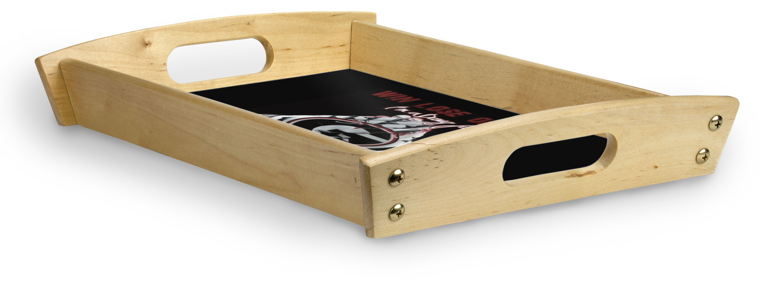 This serving tray with handles features square edges and two rounded sides, creating a very modern look. Each side is fabricated from a beautifully cut, natural wood. The bottom of the interior of the tray displays your customized design in bright, vibrant color. The tray is sold in both a black color and a natural wood look. Each variation of the wood serving tray has two sizes: Small, which is 14" x 10" x 2.25", and Large, which is 19.5" x 13.5" x 2.75".