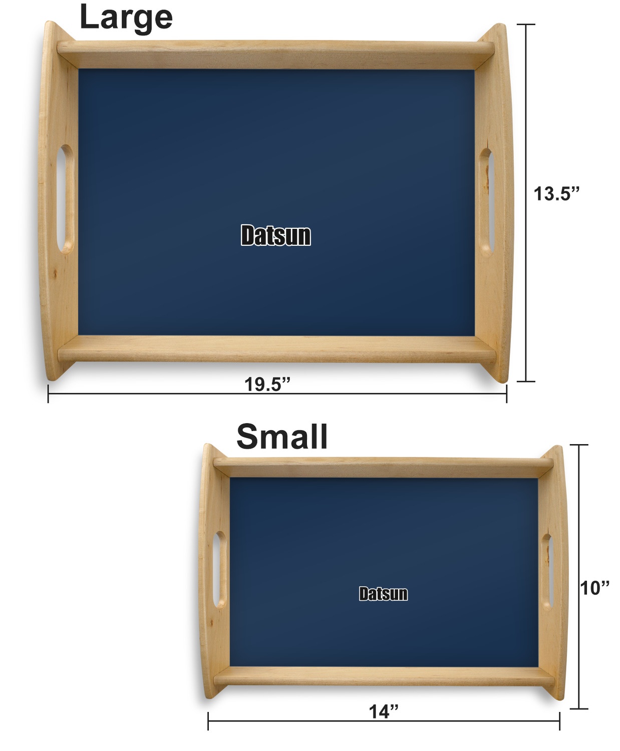 This serving tray with handles features square edges and two rounded sides, creating a very modern look. Each side is fabricated from a beautifully cut, natural wood. The bottom of the interior of the tray displays your customized design in bright, vibrant color. The tray is sold in both a black color and a natural wood look. Each variation of the wood serving tray has two sizes: Small, which is 14" x 10" x 2.25", and Large, which is 19.5" x 13.5" x 2.75".