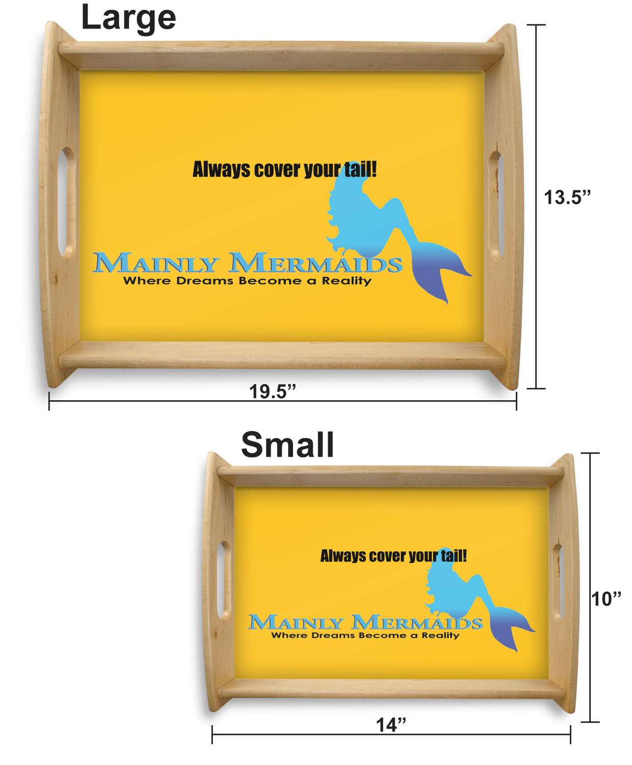 This serving tray with handles features square edges and two rounded sides, creating a very modern look. Each side is fabricated from a beautifully cut, natural wood. The bottom of the interior of the tray displays your customized design in bright, vibrant color. The tray is sold in both a black color and a natural wood look. Each variation of the wood serving tray has two sizes: Small, which is 14" x 10" x 2.25", and Large, which is 19.5" x 13.5" x 2.75".