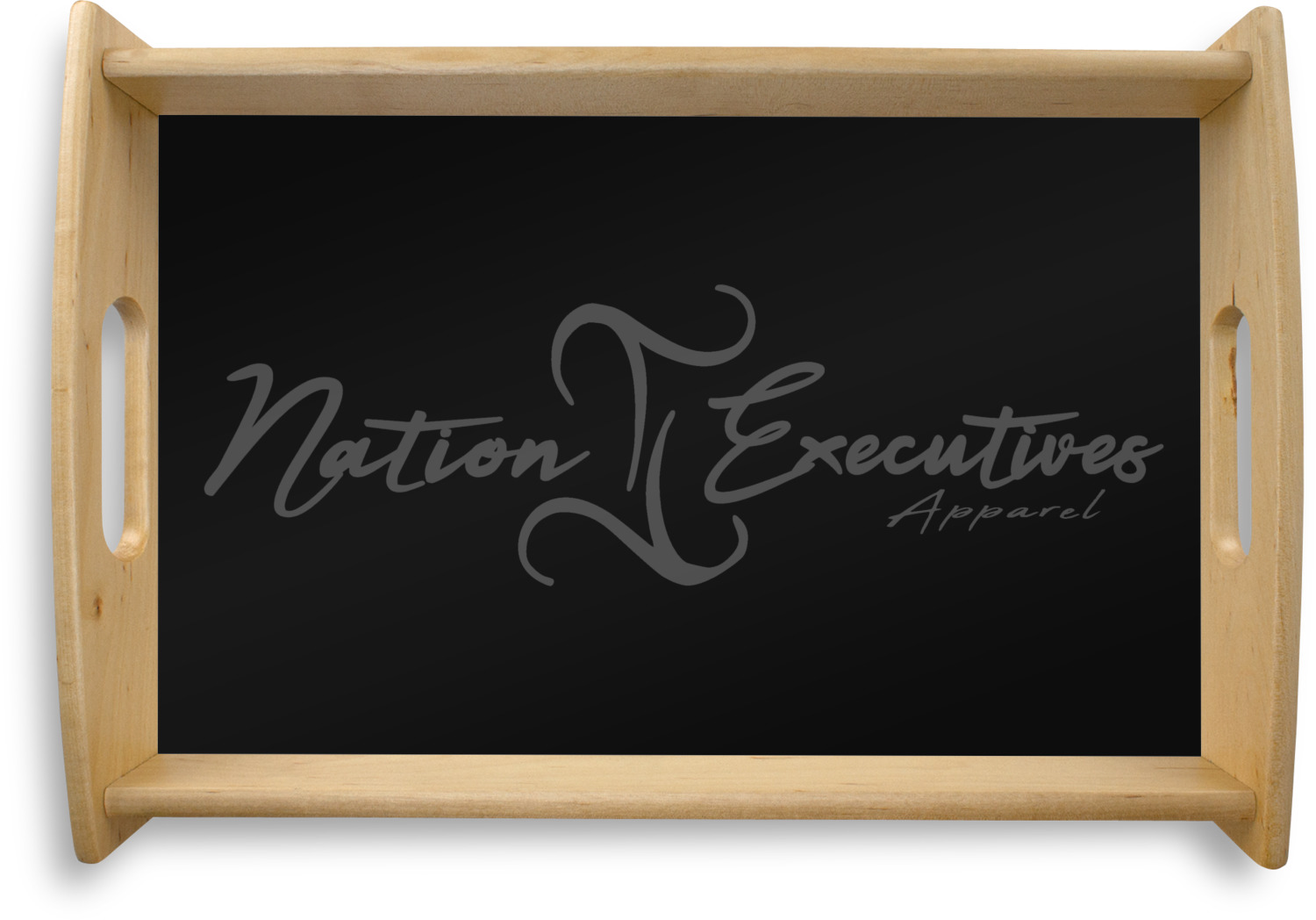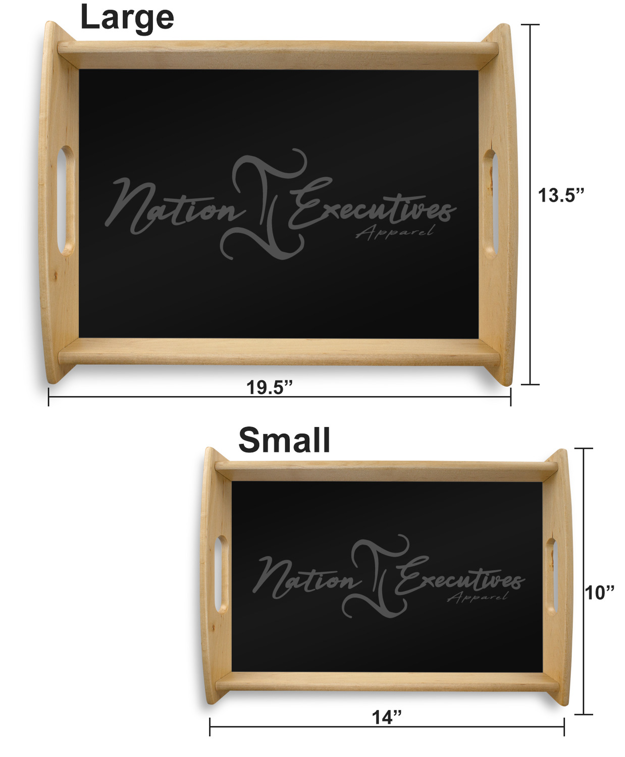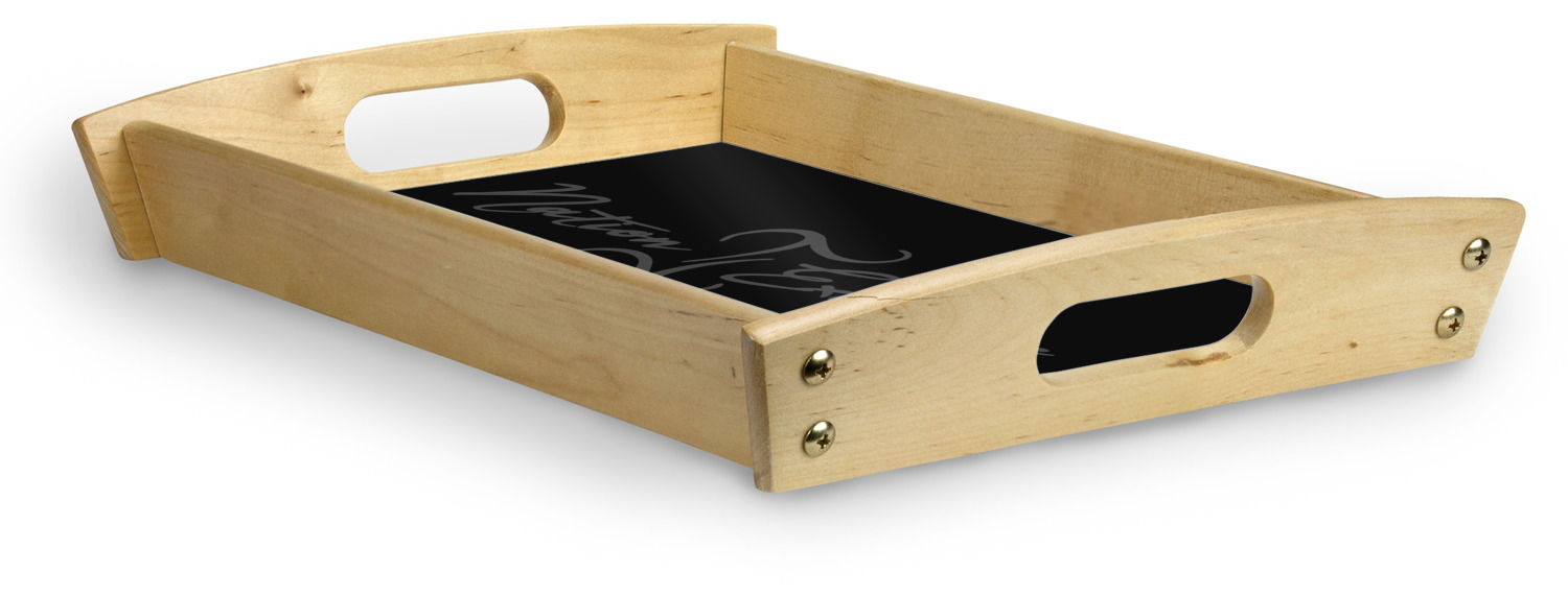 This serving tray with handles features square edges and two rounded sides, creating a very modern look. Each side is fabricated from a beautifully cut, natural wood. The bottom of the interior of the tray displays your customized design in bright, vibrant color. The tray is sold in both a black color and a natural wood look. Each variation of the wood serving tray has two sizes: Small, which is 14" x 10" x 2.25", and Large, which is 19.5" x 13.5" x 2.75".