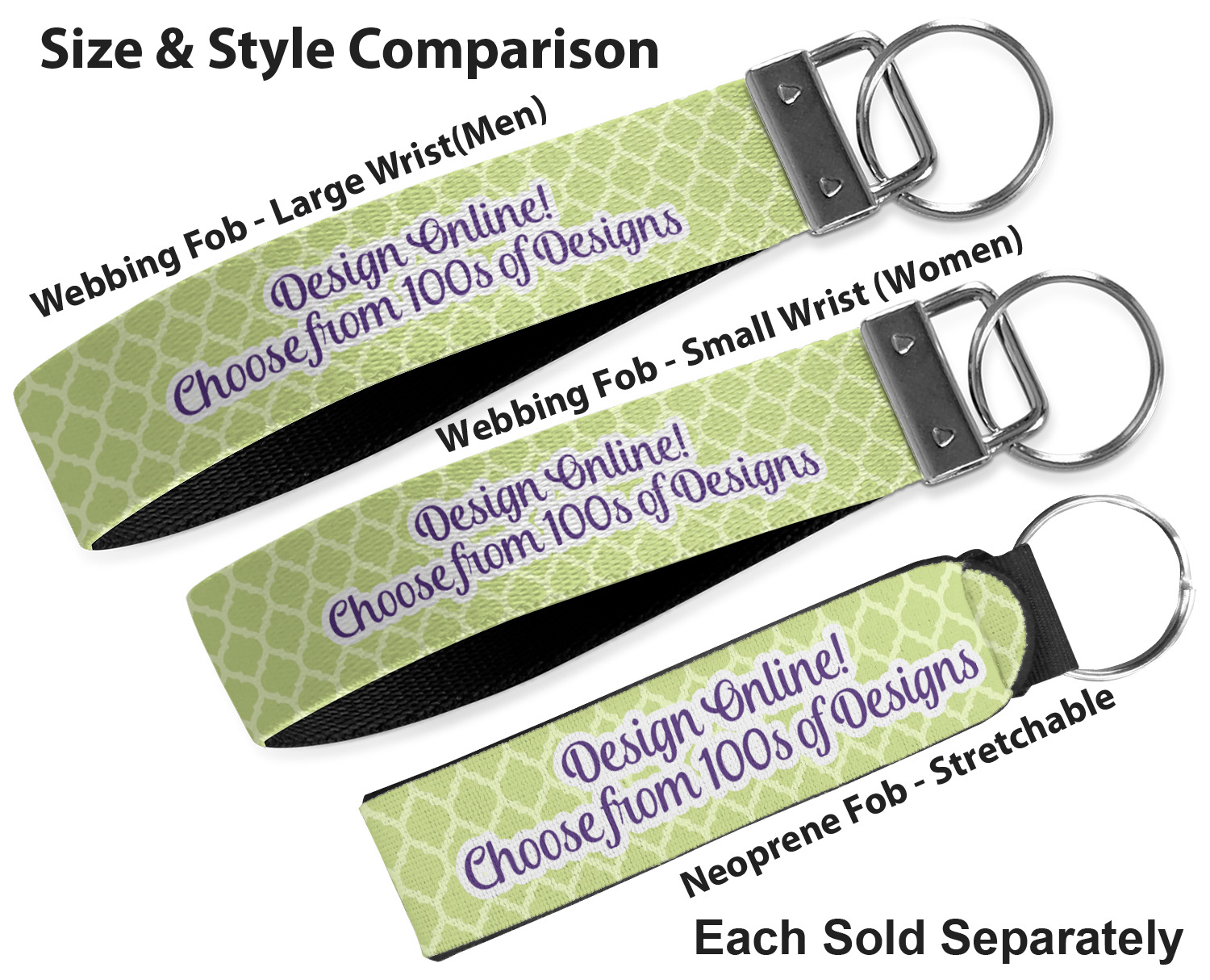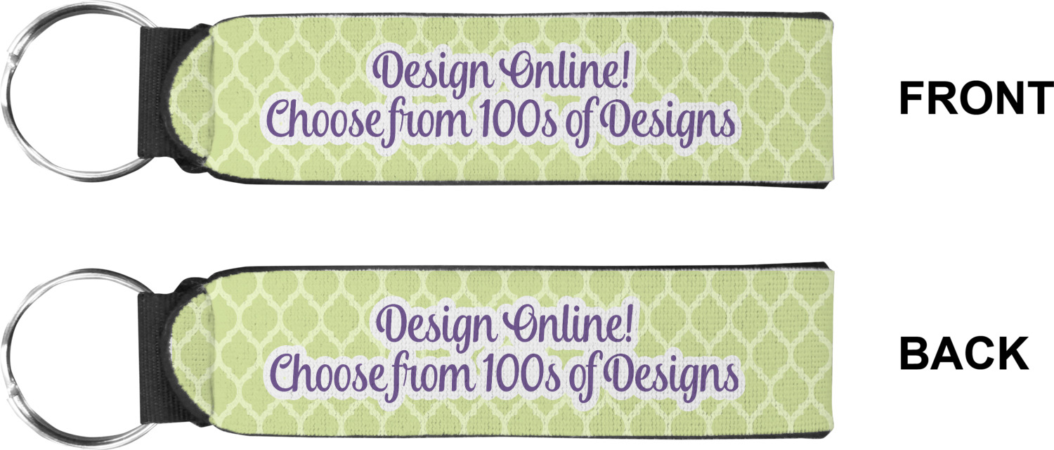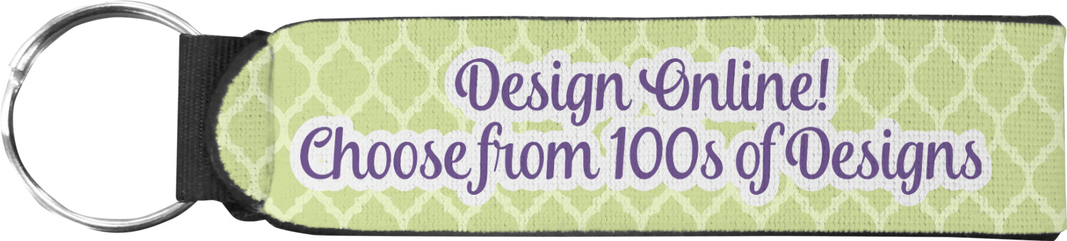 Made from neoprene, these key fob wristlets are comfortable, cushioned, easy to slip on and off; these traits allow it to maintain a slim, yet fashionable appearance, all while optimizing your efficiency. When attaching or removing keys, simply squeeze open the included metal ring. These fobs measure at around 4 inches, and have a bit of a stretch. Thus, they are best suited for small to medium size wrists. If you require a larger size, check out our webbing keychain fob for larger sizing.