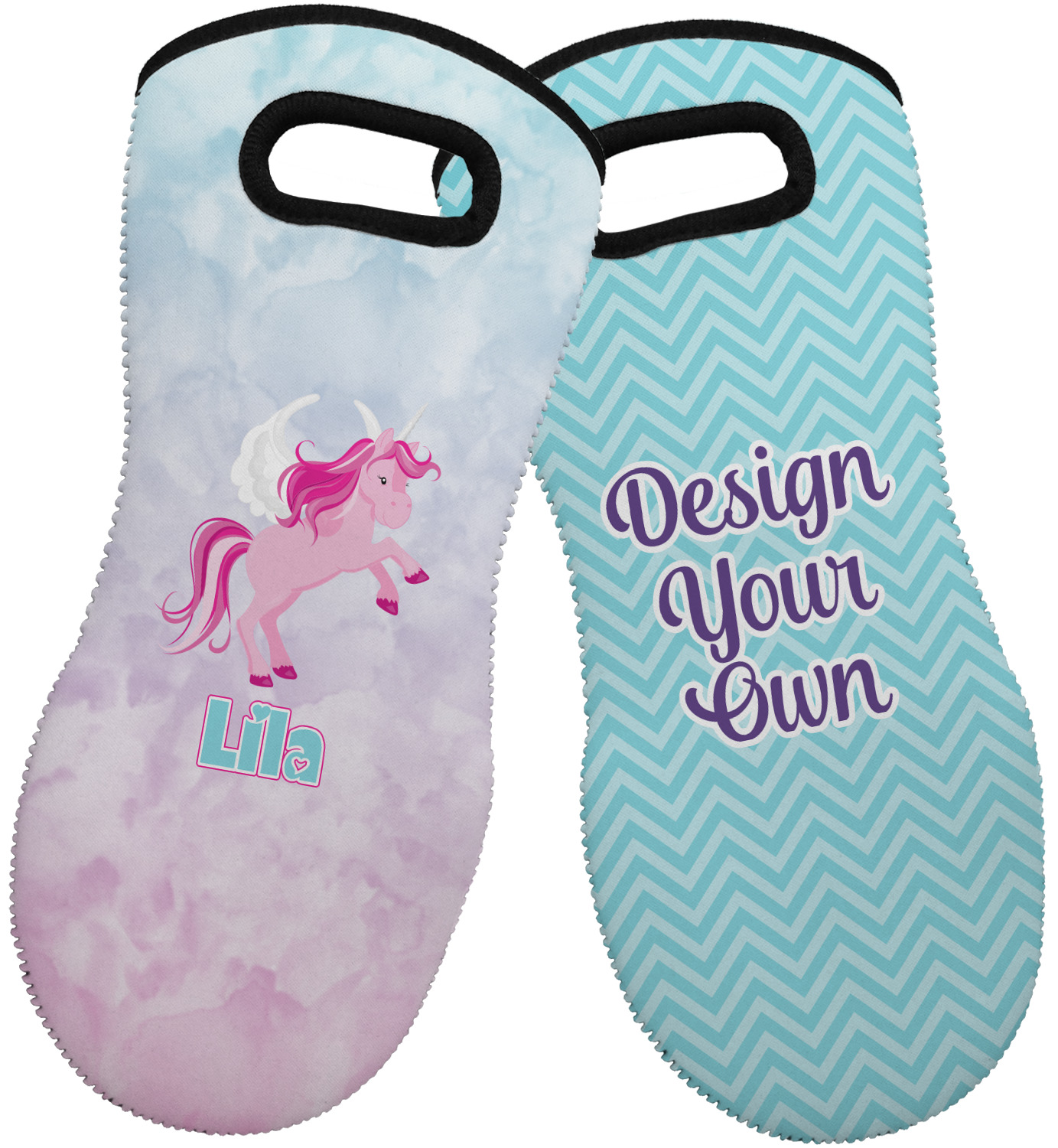 These heat resistant gloves are made entirely of a durable neoprene; the front features a softer texture, while the palm's side has a textured surface, meant to handle heat up to 500 degrees Fahrenheit. Thick, heavy duty stitching connects the two sides. A small, oval cutout appears on the front, and can be used to hang and store the mitt. Your personalization appears on the front, and the upper part of the back of the mitt. The style of these oven mitts are suitable for both the right and left hand, depending on your needs. If you need one for each hand, be sure to order two!