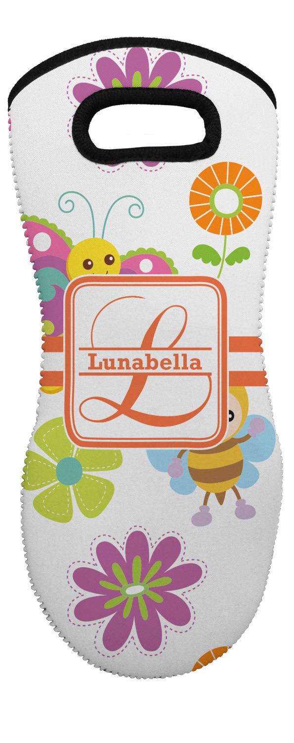 These heat resistant gloves are made entirely of a durable neoprene; the front features a softer texture, while the palm's side has a textured surface, meant to handle heat up to 500 degrees Fahrenheit. Thick, heavy duty stitching connects the two sides. A small, oval cutout appears on the front, and can be used to hang and store the mitt. Your personalization appears on the front, and the upper part of the back of the mitt. The style of these oven mitts are suitable for both the right and left hand, depending on your needs. If you need one for each hand, be sure to order two!