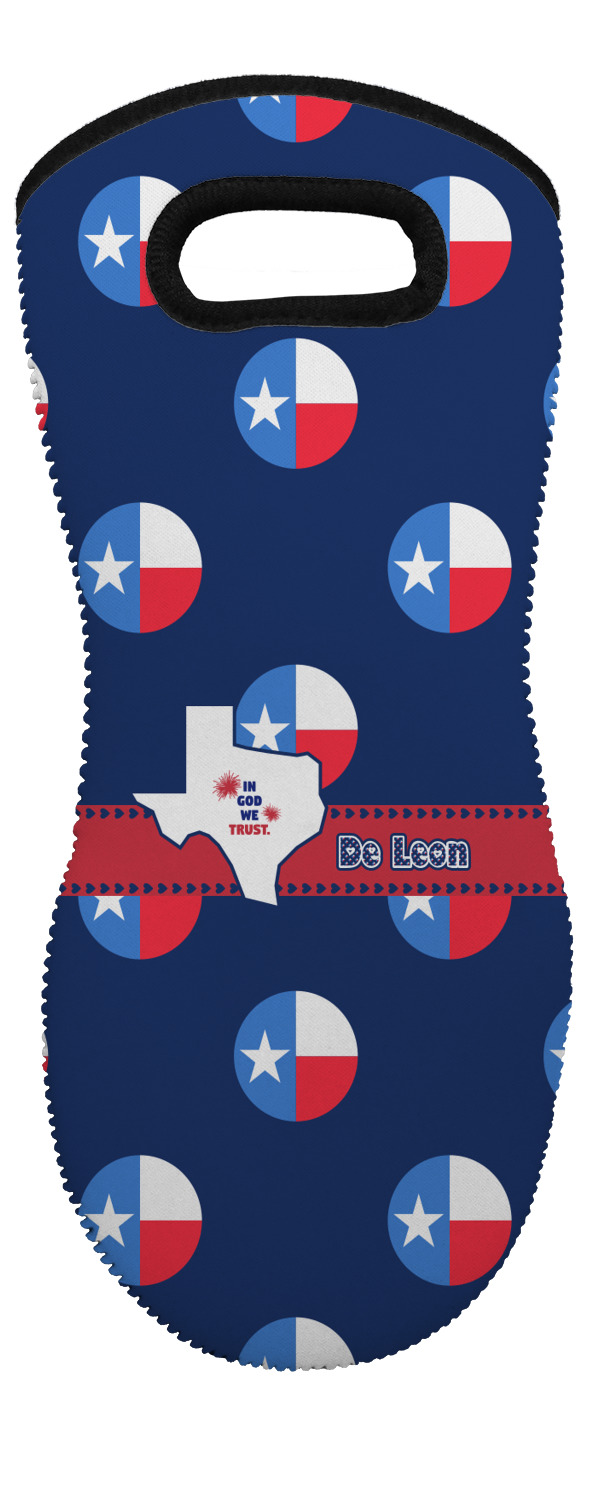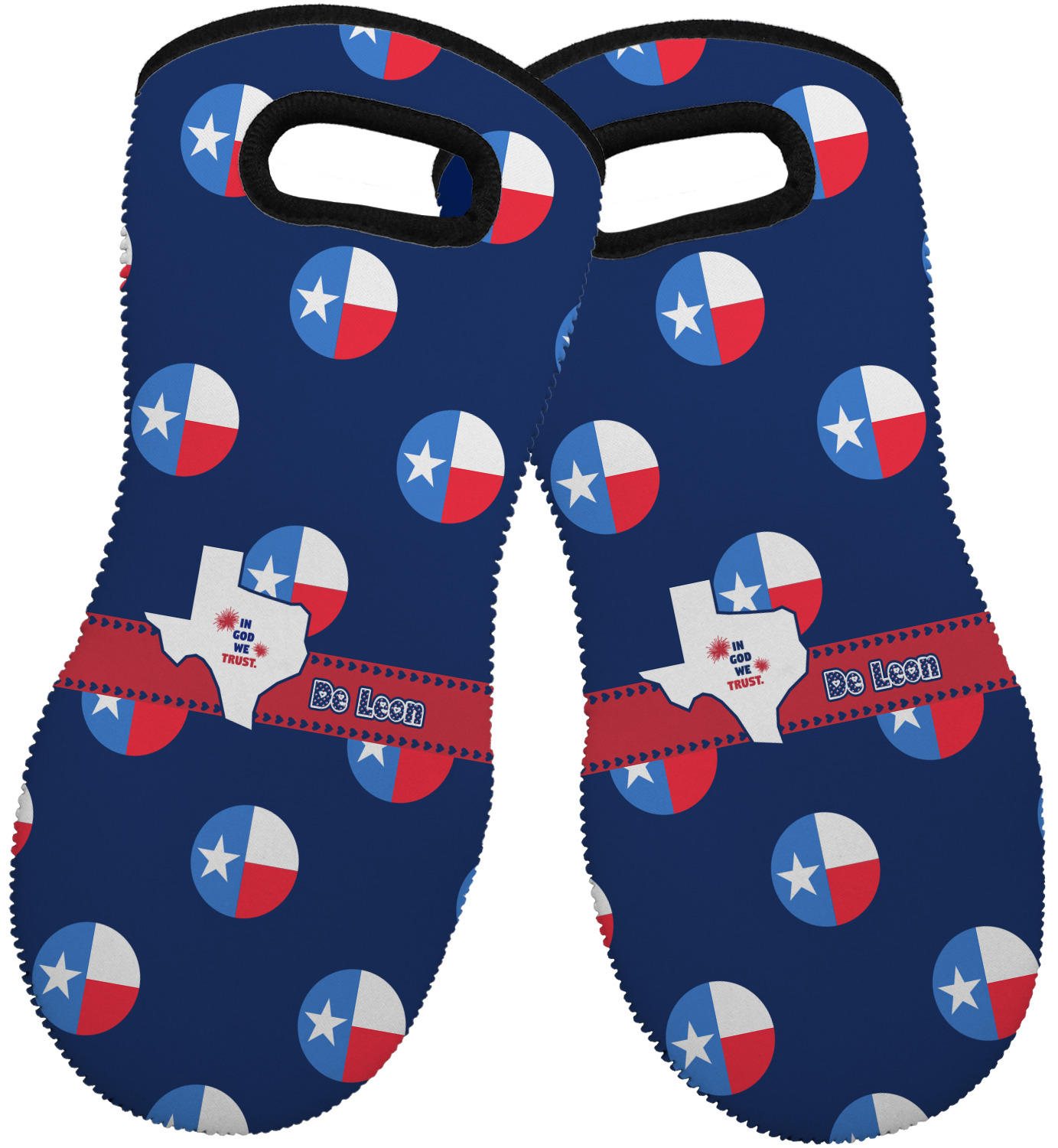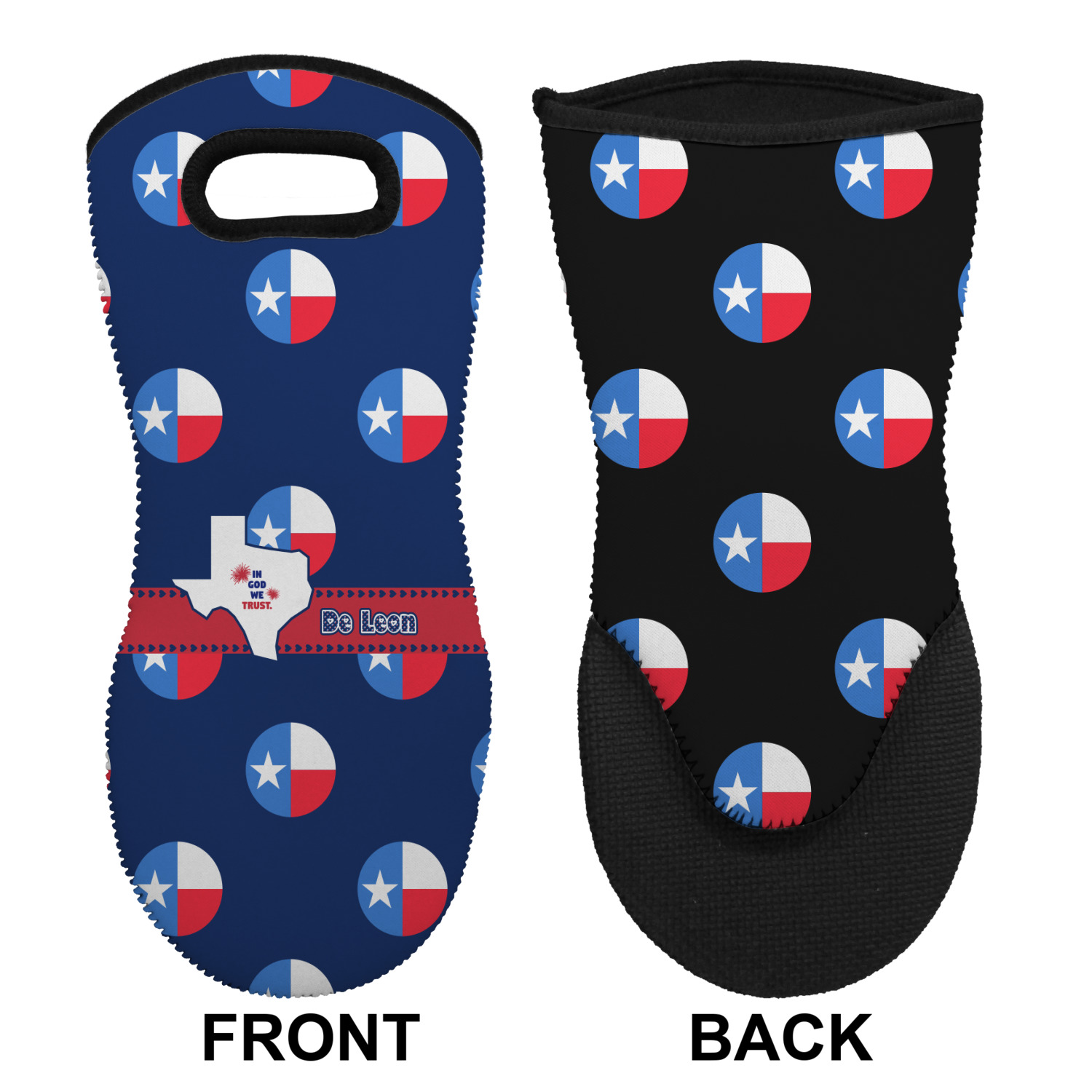 These heat resistant gloves are made entirely of a durable neoprene; the front features a softer texture, while the palm's side has a textured surface, meant to handle heat up to 500 degrees Fahrenheit. Thick, heavy duty stitching connects the two sides. A small, oval cutout appears on the front, and can be used to hang and store the mitt. Your personalization appears on the front, and the upper part of the back of the mitt. The style of these oven mitts are suitable for both the right and left hand, depending on your needs. If you need one for each hand, be sure to order two!
