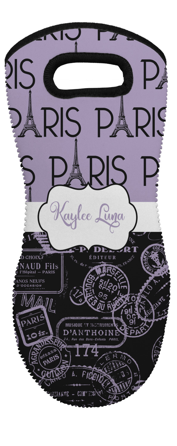 These heat resistant gloves are made entirely of a durable neoprene; the front features a softer texture, while the palm's side has a textured surface, meant to handle heat up to 500 degrees Fahrenheit. Thick, heavy duty stitching connects the two sides. A small, oval cutout appears on the front, and can be used to hang and store the mitt. Your personalization appears on the front, and the upper part of the back of the mitt. The style of these oven mitts are suitable for both the right and left hand, depending on your needs. If you need one for each hand, be sure to order two!