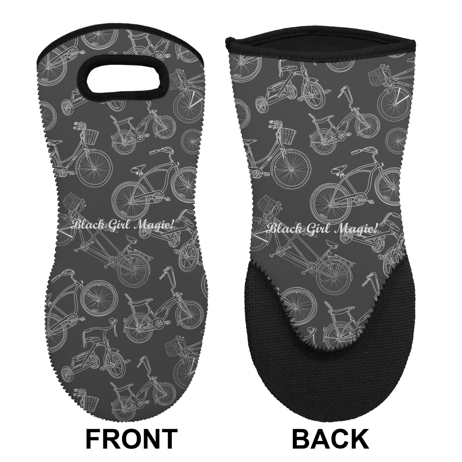 These heat resistant gloves are made entirely of a durable neoprene; the front features a softer texture, while the palm's side has a textured surface, meant to handle heat up to 500 degrees Fahrenheit. Thick, heavy duty stitching connects the two sides. A small, oval cutout appears on the front, and can be used to hang and store the mitt. Your personalization appears on the front, and the upper part of the back of the mitt. The style of these oven mitts are suitable for both the right and left hand, depending on your needs. If you need one for each hand, be sure to order two!