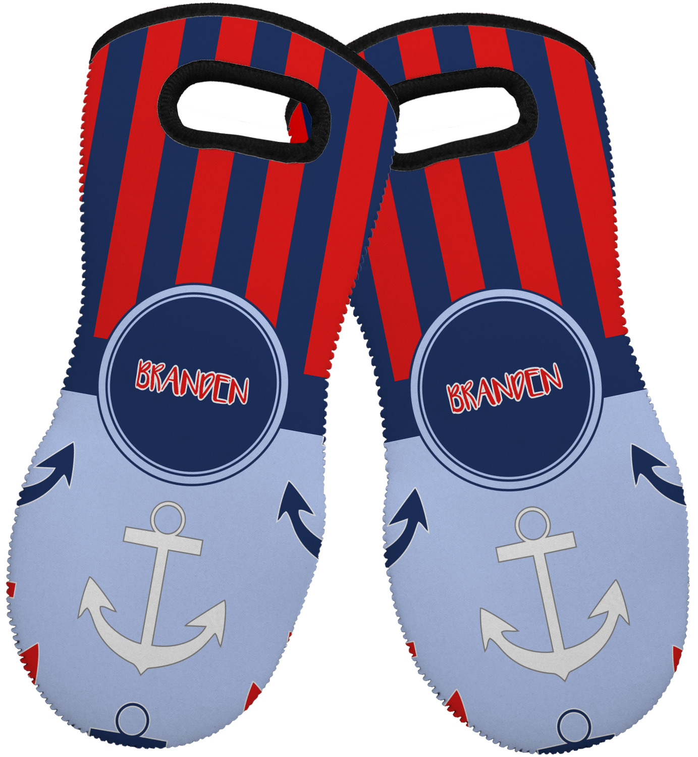 These heat resistant gloves are made entirely of a durable neoprene; the front features a softer texture, while the palm's side has a textured surface, meant to handle heat up to 500 degrees Fahrenheit. Thick, heavy duty stitching connects the two sides. A small, oval cutout appears on the front, and can be used to hang and store the mitt. Your personalization appears on the front, and the upper part of the back of the mitt. The style of these oven mitts are suitable for both the right and left hand, depending on your needs. If you need one for each hand, be sure to order two!