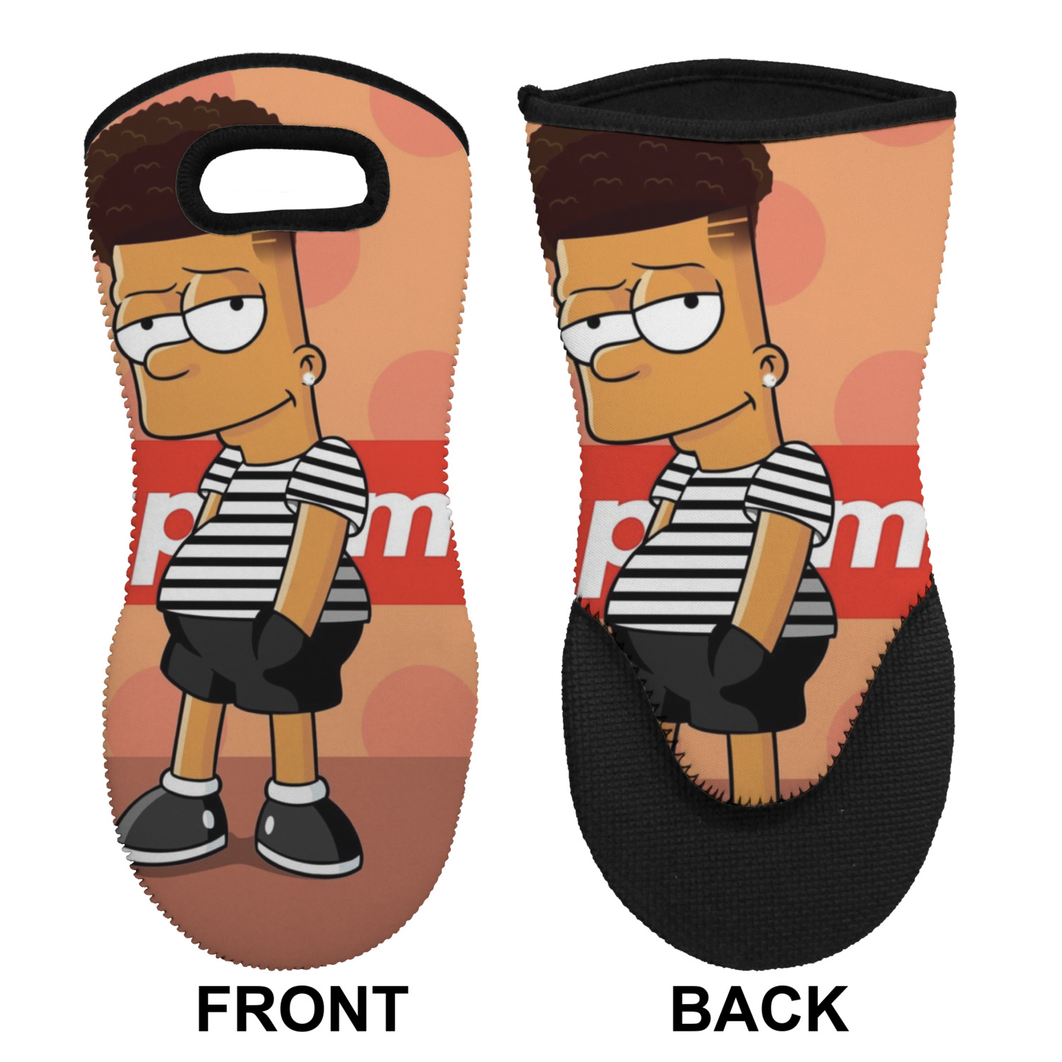These heat resistant gloves are made entirely of a durable neoprene; the front features a softer texture, while the palm's side has a textured surface, meant to handle heat up to 500 degrees Fahrenheit. Thick, heavy duty stitching connects the two sides. A small, oval cutout appears on the front, and can be used to hang and store the mitt. Your personalization appears on the front, and the upper part of the back of the mitt. The style of these oven mitts are suitable for both the right and left hand, depending on your needs. If you need one for each hand, be sure to order two!