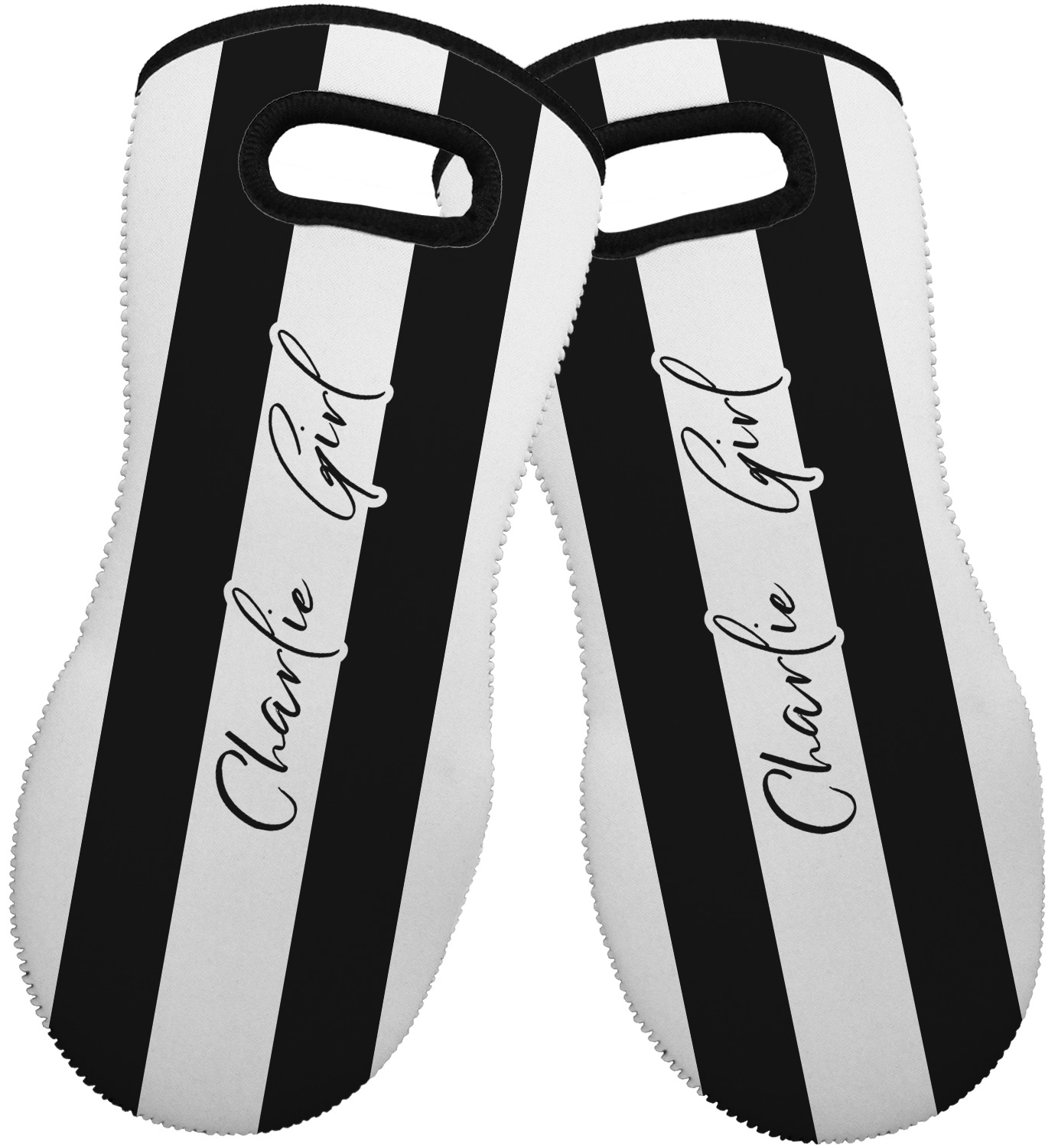 These heat resistant gloves are made entirely of a durable neoprene; the front features a softer texture, while the palm's side has a textured surface, meant to handle heat up to 500 degrees Fahrenheit. Thick, heavy duty stitching connects the two sides. A small, oval cutout appears on the front, and can be used to hang and store the mitt. Your personalization appears on the front, and the upper part of the back of the mitt. The style of these oven mitts are suitable for both the right and left hand, depending on your needs. If you need one for each hand, be sure to order two!