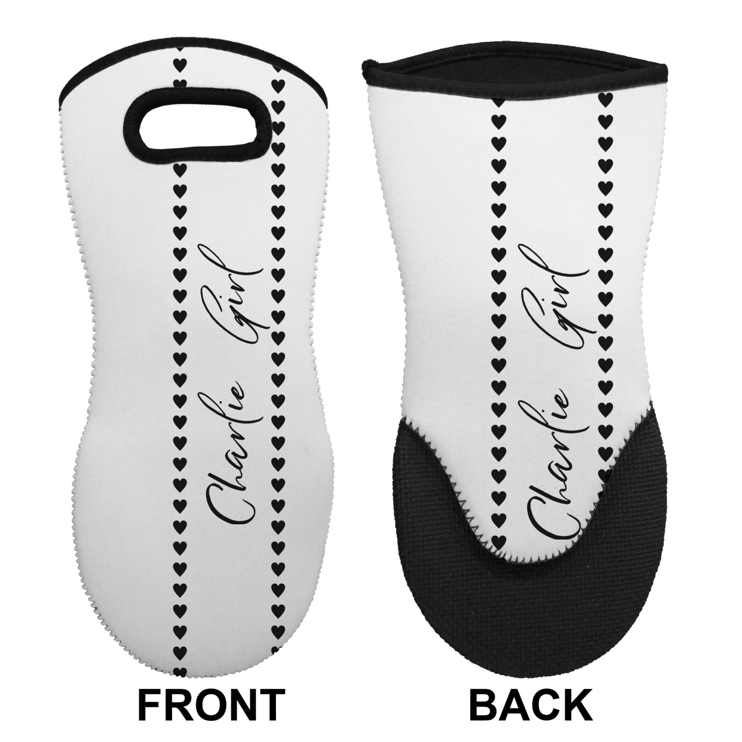 These heat resistant gloves are made entirely of a durable neoprene; the front features a softer texture, while the palm's side has a textured surface, meant to handle heat up to 500 degrees Fahrenheit. Thick, heavy duty stitching connects the two sides. A small, oval cutout appears on the front, and can be used to hang and store the mitt. Your personalization appears on the front, and the upper part of the back of the mitt. The style of these oven mitts are suitable for both the right and left hand, depending on your needs. If you need one for each hand, be sure to order two!