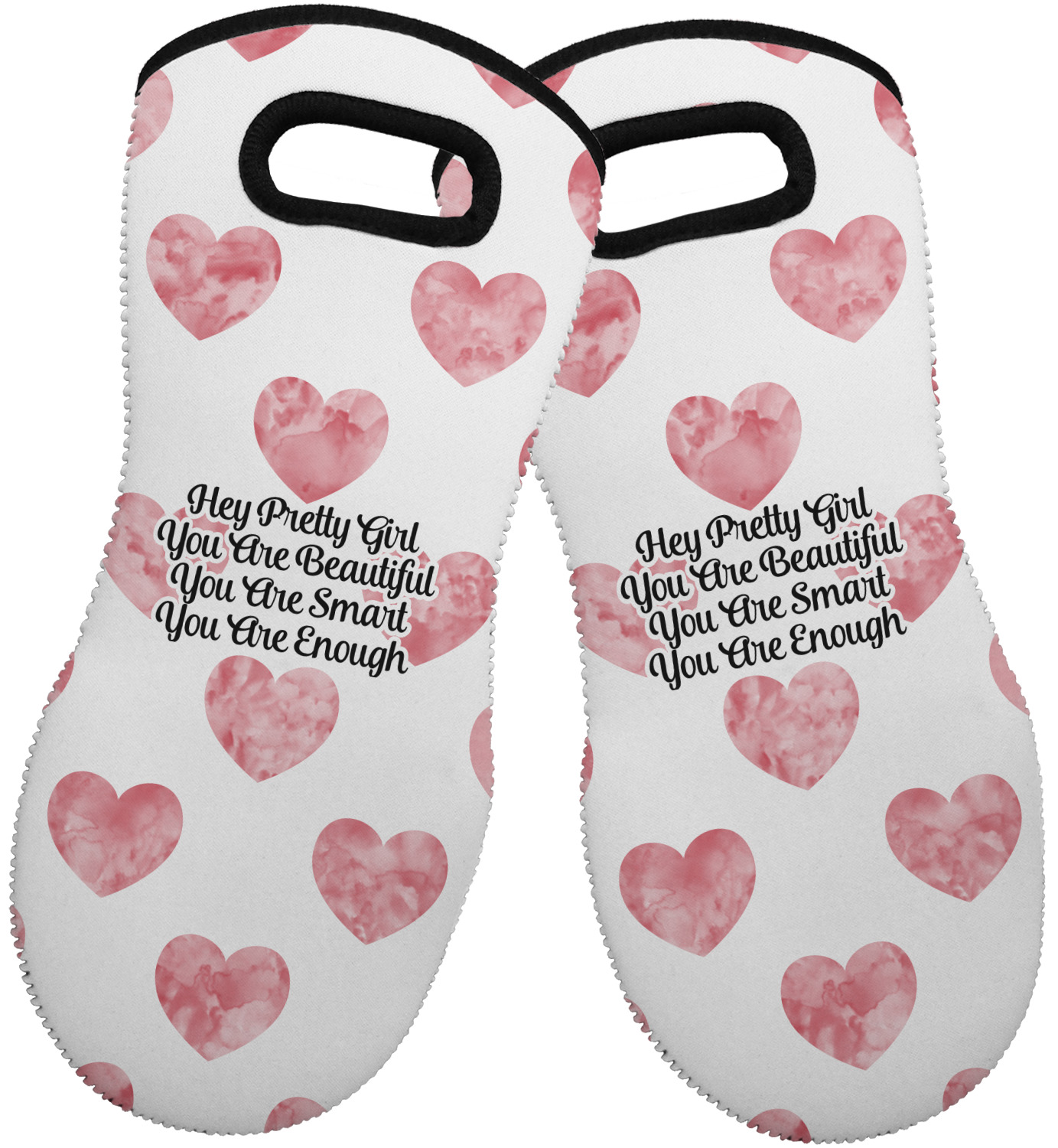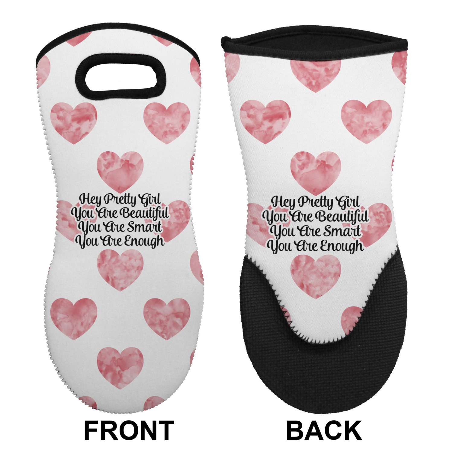 These heat resistant gloves are made entirely of a durable neoprene; the front features a softer texture, while the palm's side has a textured surface, meant to handle heat up to 500 degrees Fahrenheit. Thick, heavy duty stitching connects the two sides. A small, oval cutout appears on the front, and can be used to hang and store the mitt. Your personalization appears on the front, and the upper part of the back of the mitt. The style of these oven mitts are suitable for both the right and left hand, depending on your needs. If you need one for each hand, be sure to order two!