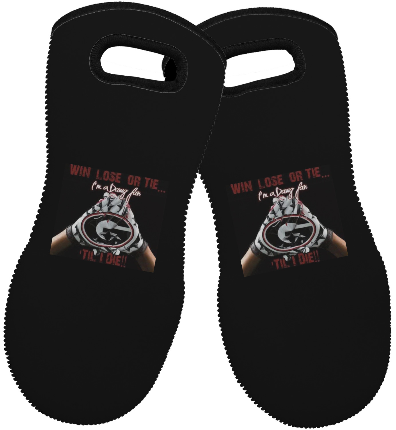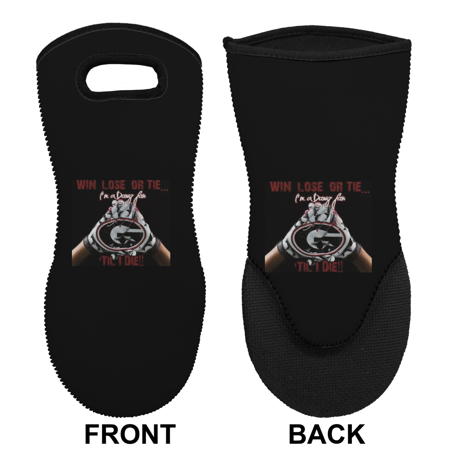 These heat resistant gloves are made entirely of a durable neoprene; the front features a softer texture, while the palm's side has a textured surface, meant to handle heat up to 500 degrees Fahrenheit. Thick, heavy duty stitching connects the two sides. A small, oval cutout appears on the front, and can be used to hang and store the mitt. Your personalization appears on the front, and the upper part of the back of the mitt. The style of these oven mitts are suitable for both the right and left hand, depending on your needs. If you need one for each hand, be sure to order two!