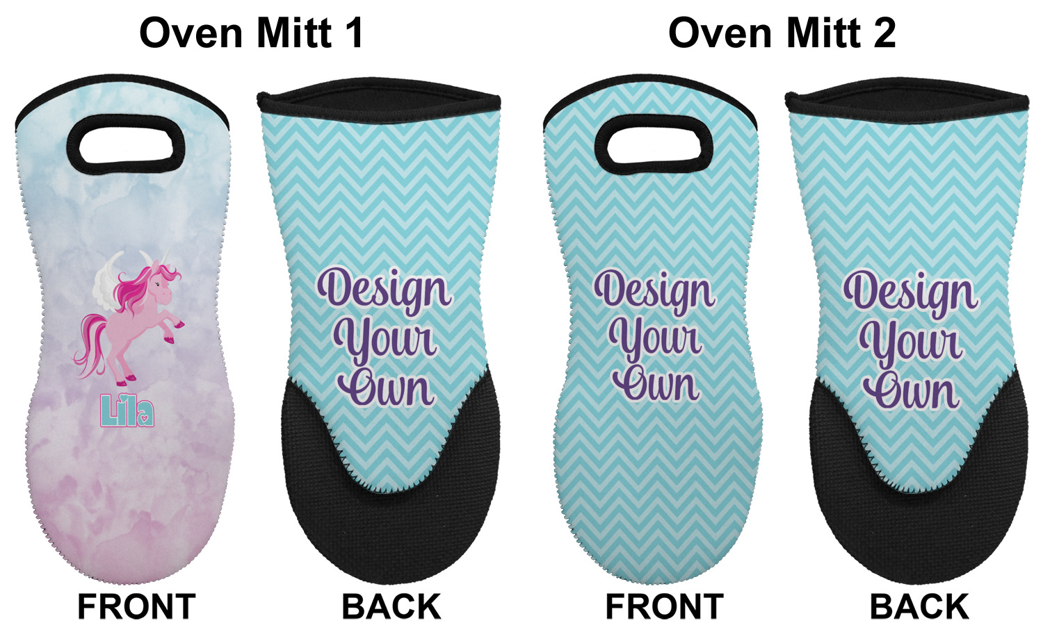 These heat resistant gloves are made entirely of a durable neoprene; the front features a softer texture, while the palm's side has a textured surface, meant to handle heat up to 500 degrees Fahrenheit. Thick, heavy duty stitching connects the two sides. A small, oval cutout appears on the front, and can be used to hang and store the mitt. Your personalization appears on the front, and the upper part of the back of the mitt. The style of these oven mitts are suitable for both the right and left hand, depending on your needs. If you need one for each hand, be sure to order two!