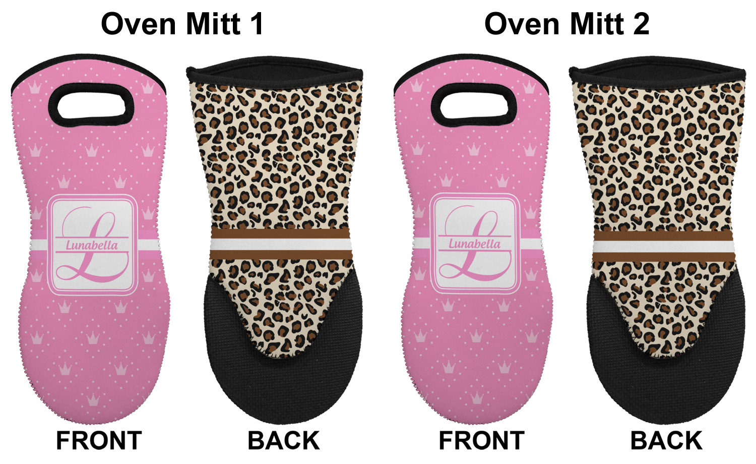 These heat resistant gloves are made entirely of a durable neoprene; the front features a softer texture, while the palm's side has a textured surface, meant to handle heat up to 500 degrees Fahrenheit. Thick, heavy duty stitching connects the two sides. A small, oval cutout appears on the front, and can be used to hang and store the mitt. Your personalization appears on the front, and the upper part of the back of the mitt. The style of these oven mitts are suitable for both the right and left hand, depending on your needs. If you need one for each hand, be sure to order two!
