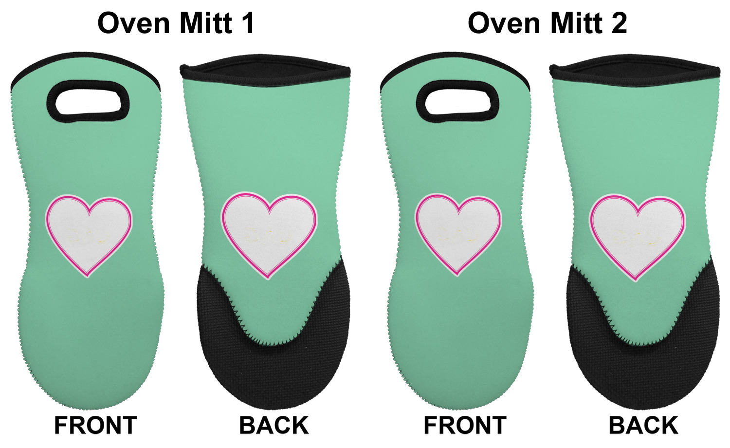These heat resistant gloves are made entirely of a durable neoprene; the front features a softer texture, while the palm's side has a textured surface, meant to handle heat up to 500 degrees Fahrenheit. Thick, heavy duty stitching connects the two sides. A small, oval cutout appears on the front, and can be used to hang and store the mitt. Your personalization appears on the front, and the upper part of the back of the mitt. The style of these oven mitts are suitable for both the right and left hand, depending on your needs. If you need one for each hand, be sure to order two!