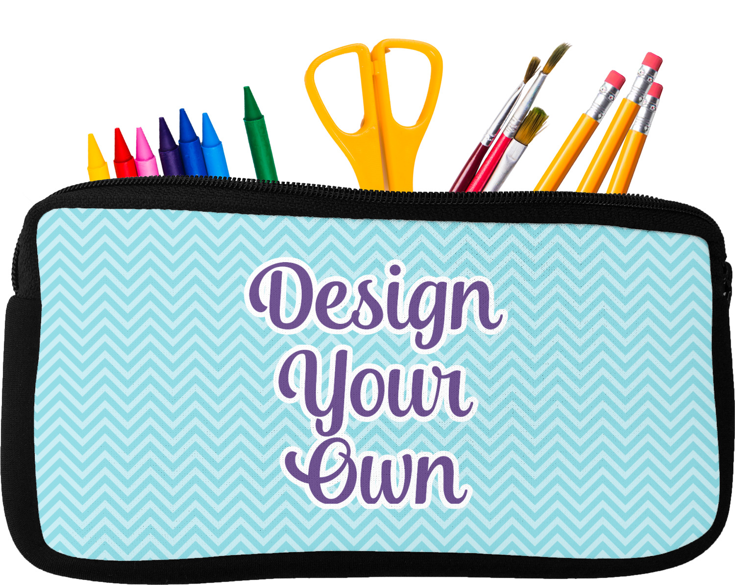 Built from durable neoprene, these pencil pouches, are water resistant, and prevent leaking ink from spilling into your backpack or purse. These custom pencil cases secure with a robust, black zipper. We print your personalized design on the front of this pouch, while the remaining sides a simple black color. These colored pencil cases [880] are sold in two sizes; our smaller version measures at 8.5 by 4.5 inches, while the medium measures at 10.5 by 6.5 inches. The smaller size is more suitable for holding pencils and pens, while our medium size can accommodate pencil sharpeners, scissors, and erasers.
