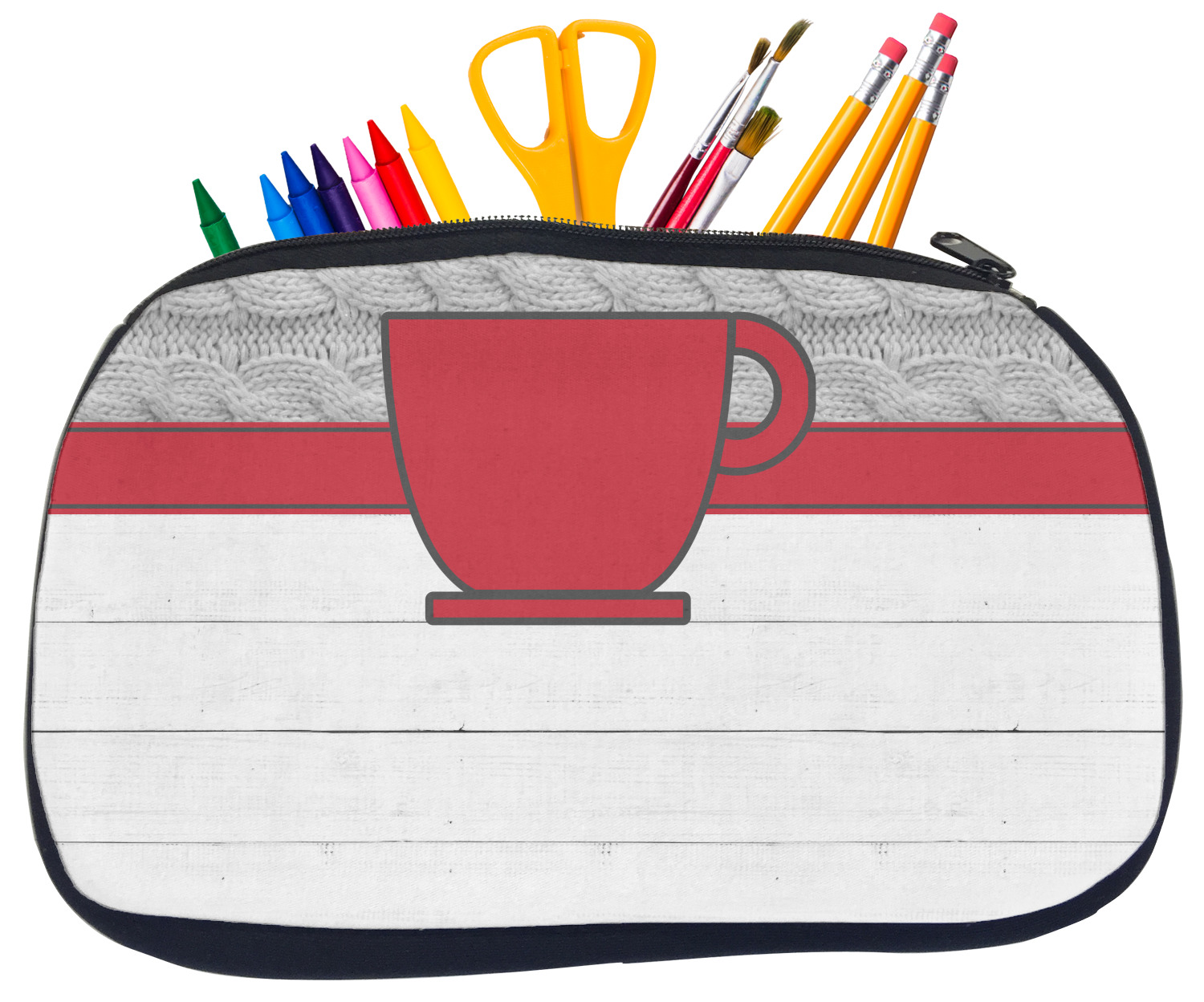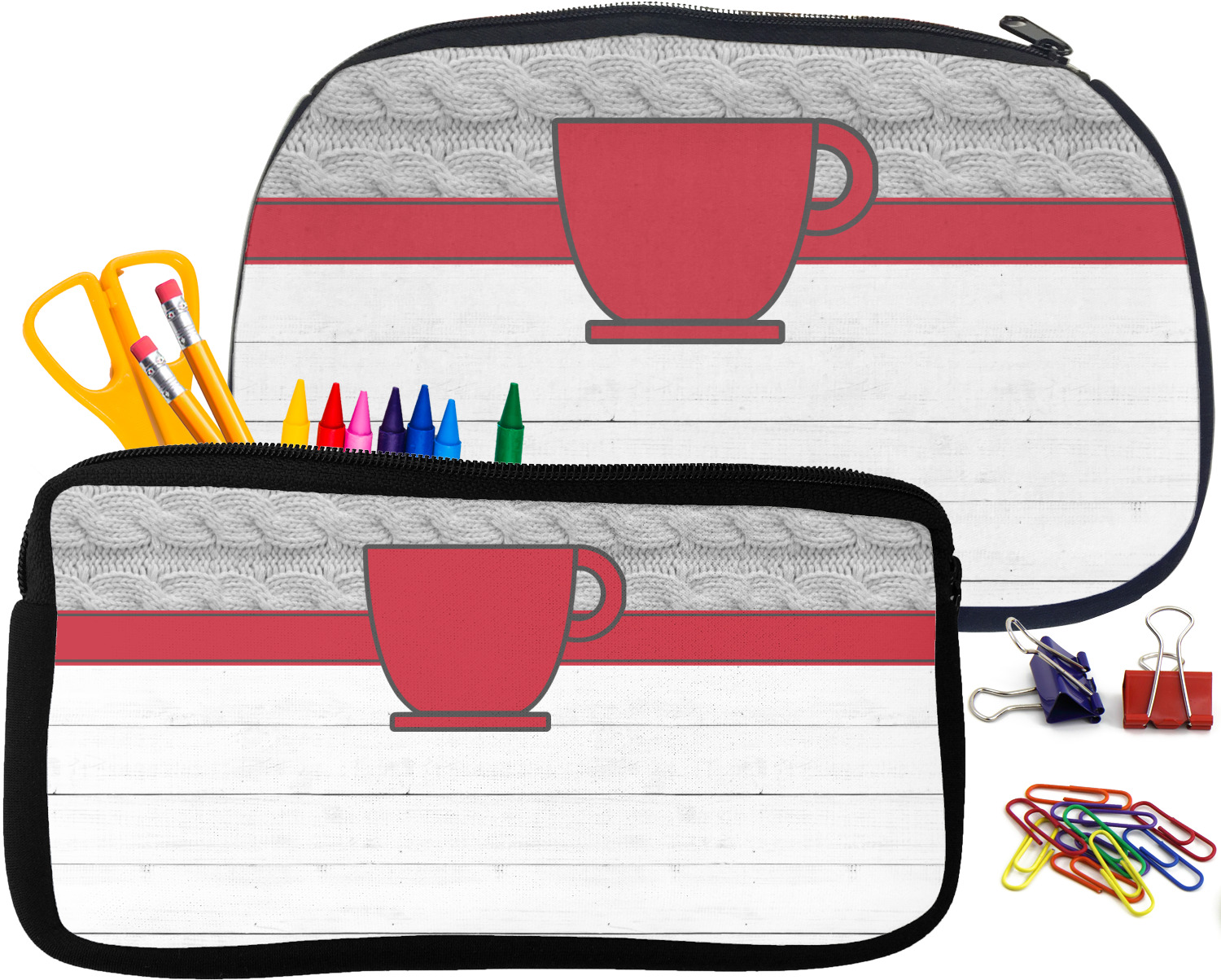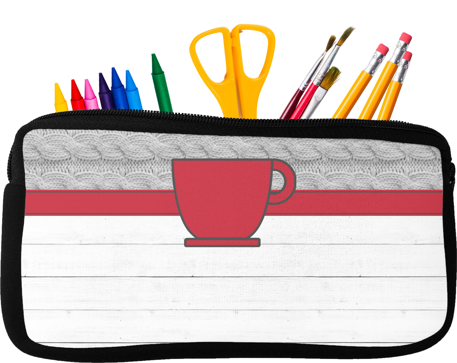 Built from durable neoprene, these pencil pouches, are water resistant, and prevent leaking ink from spilling into your backpack or purse. These custom pencil cases secure with a robust, black zipper. We print your personalized design on the front of this pouch, while the remaining sides a simple black color. These colored pencil cases [880] are sold in two sizes; our smaller version measures at 8.5 by 4.5 inches, while the medium measures at 10.5 by 6.5 inches. The smaller size is more suitable for holding pencils and pens, while our medium size can accommodate pencil sharpeners, scissors, and erasers.