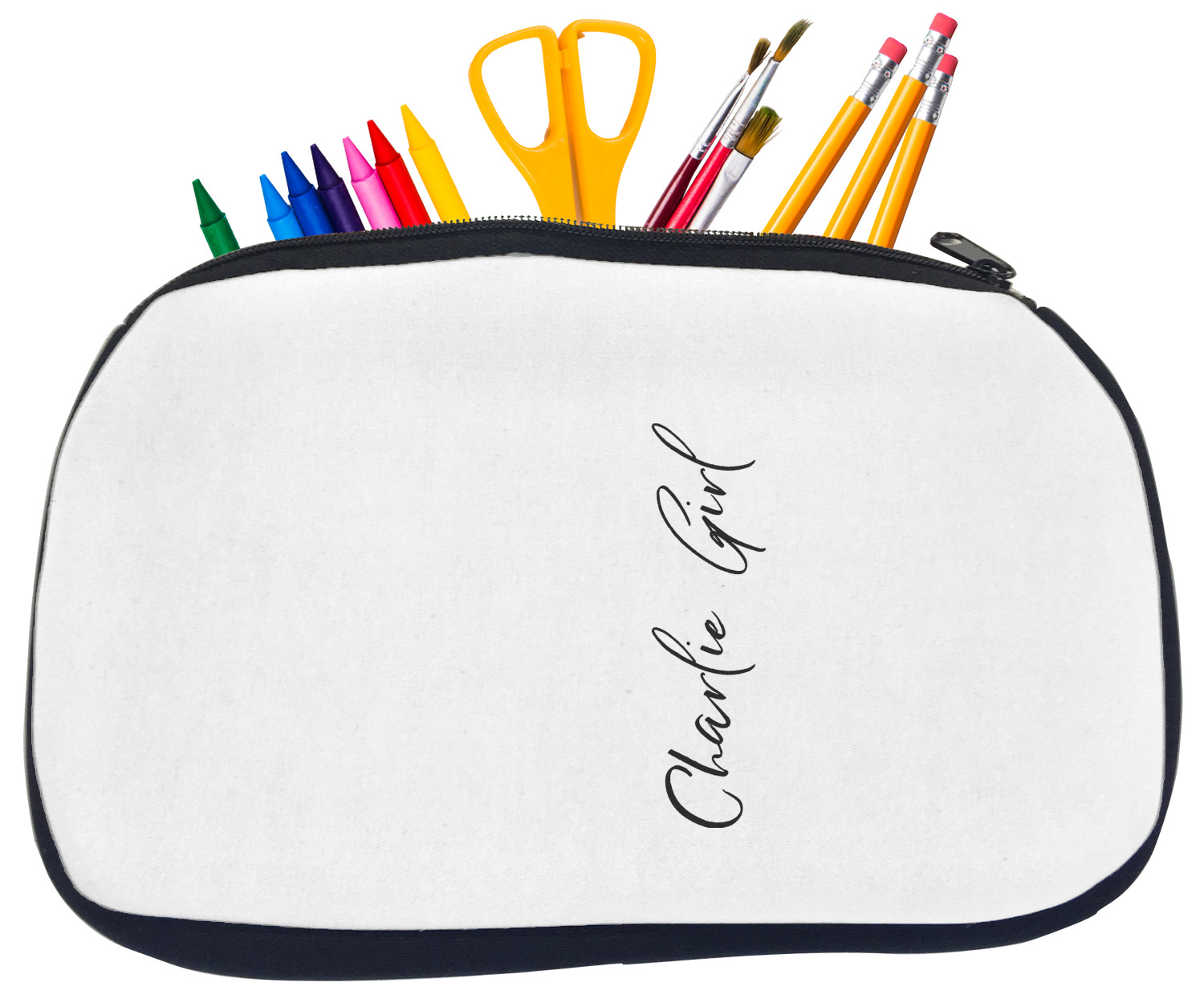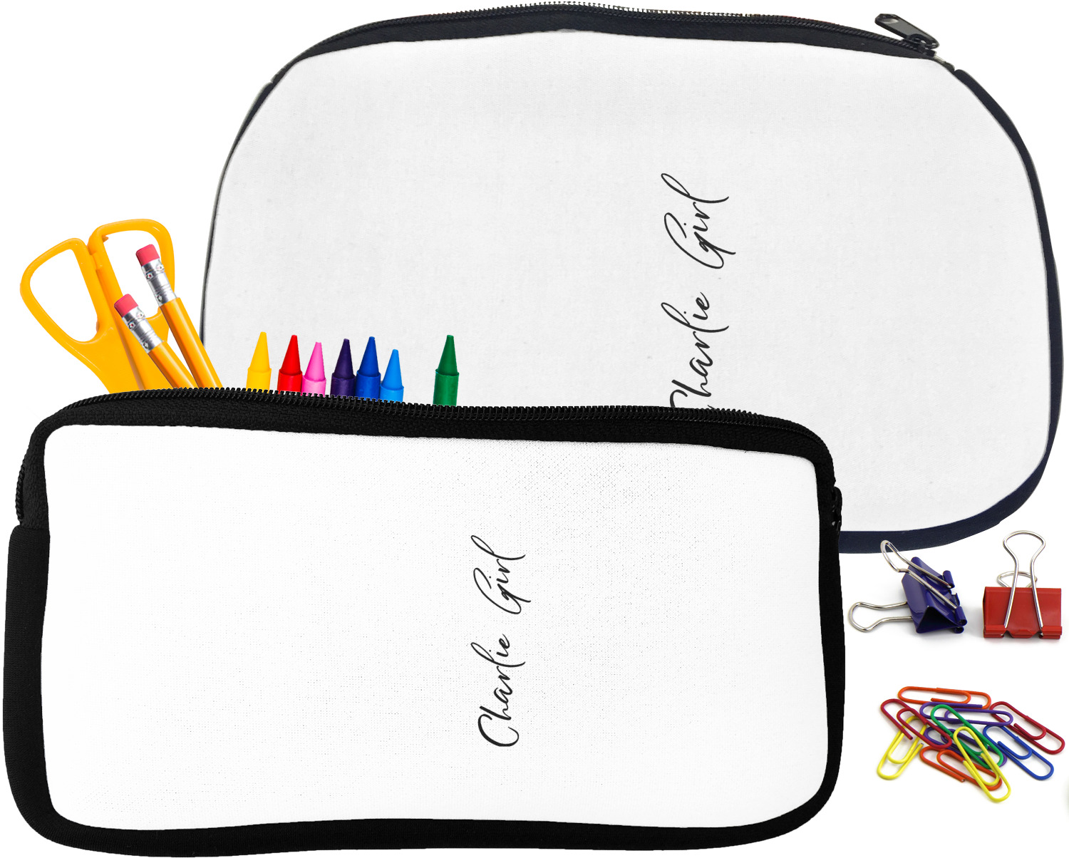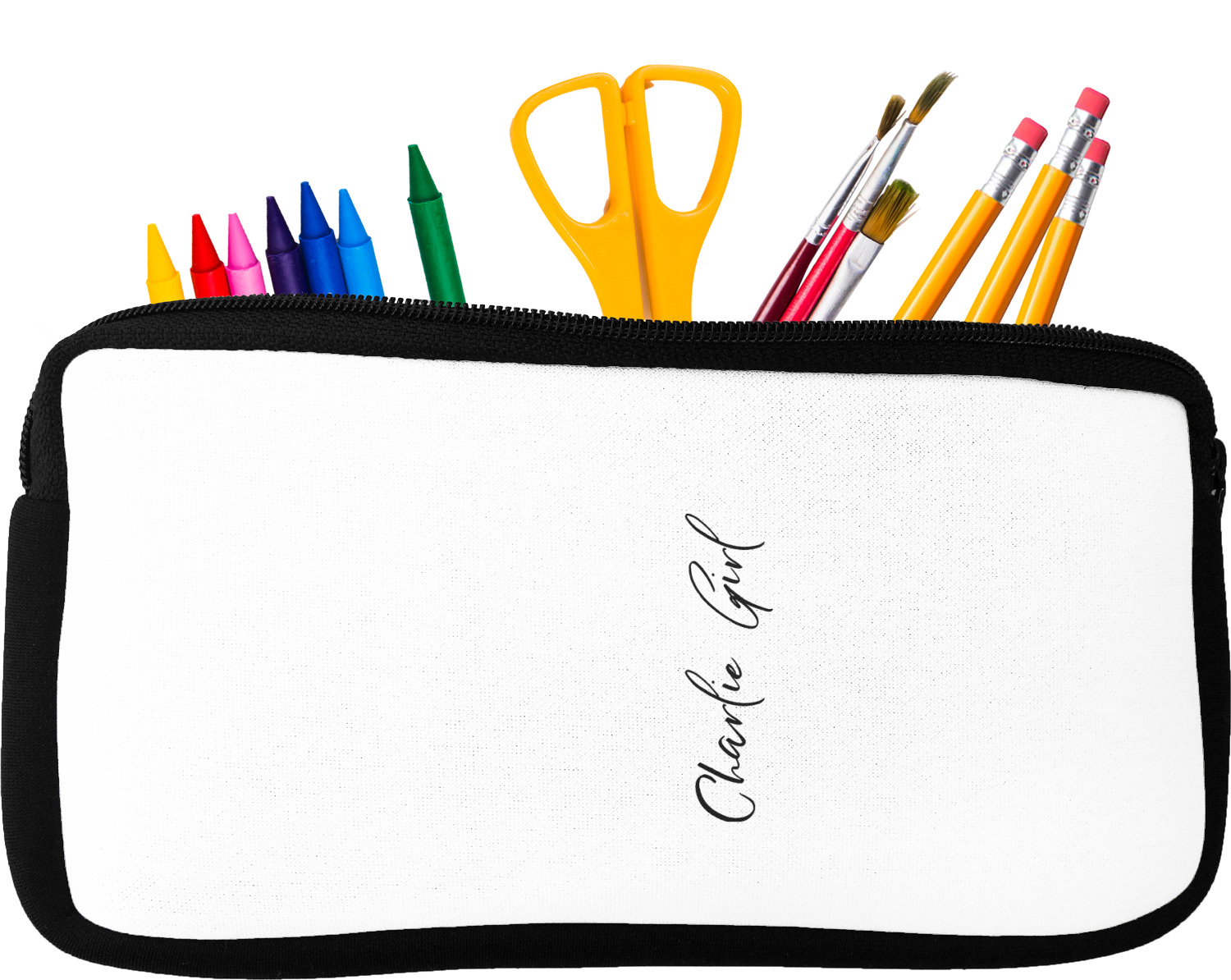 Built from durable neoprene, these pencil pouches, are water resistant, and prevent leaking ink from spilling into your backpack or purse. These custom pencil cases secure with a robust, black zipper. We print your personalized design on the front of this pouch, while the remaining sides a simple black color. These colored pencil cases [880] are sold in two sizes; our smaller version measures at 8.5 by 4.5 inches, while the medium measures at 10.5 by 6.5 inches. The smaller size is more suitable for holding pencils and pens, while our medium size can accommodate pencil sharpeners, scissors, and erasers.