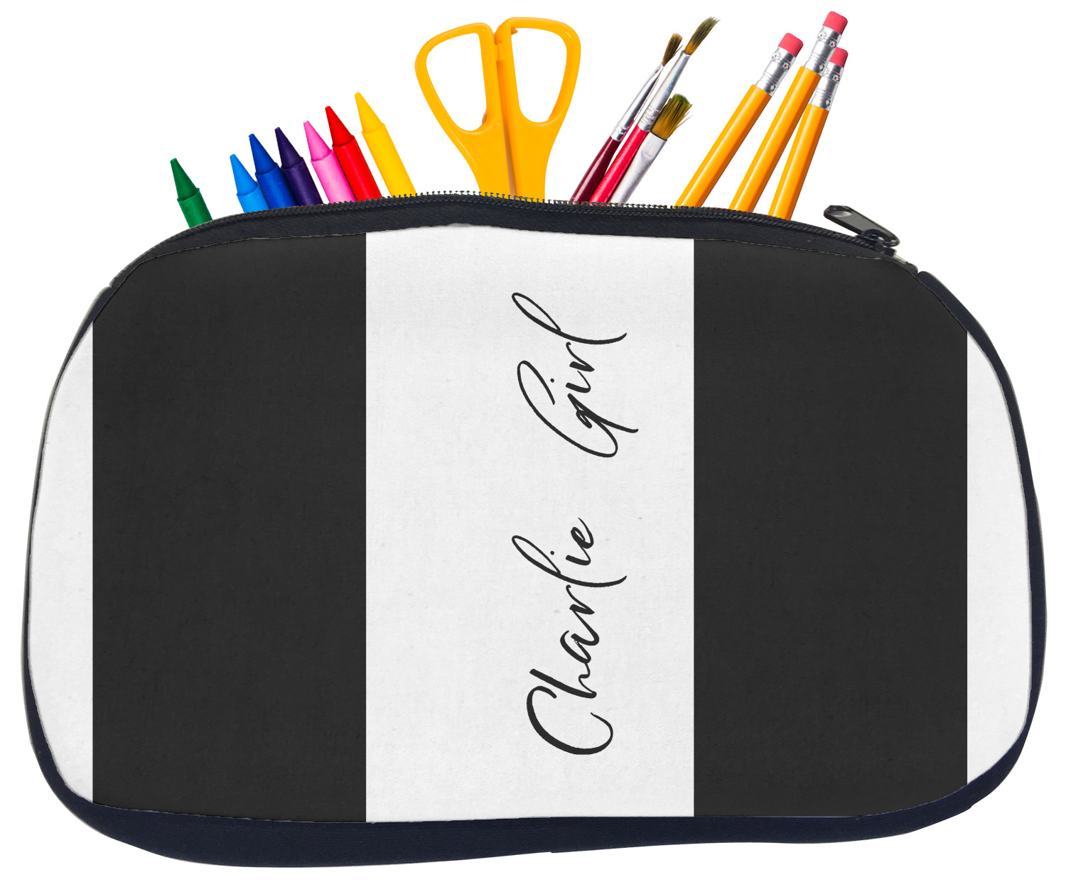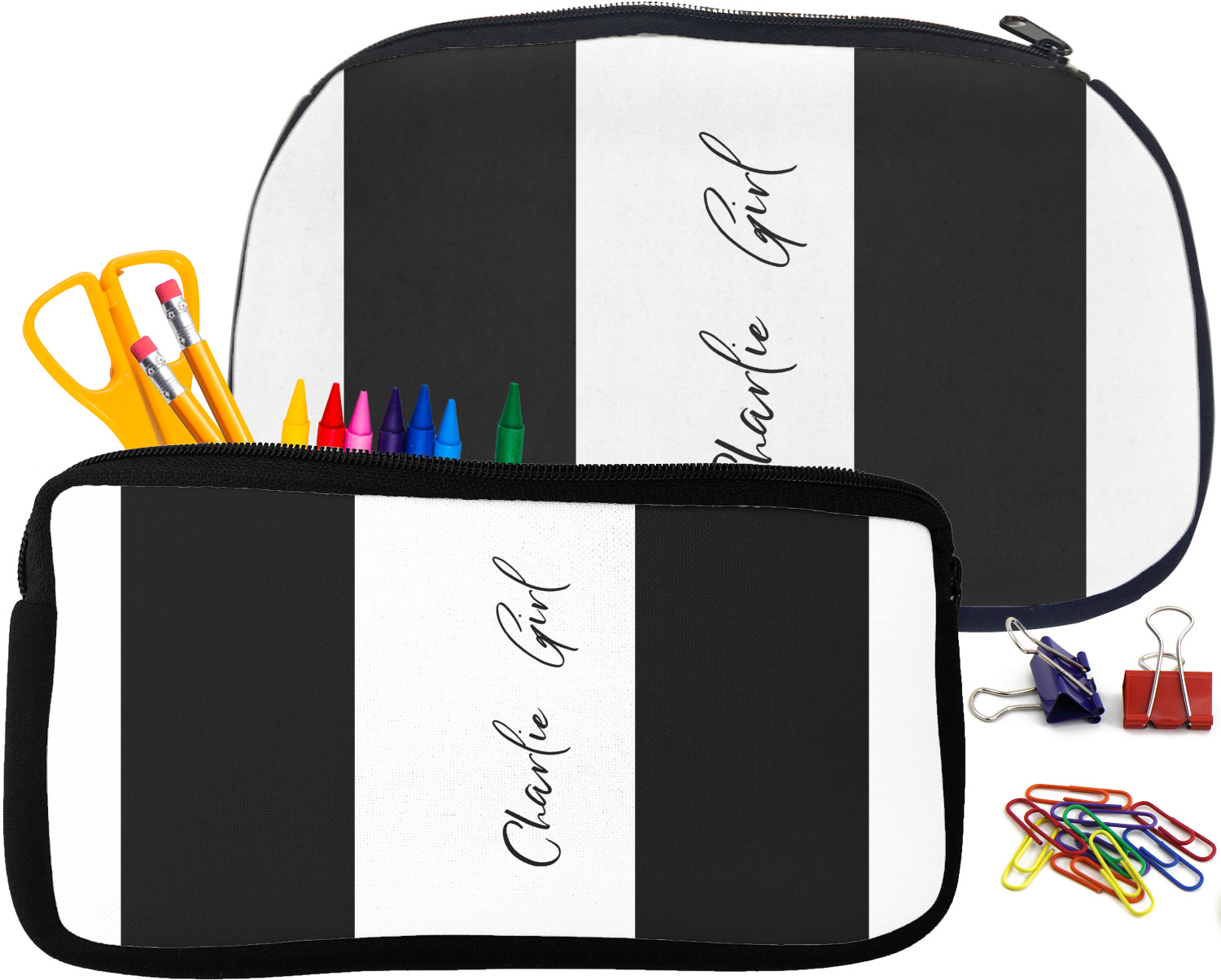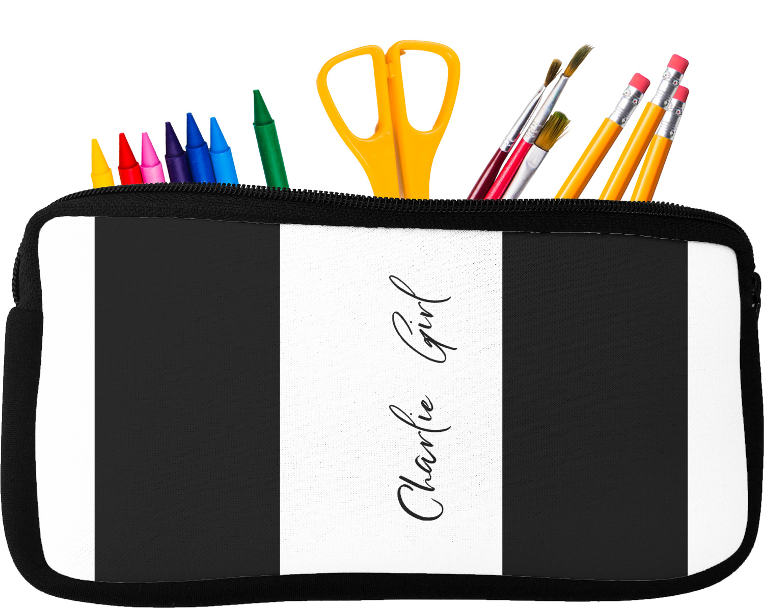 Built from durable neoprene, these pencil pouches, are water resistant, and prevent leaking ink from spilling into your backpack or purse. These custom pencil cases secure with a robust, black zipper. We print your personalized design on the front of this pouch, while the remaining sides a simple black color. These colored pencil cases [880] are sold in two sizes; our smaller version measures at 8.5 by 4.5 inches, while the medium measures at 10.5 by 6.5 inches. The smaller size is more suitable for holding pencils and pens, while our medium size can accommodate pencil sharpeners, scissors, and erasers.
