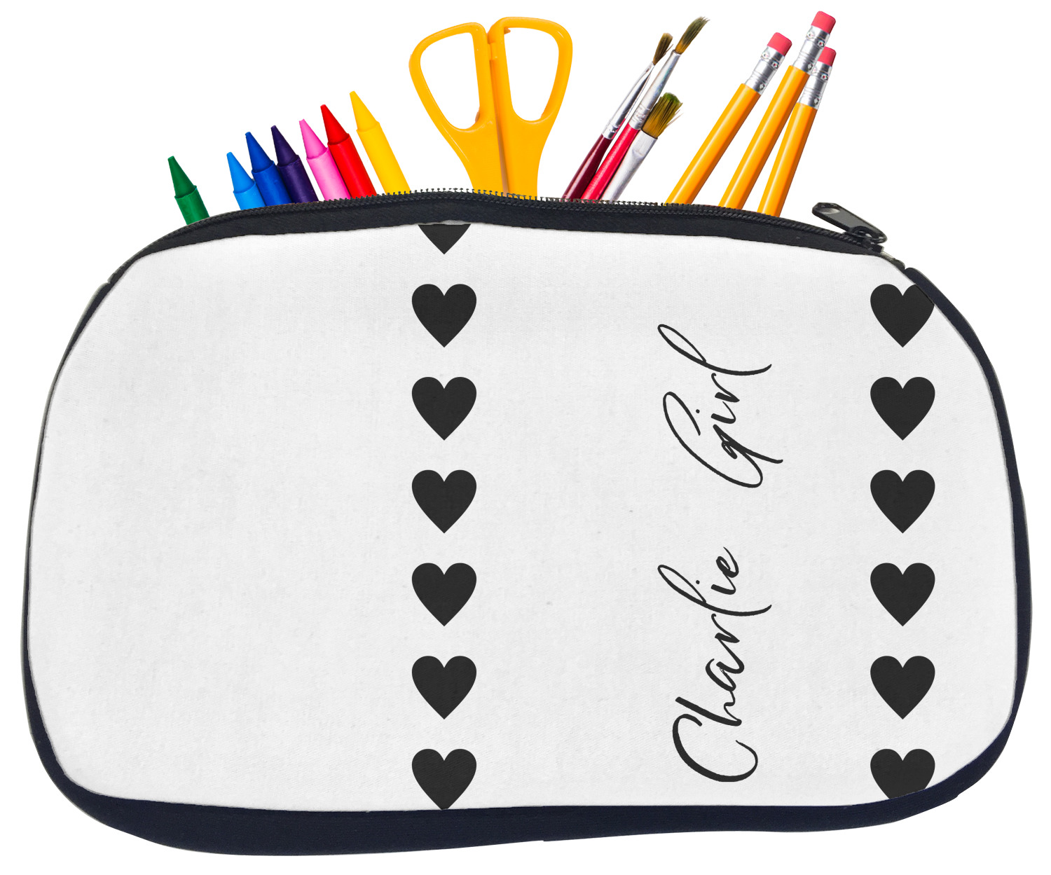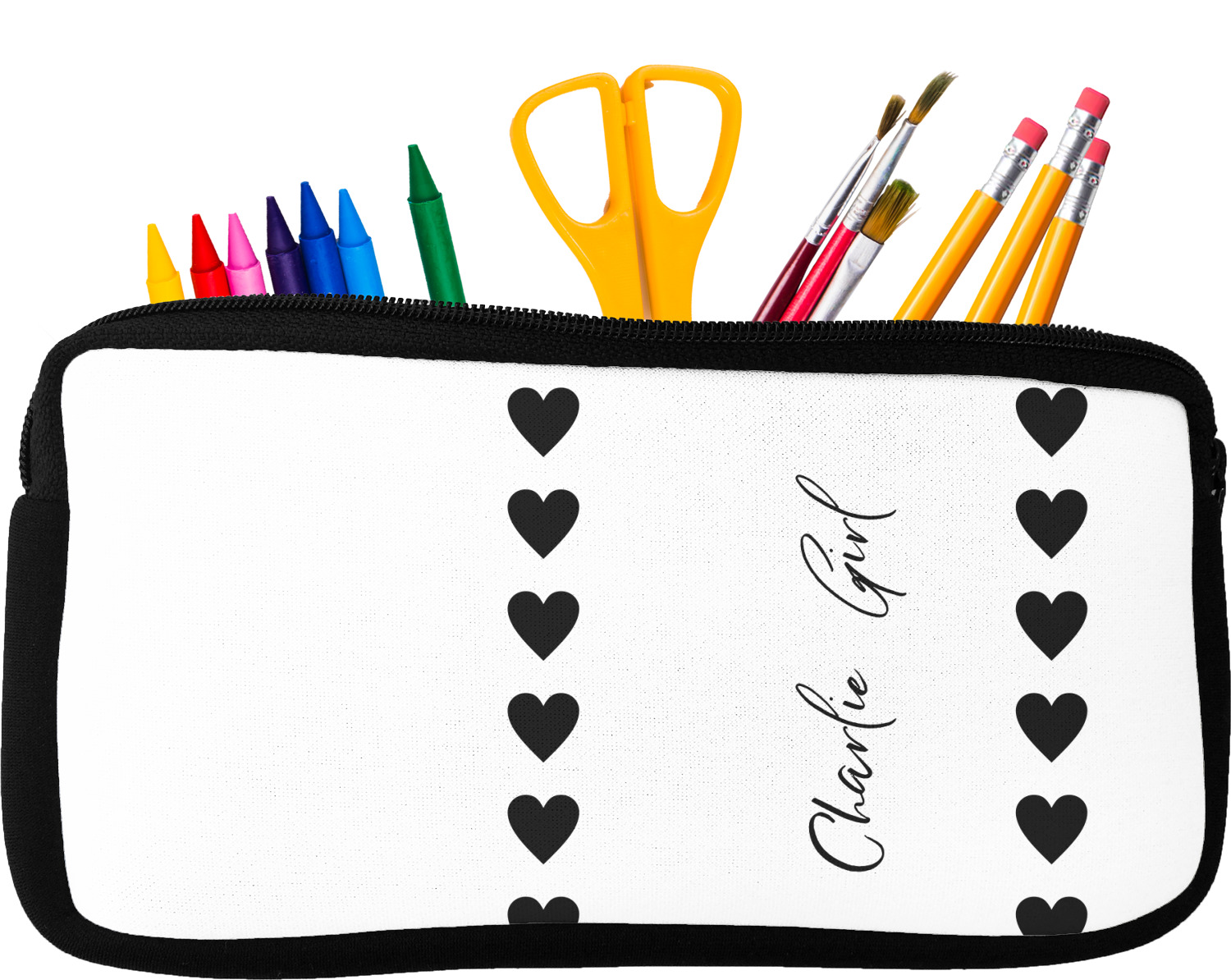 Built from durable neoprene, these pencil pouches, are water resistant, and prevent leaking ink from spilling into your backpack or purse. These custom pencil cases secure with a robust, black zipper. We print your personalized design on the front of this pouch, while the remaining sides a simple black color. These colored pencil cases [880] are sold in two sizes; our smaller version measures at 8.5 by 4.5 inches, while the medium measures at 10.5 by 6.5 inches. The smaller size is more suitable for holding pencils and pens, while our medium size can accommodate pencil sharpeners, scissors, and erasers.