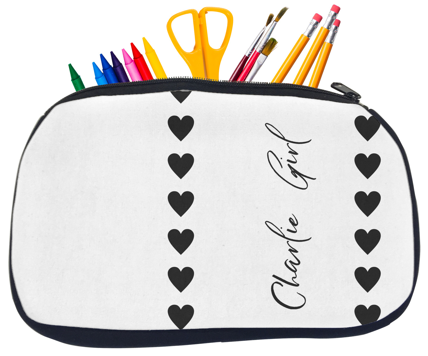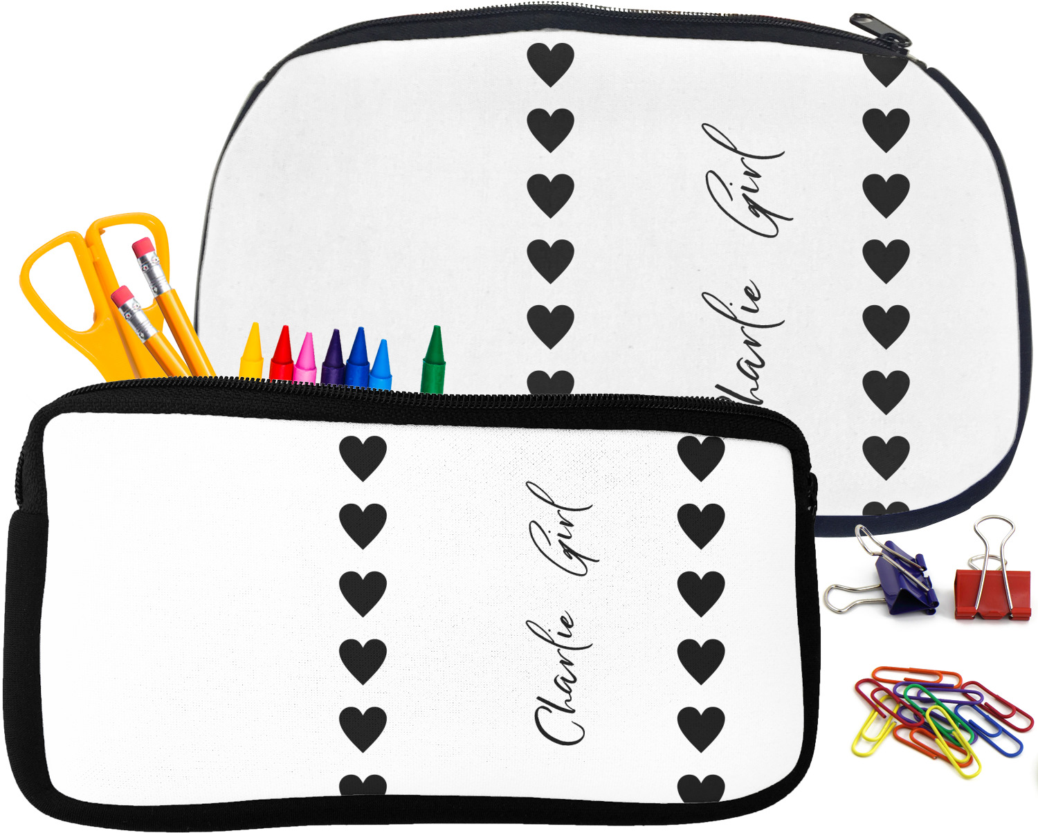 Built from durable neoprene, these pencil pouches, are water resistant, and prevent leaking ink from spilling into your backpack or purse. These custom pencil cases secure with a robust, black zipper. We print your personalized design on the front of this pouch, while the remaining sides a simple black color. These colored pencil cases [880] are sold in two sizes; our smaller version measures at 8.5 by 4.5 inches, while the medium measures at 10.5 by 6.5 inches. The smaller size is more suitable for holding pencils and pens, while our medium size can accommodate pencil sharpeners, scissors, and erasers.