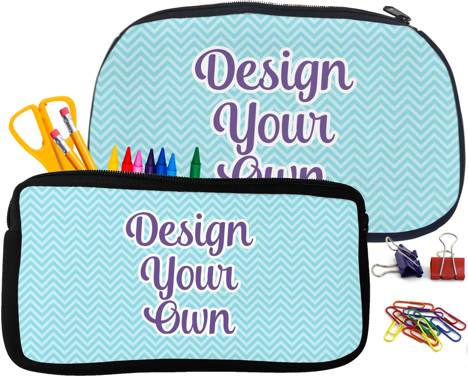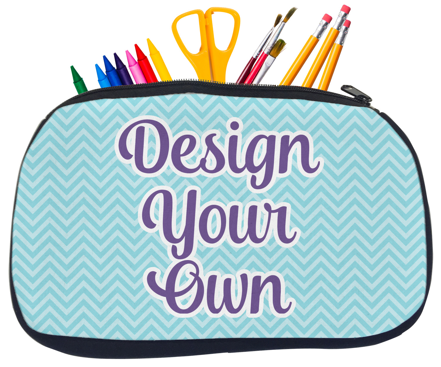 Built from durable neoprene, these pencil pouches, are water resistant, and prevent leaking ink from spilling into your backpack or purse. These custom pencil cases secure with a robust, black zipper. We print your personalized design on the front of this pouch, while the remaining sides a simple black color. These colored pencil cases [880] are sold in two sizes; our smaller version measures at 8.5 by 4.5 inches, while the medium measures at 10.5 by 6.5 inches. The smaller size is more suitable for holding pencils and pens, while our medium size can accommodate pencil sharpeners, scissors, and erasers.