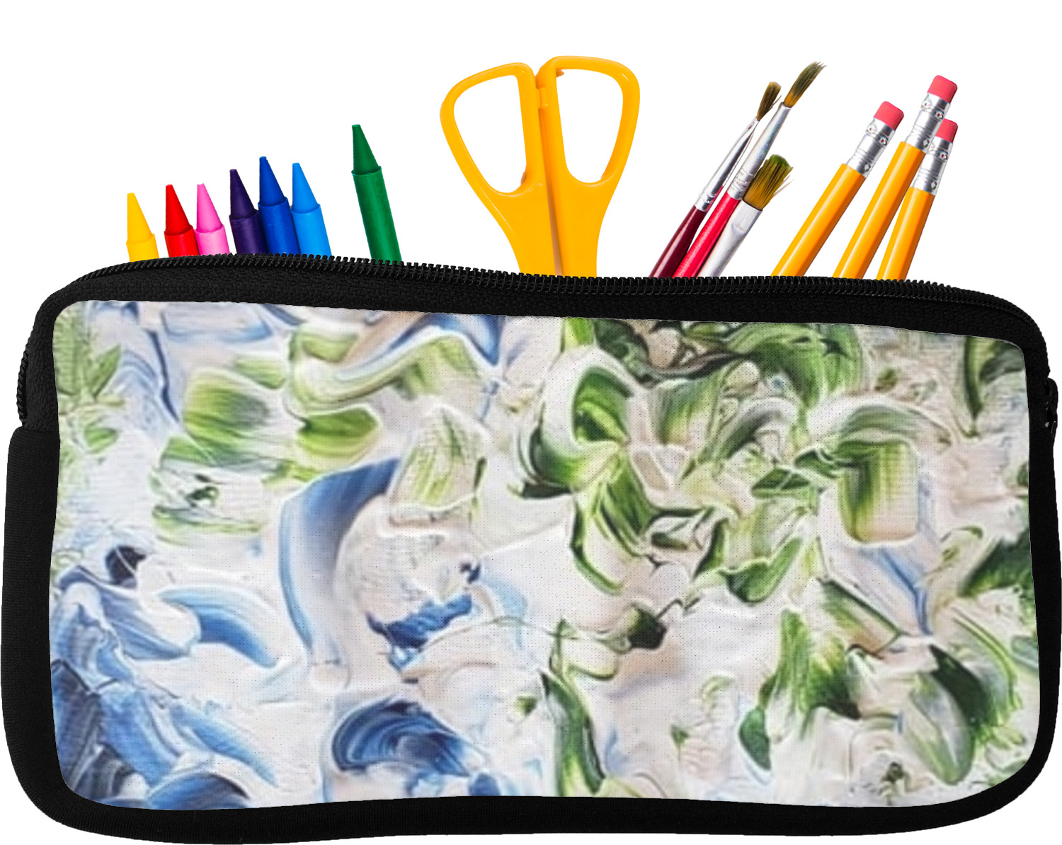 Built from durable neoprene, these pencil pouches, are water resistant, and prevent leaking ink from spilling into your backpack or purse. These custom pencil cases secure with a robust, black zipper. We print your personalized design on the front of this pouch, while the remaining sides a simple black color. These colored pencil cases [880] are sold in two sizes; our smaller version measures at 8.5 by 4.5 inches, while the medium measures at 10.5 by 6.5 inches. The smaller size is more suitable for holding pencils and pens, while our medium size can accommodate pencil sharpeners, scissors, and erasers.