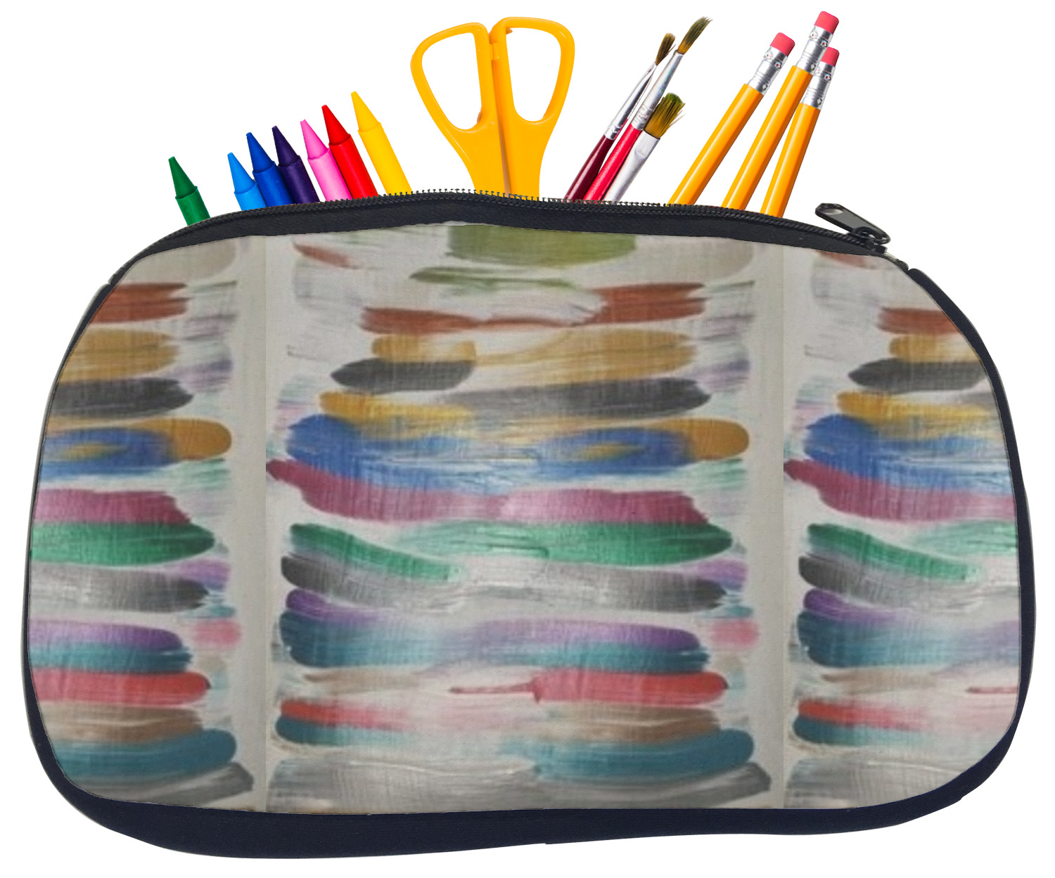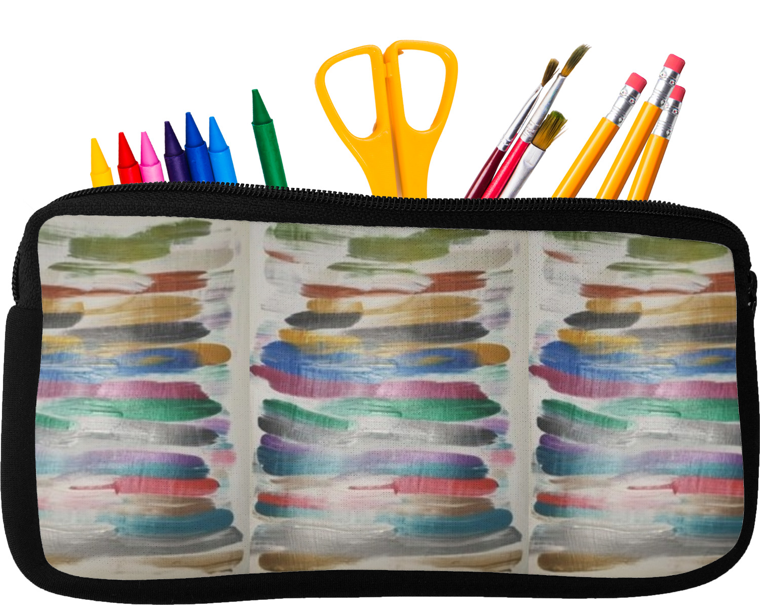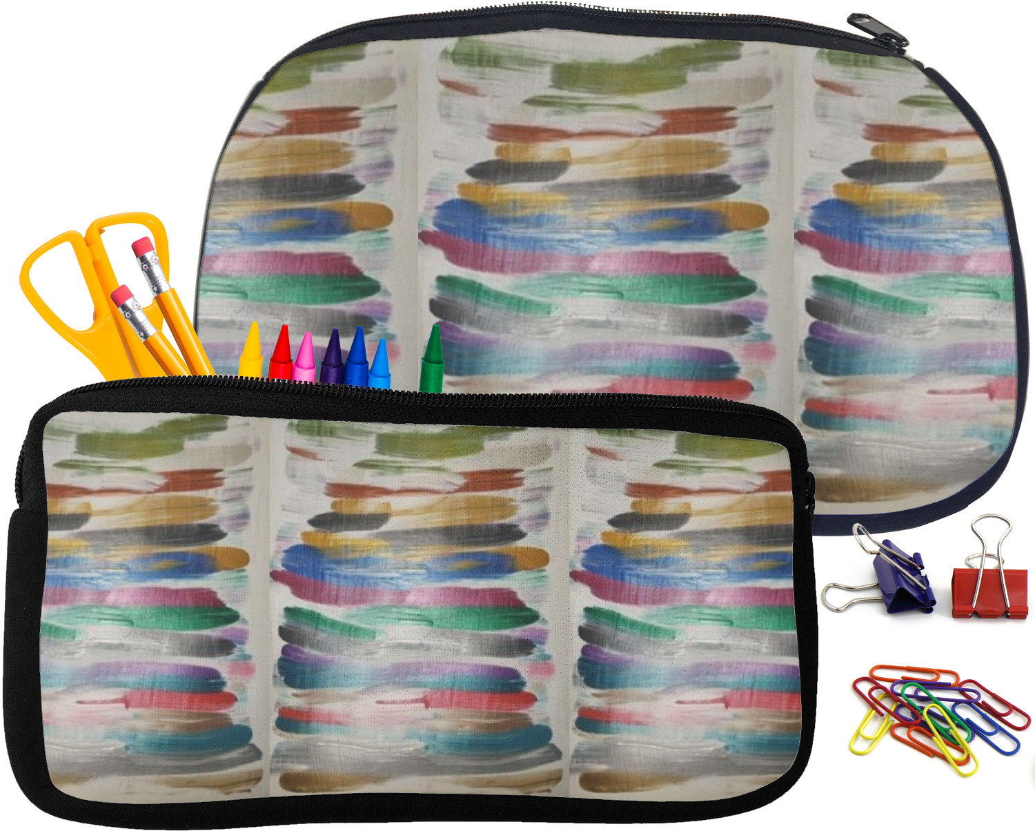 Built from durable neoprene, these pencil pouches, are water resistant, and prevent leaking ink from spilling into your backpack or purse. These custom pencil cases secure with a robust, black zipper. We print your personalized design on the front of this pouch, while the remaining sides a simple black color. These colored pencil cases [880] are sold in two sizes; our smaller version measures at 8.5 by 4.5 inches, while the medium measures at 10.5 by 6.5 inches. The smaller size is more suitable for holding pencils and pens, while our medium size can accommodate pencil sharpeners, scissors, and erasers.