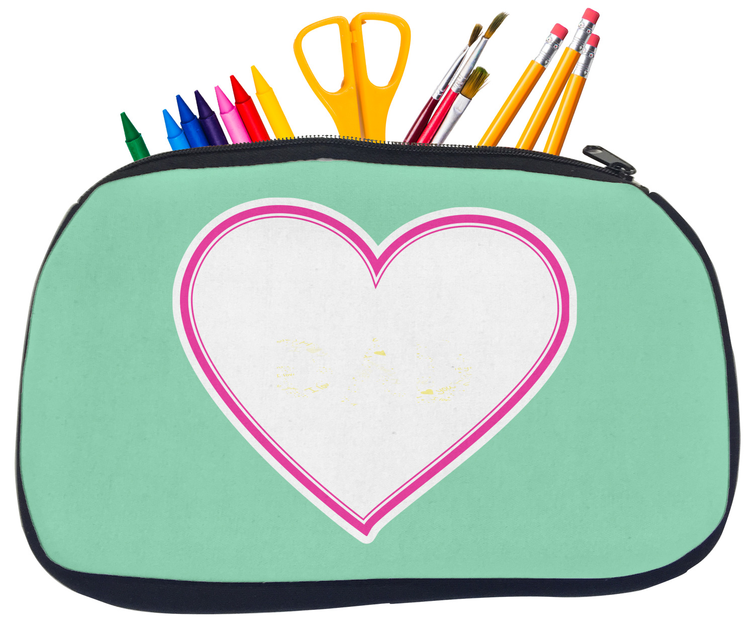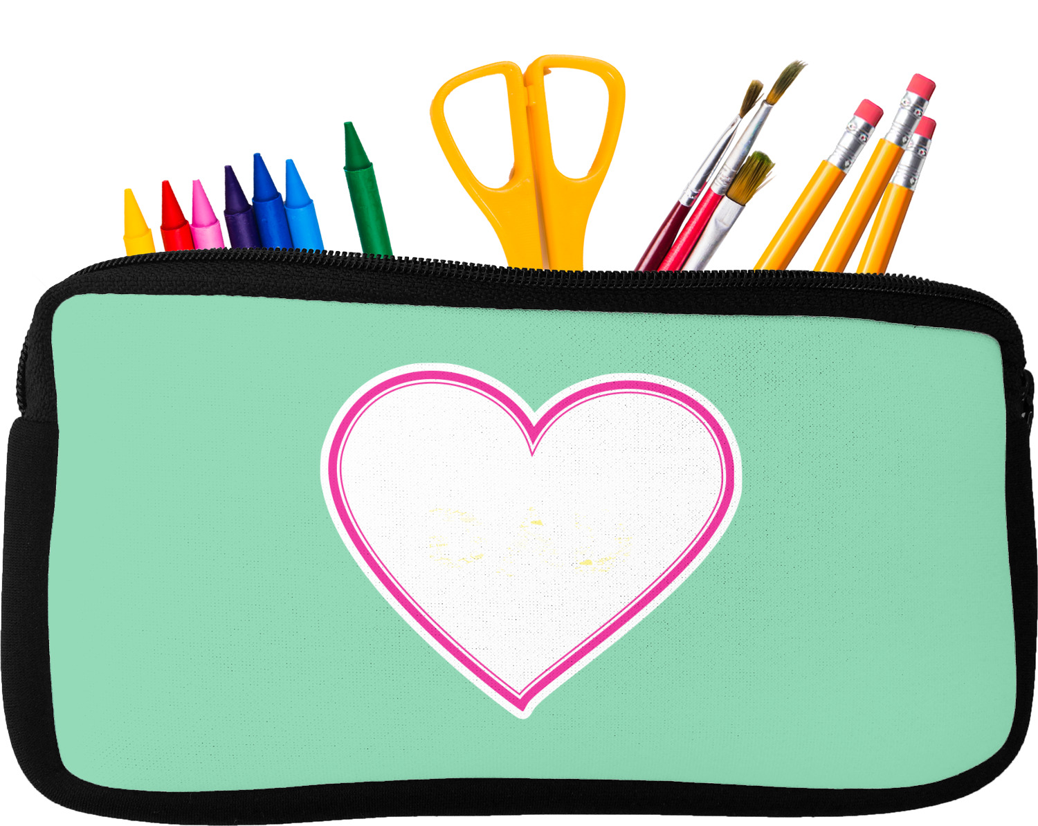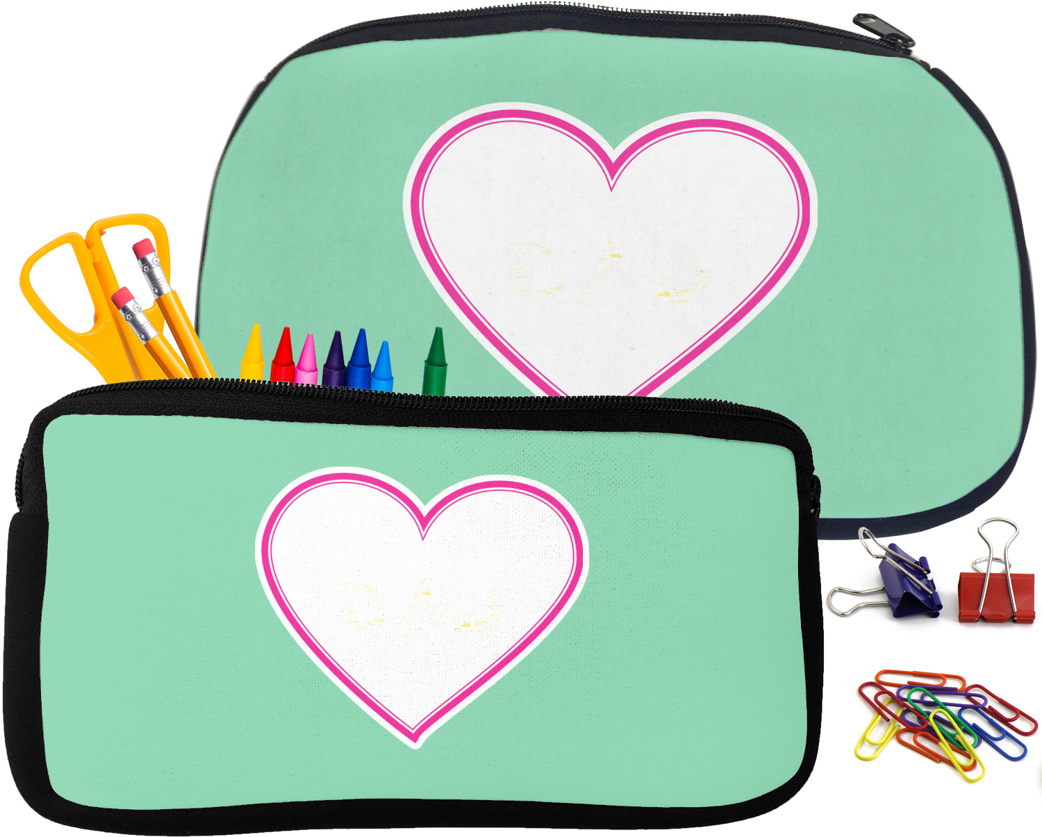 Built from durable neoprene, these pencil pouches, are water resistant, and prevent leaking ink from spilling into your backpack or purse. These custom pencil cases secure with a robust, black zipper. We print your personalized design on the front of this pouch, while the remaining sides a simple black color. These colored pencil cases [880] are sold in two sizes; our smaller version measures at 8.5 by 4.5 inches, while the medium measures at 10.5 by 6.5 inches. The smaller size is more suitable for holding pencils and pens, while our medium size can accommodate pencil sharpeners, scissors, and erasers.