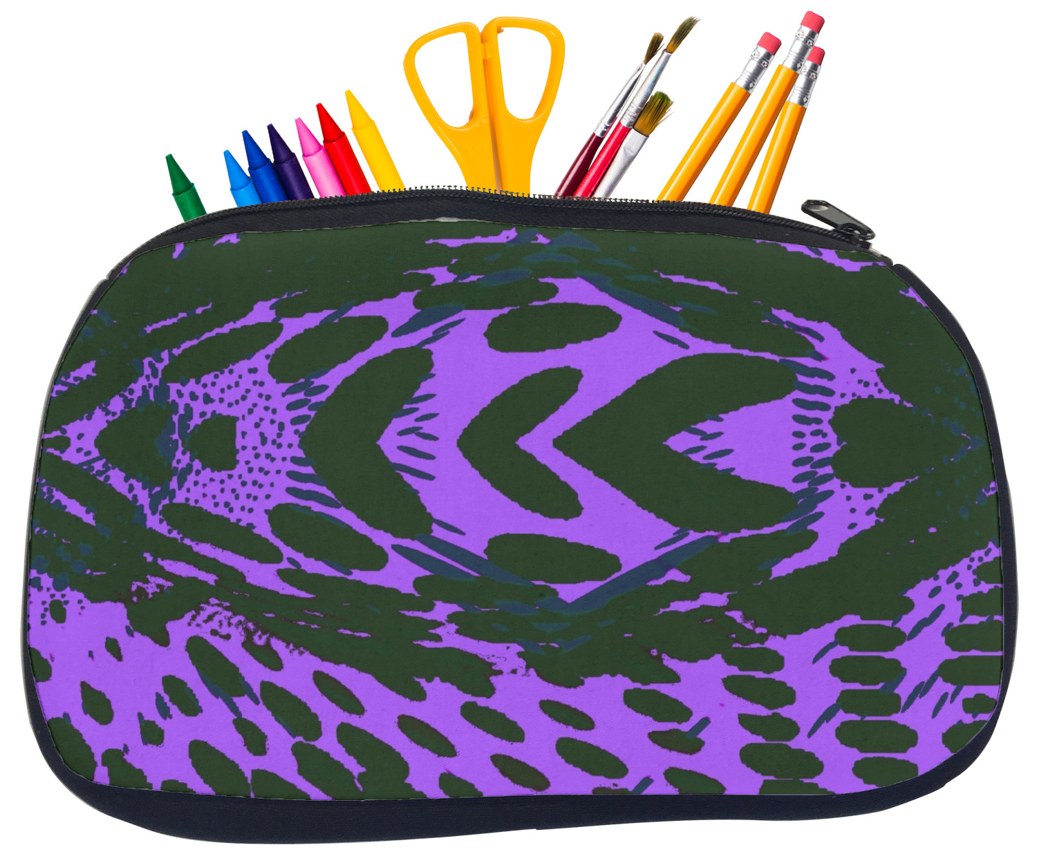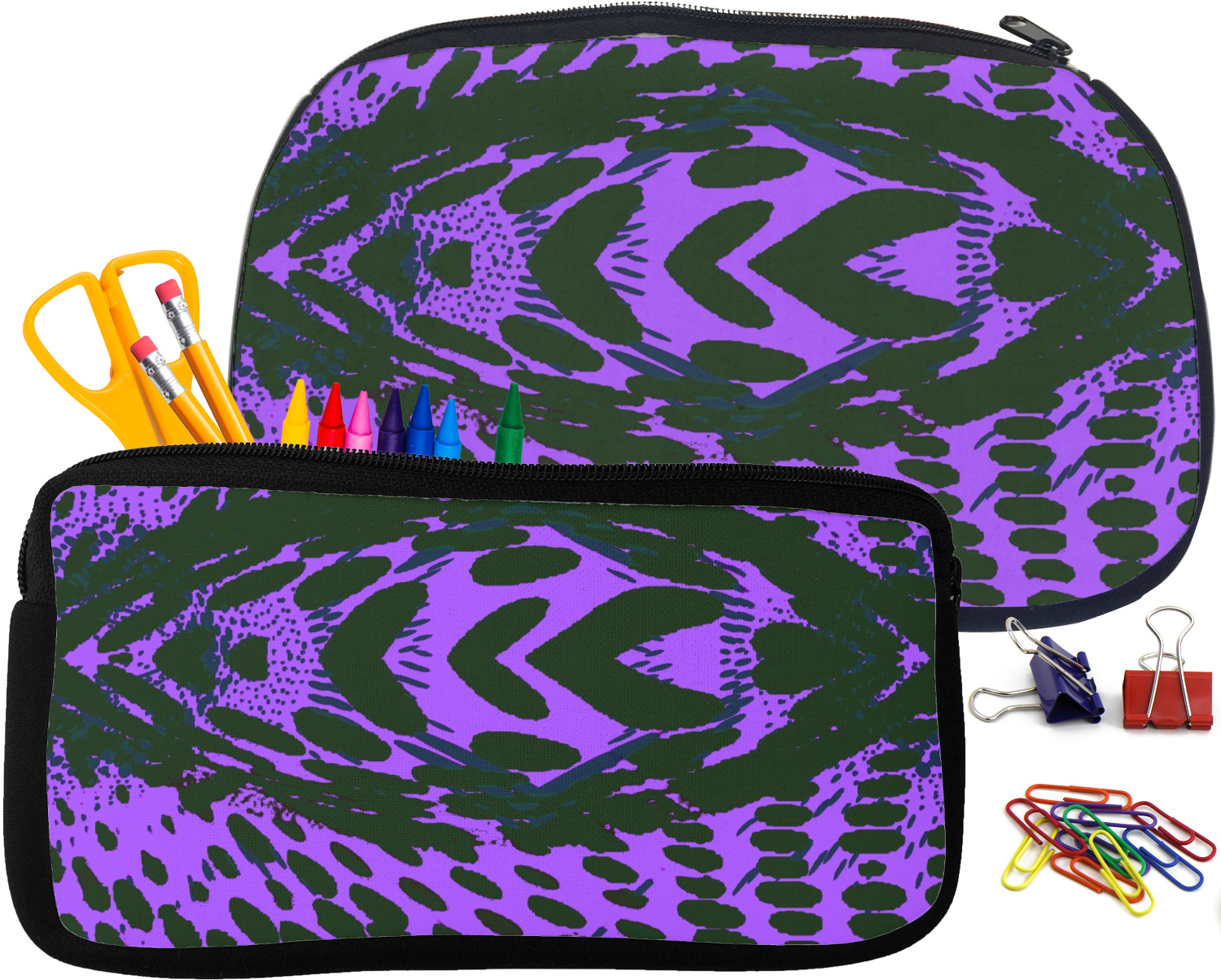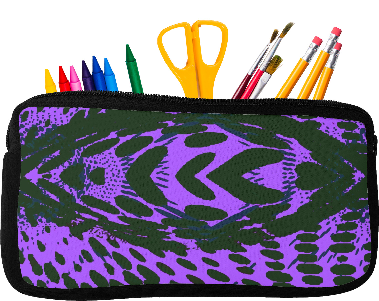 Built from durable neoprene, these pencil pouches, are water resistant, and prevent leaking ink from spilling into your backpack or purse. These custom pencil cases secure with a robust, black zipper. We print your personalized design on the front of this pouch, while the remaining sides a simple black color. These colored pencil cases [880] are sold in two sizes; our smaller version measures at 8.5 by 4.5 inches, while the medium measures at 10.5 by 6.5 inches. The smaller size is more suitable for holding pencils and pens, while our medium size can accommodate pencil sharpeners, scissors, and erasers.