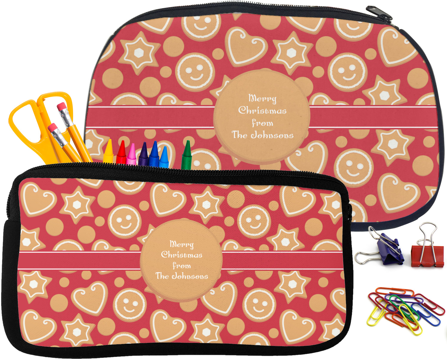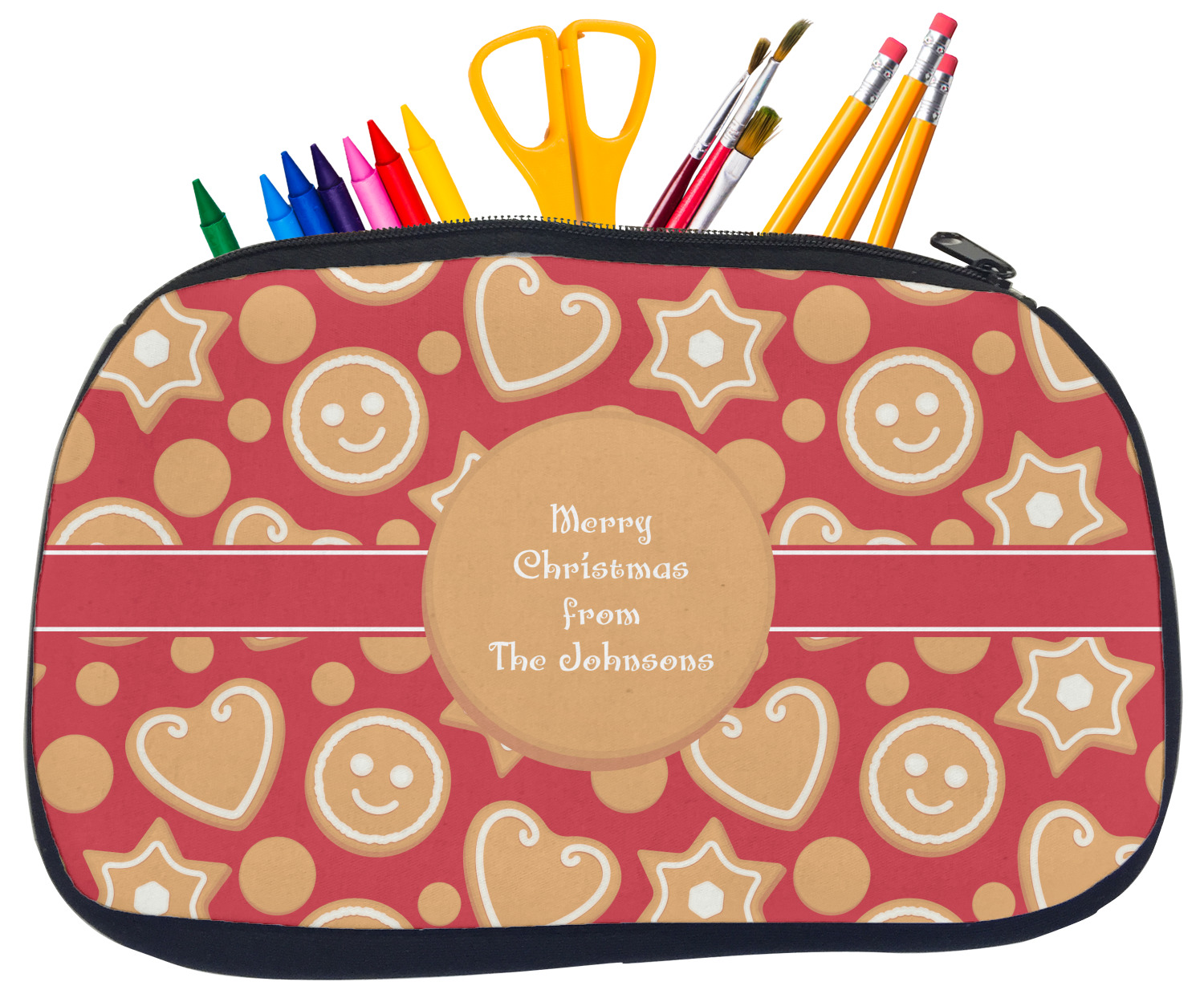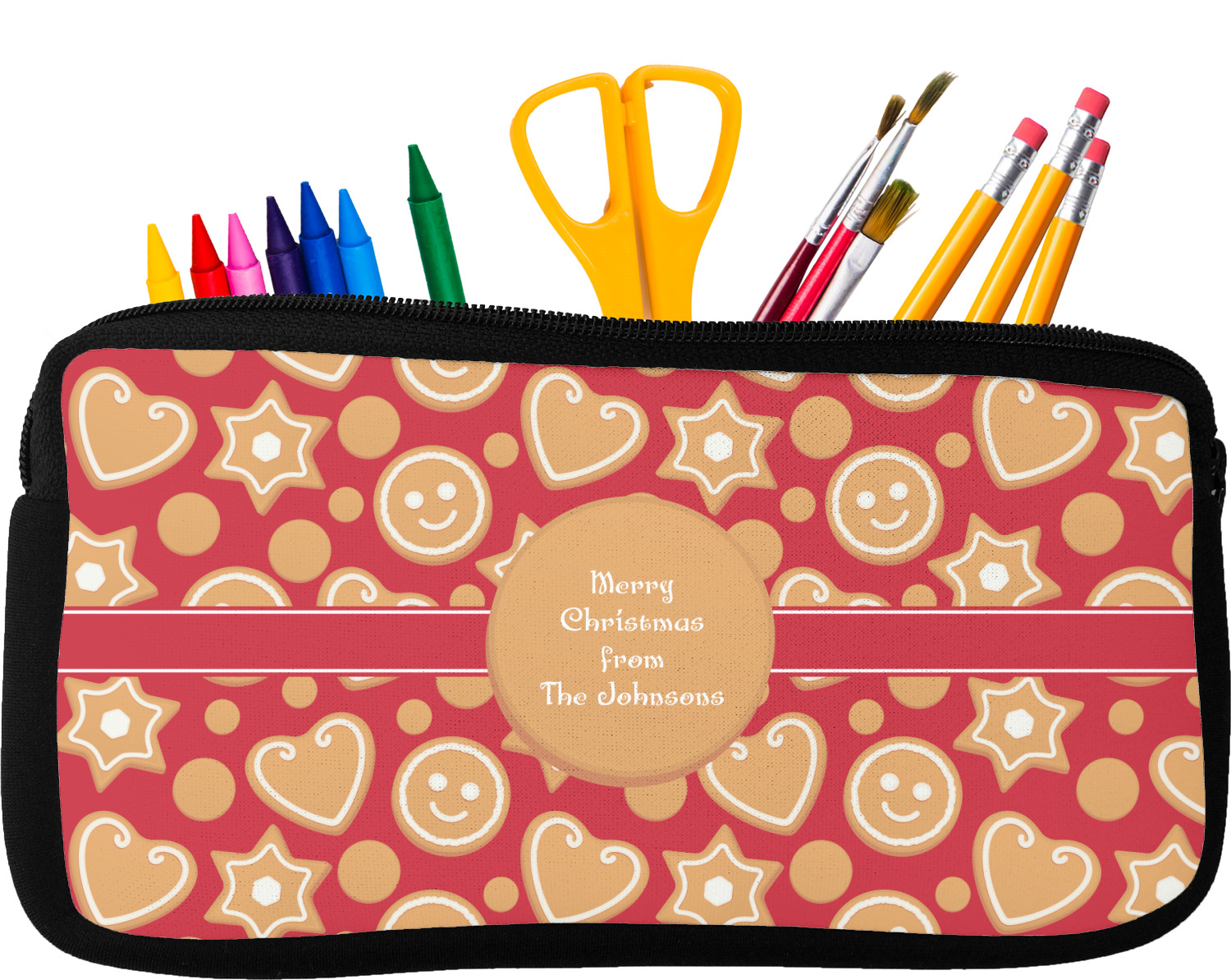 Built from durable neoprene, these pencil pouches, are water resistant, and prevent leaking ink from spilling into your backpack or purse. These custom pencil cases secure with a robust, black zipper. We print your personalized design on the front of this pouch, while the remaining sides a simple black color. These colored pencil cases [880] are sold in two sizes; our smaller version measures at 8.5 by 4.5 inches, while the medium measures at 10.5 by 6.5 inches. The smaller size is more suitable for holding pencils and pens, while our medium size can accommodate pencil sharpeners, scissors, and erasers.