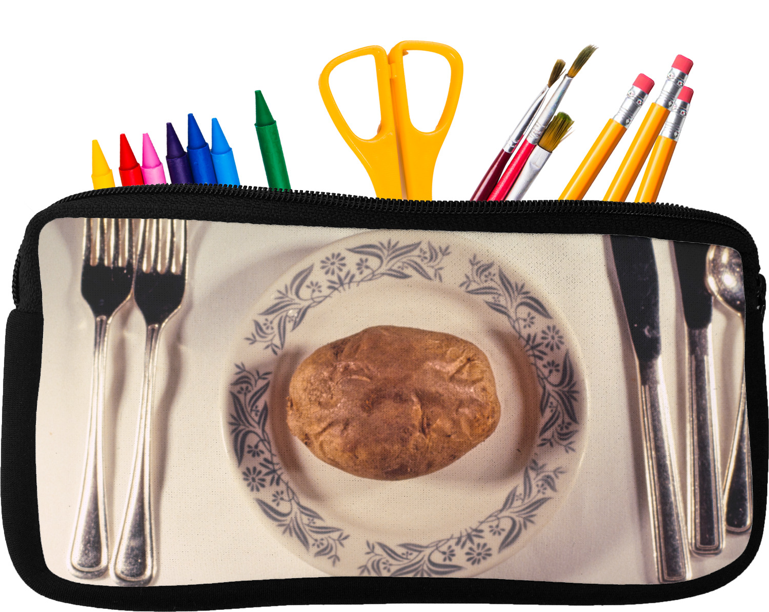Built from durable neoprene, these pencil pouches, are water resistant, and prevent leaking ink from spilling into your backpack or purse. These custom pencil cases secure with a robust, black zipper. We print your personalized design on the front of this pouch, while the remaining sides a simple black color. These colored pencil cases [880] are sold in two sizes; our smaller version measures at 8.5 by 4.5 inches, while the medium measures at 10.5 by 6.5 inches. The smaller size is more suitable for holding pencils and pens, while our medium size can accommodate pencil sharpeners, scissors, and erasers.