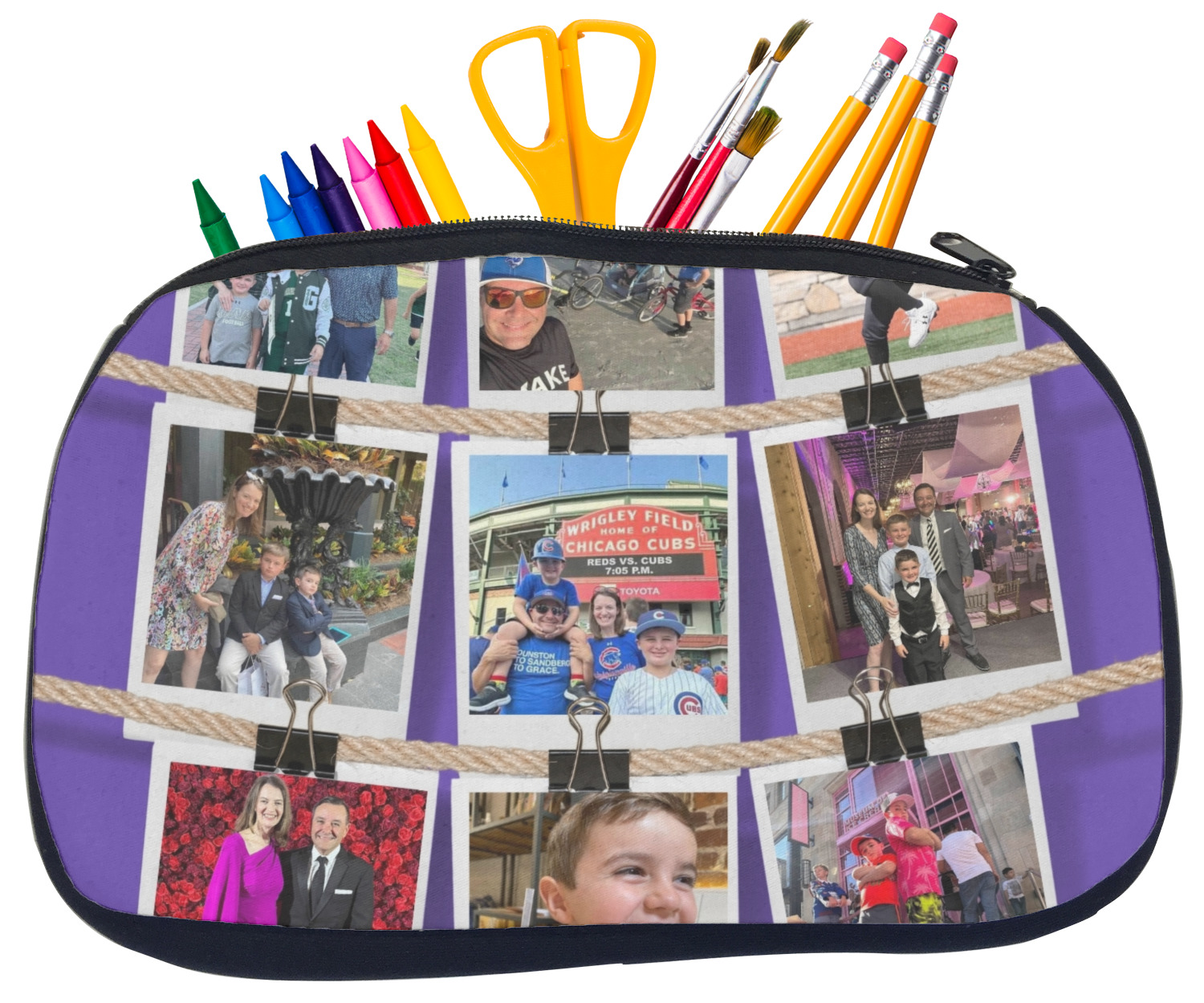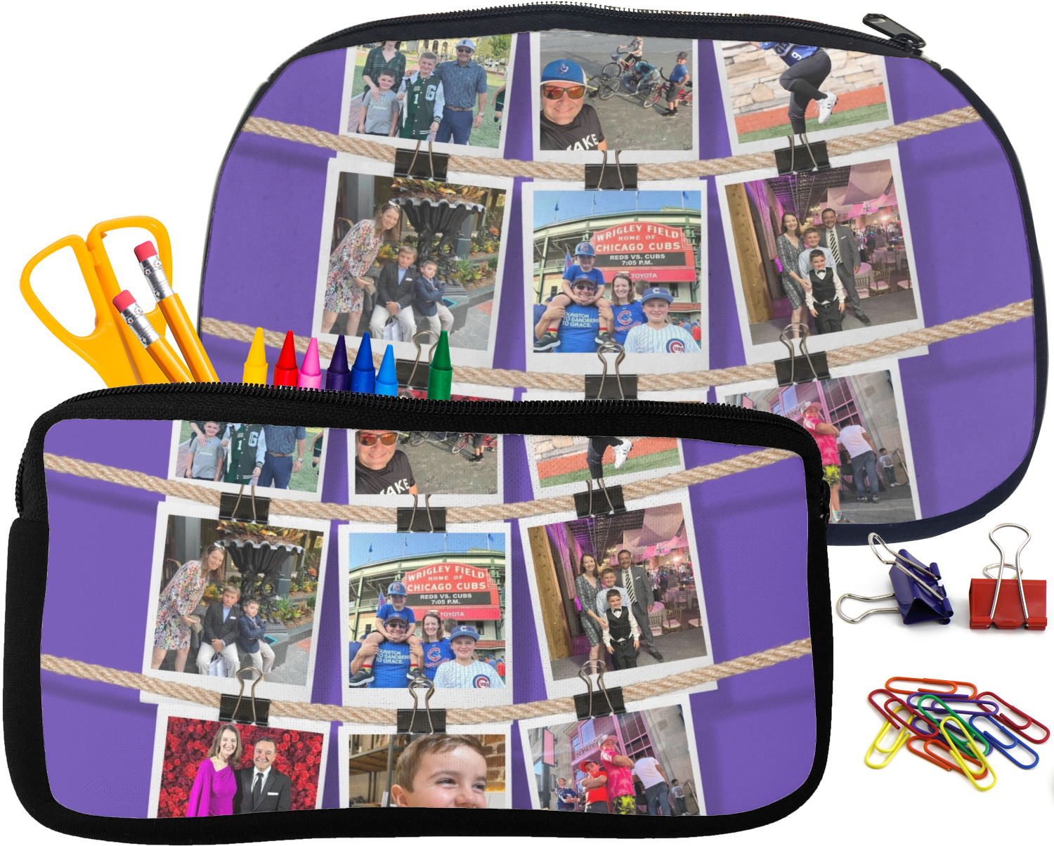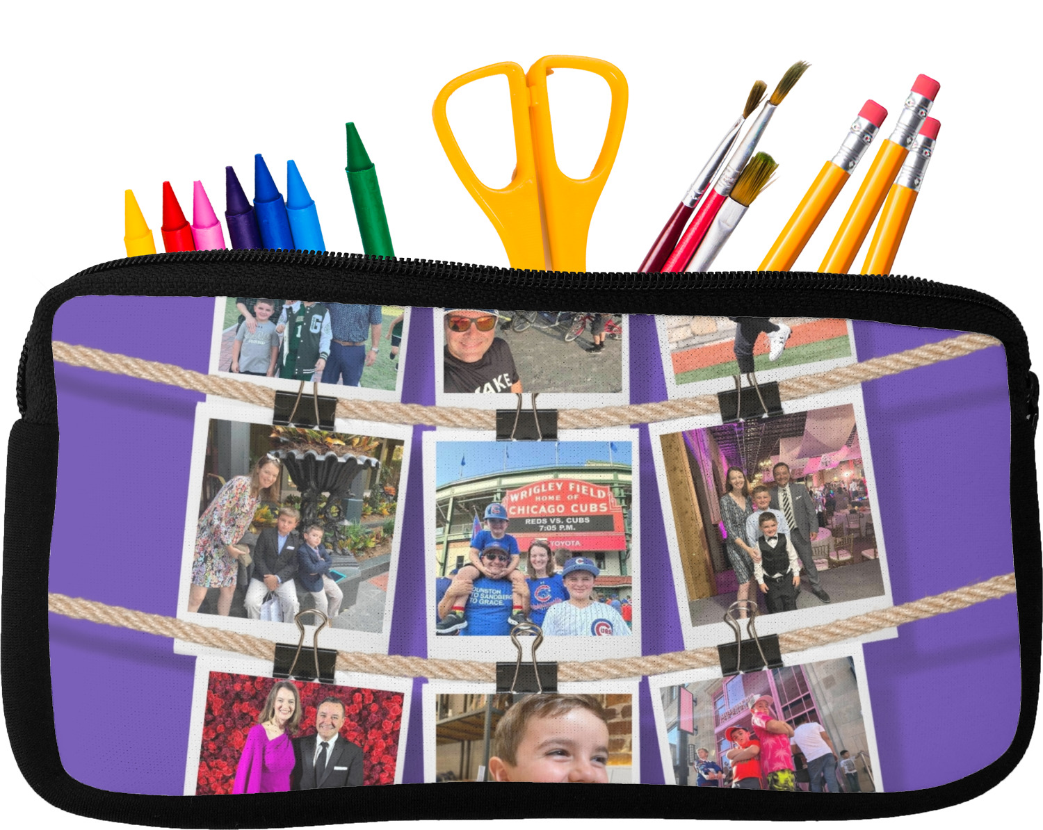 Built from durable neoprene, these pencil pouches, are water resistant, and prevent leaking ink from spilling into your backpack or purse. These custom pencil cases secure with a robust, black zipper. We print your personalized design on the front of this pouch, while the remaining sides a simple black color. These colored pencil cases [880] are sold in two sizes; our smaller version measures at 8.5 by 4.5 inches, while the medium measures at 10.5 by 6.5 inches. The smaller size is more suitable for holding pencils and pens, while our medium size can accommodate pencil sharpeners, scissors, and erasers.