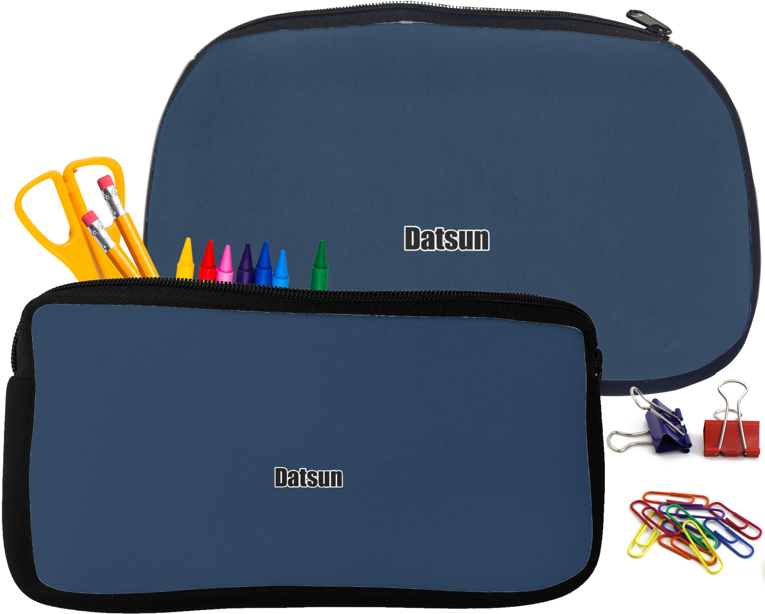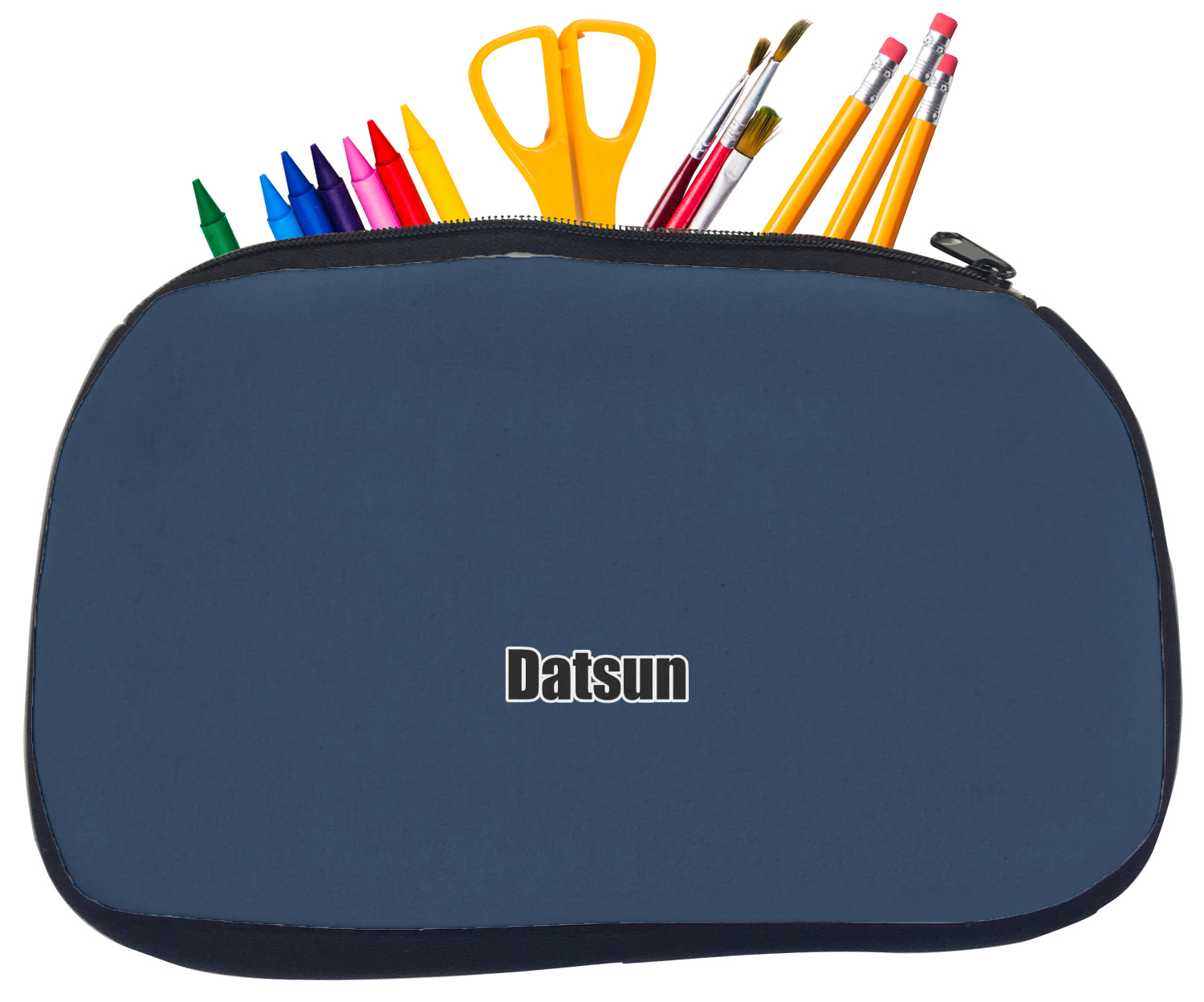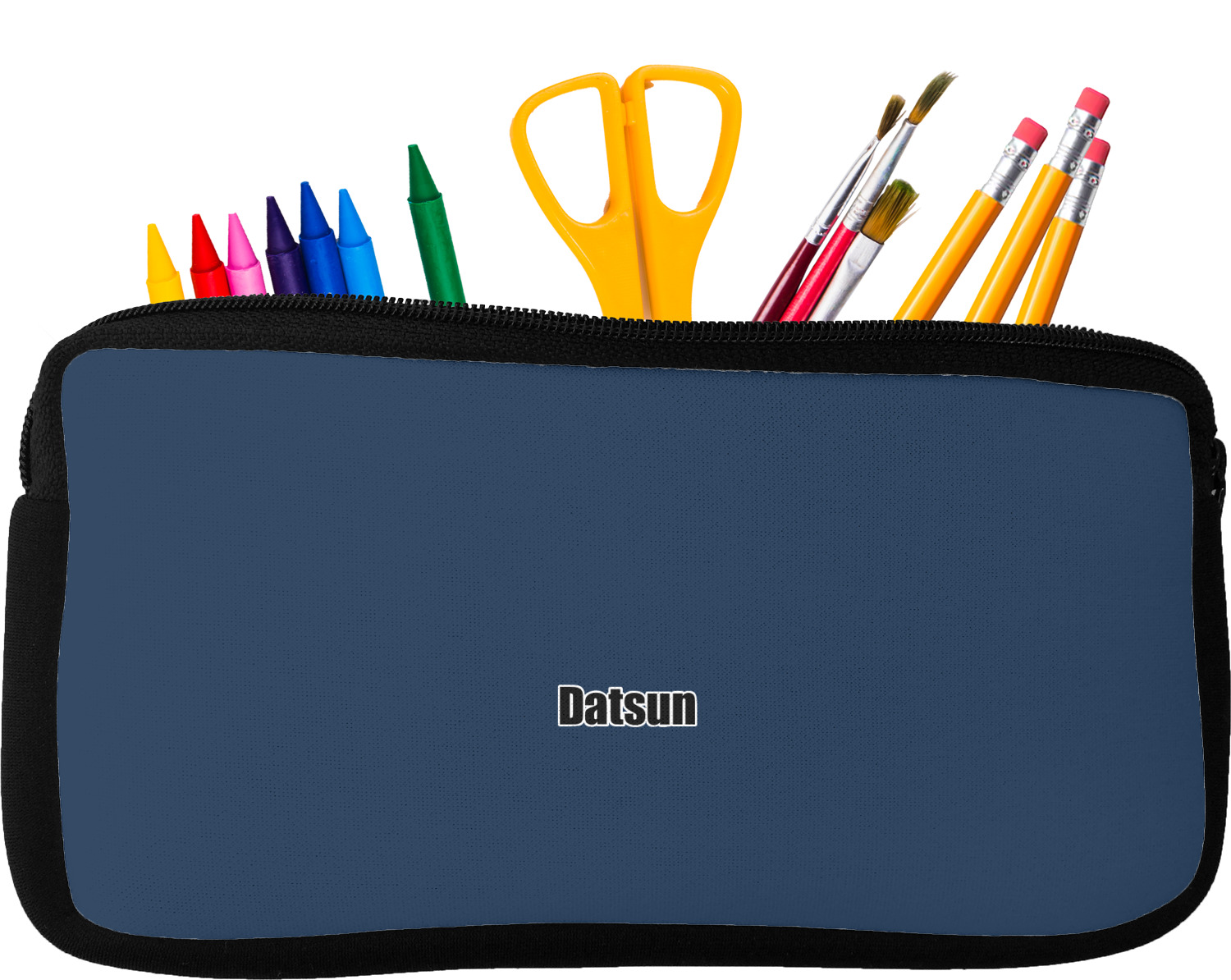 Built from durable neoprene, these pencil pouches, are water resistant, and prevent leaking ink from spilling into your backpack or purse. These custom pencil cases secure with a robust, black zipper. We print your personalized design on the front of this pouch, while the remaining sides a simple black color. These colored pencil cases [880] are sold in two sizes; our smaller version measures at 8.5 by 4.5 inches, while the medium measures at 10.5 by 6.5 inches. The smaller size is more suitable for holding pencils and pens, while our medium size can accommodate pencil sharpeners, scissors, and erasers.
